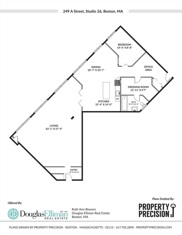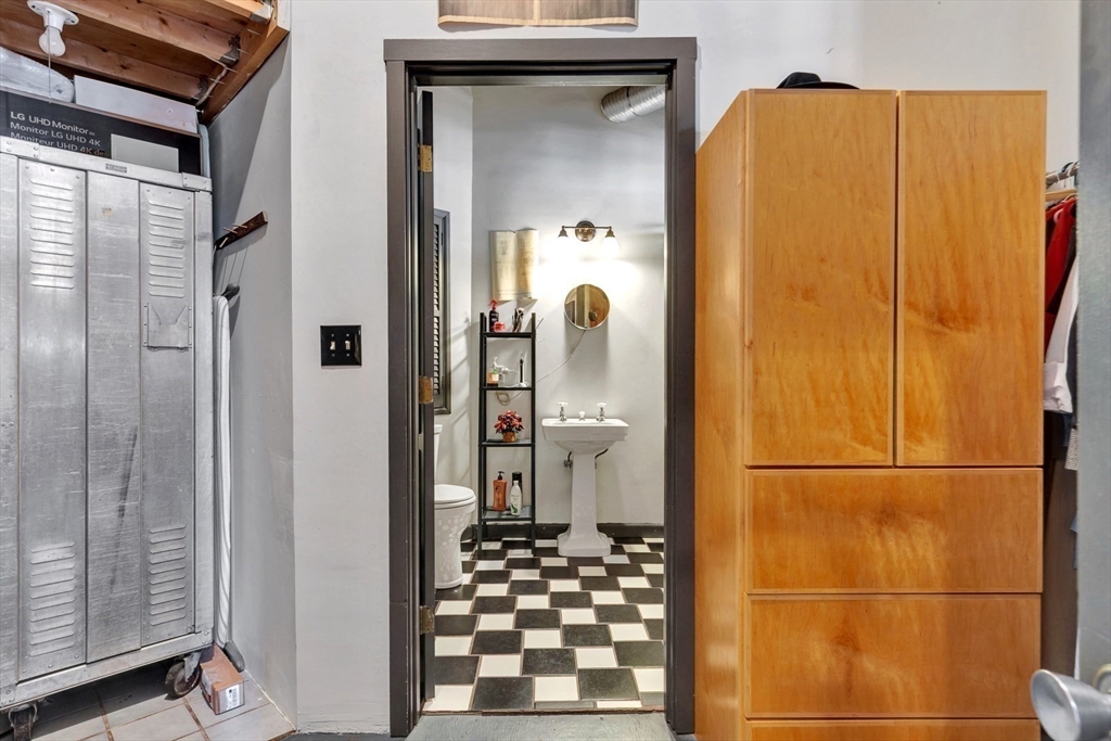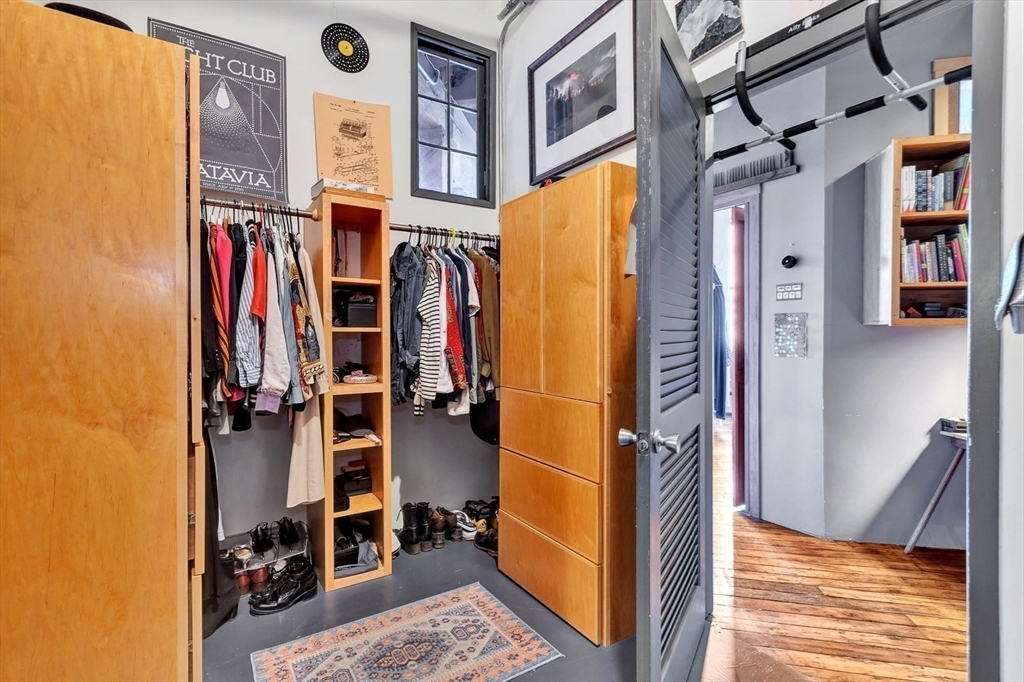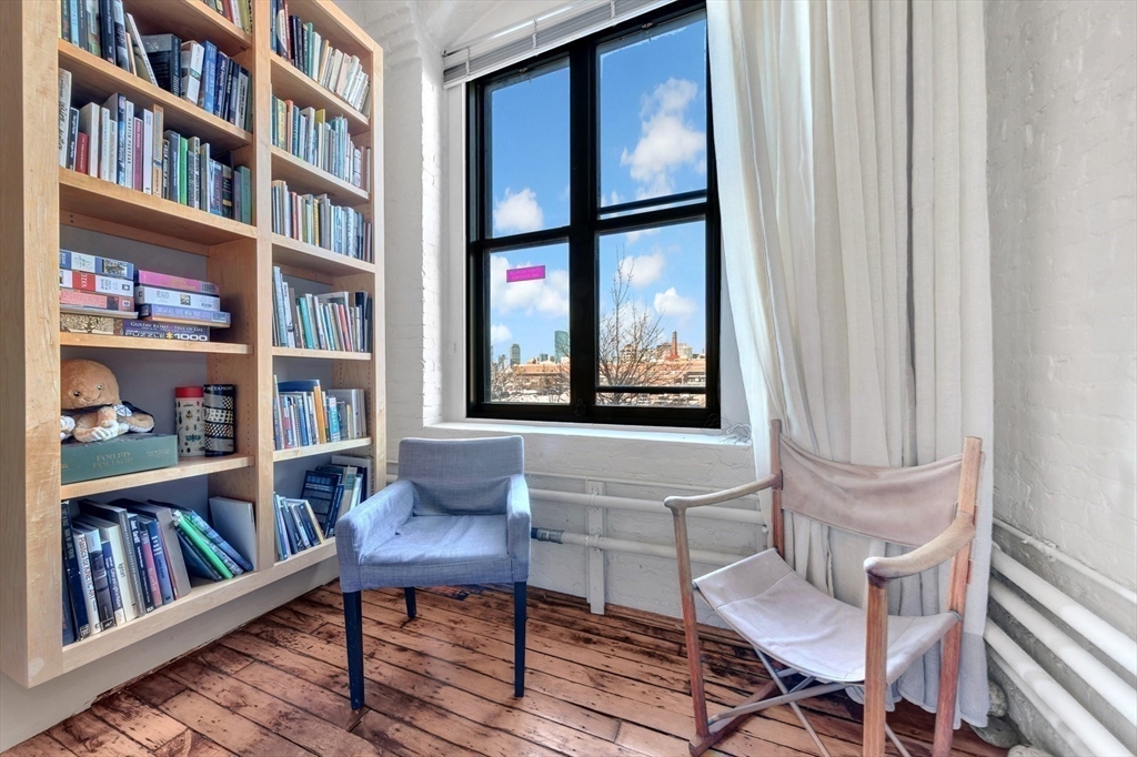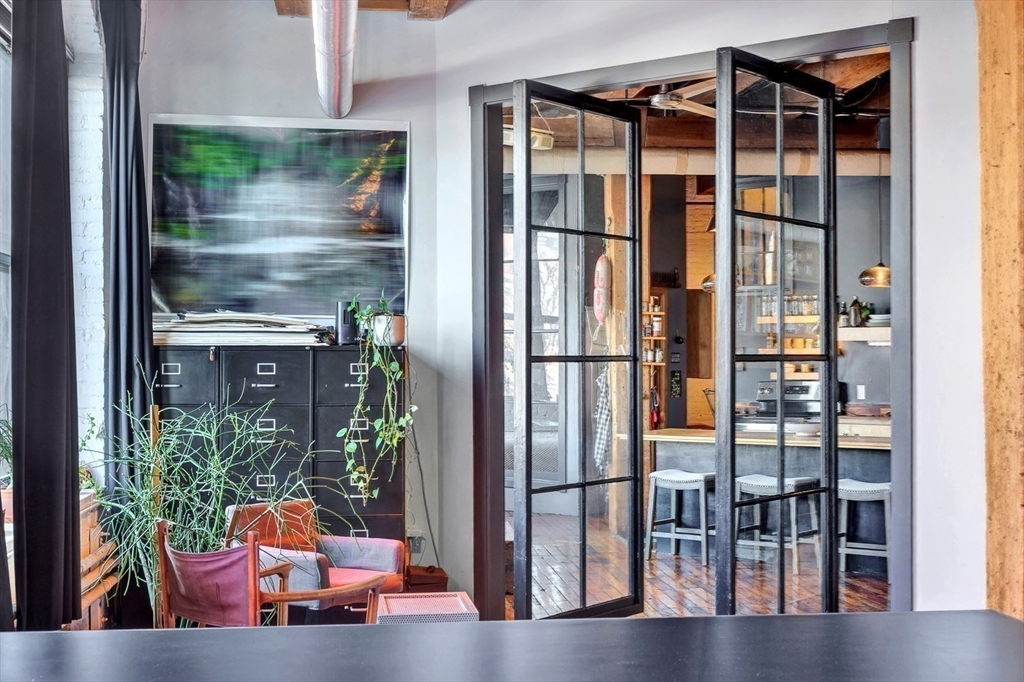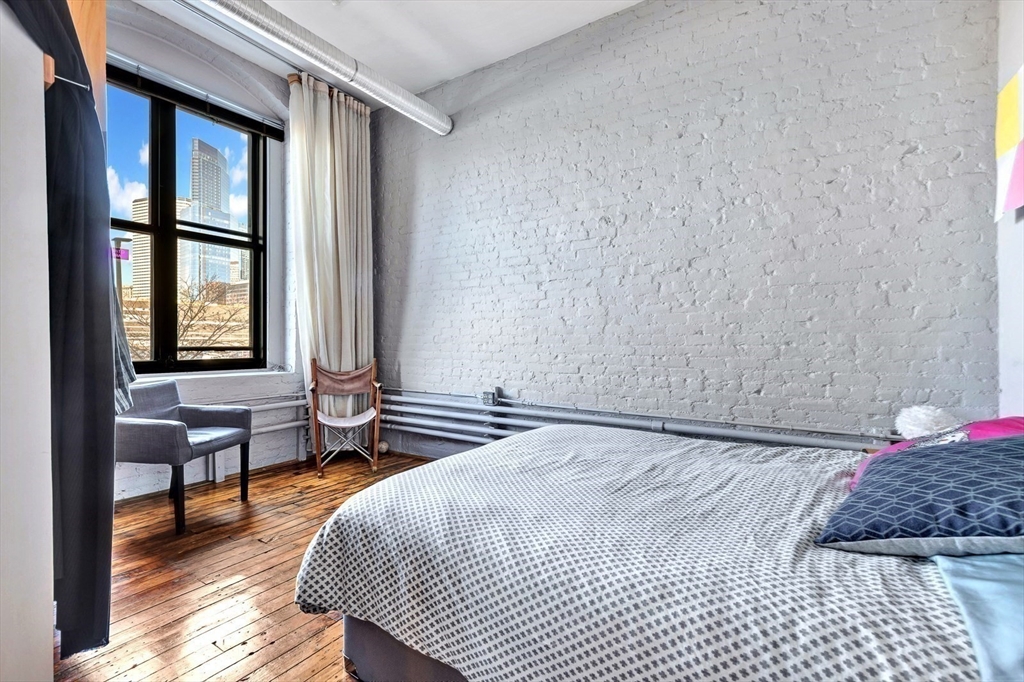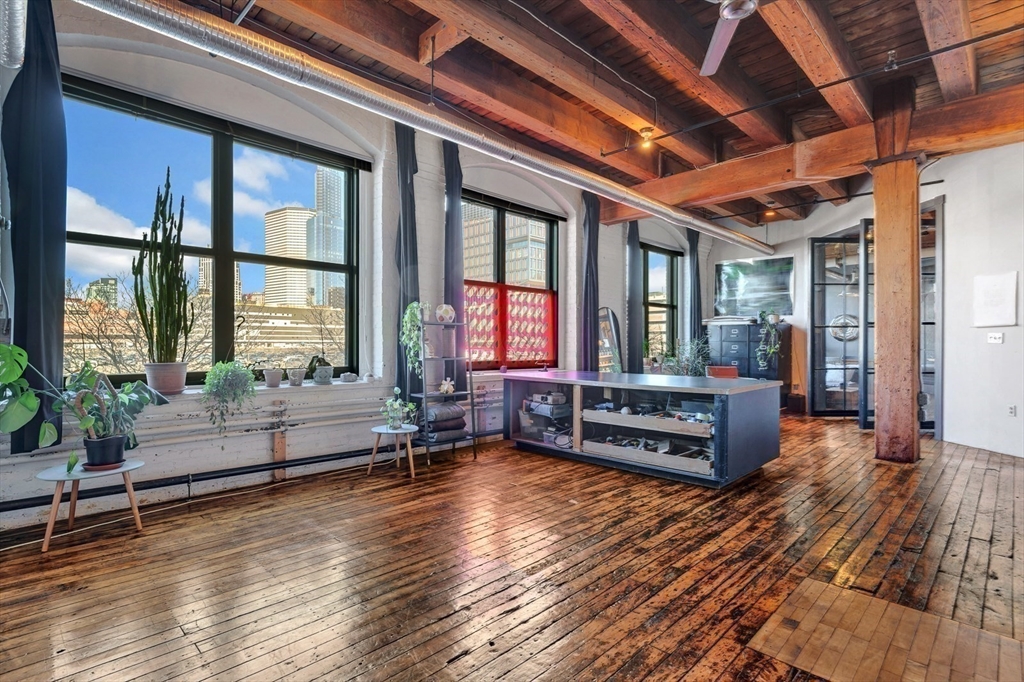 A rare LIVE-WORK opportunity in Boston's most dynamic neighborhood. This 1,609 sq ft artist loft features soaring 12-ft ceilings, original hardwood floors, and a light-filled open layout. The kitchen is fully equipped with refrigerator, oven, dishwasher, and disposal. A separate bath features a stunning clawfoot soaking tub. The private bedroom is its own distinct space. Conveyed with the unit: built-ins, file cabinetry, oversized worktable, overhead fans, and mobile A/C units. Common laundry in building. Two entrances with a large freight elevator directly across from the unit. Resident parking available first-come, first-served. HOA of $1,614/month covers fees and taxes. A resident-shared gallery hosts rotating art shows. Adjacent park offers picnic and BBQ spaces. Fort Point — where acclaimed restaurants, residential living, and a thriving arts community converge.