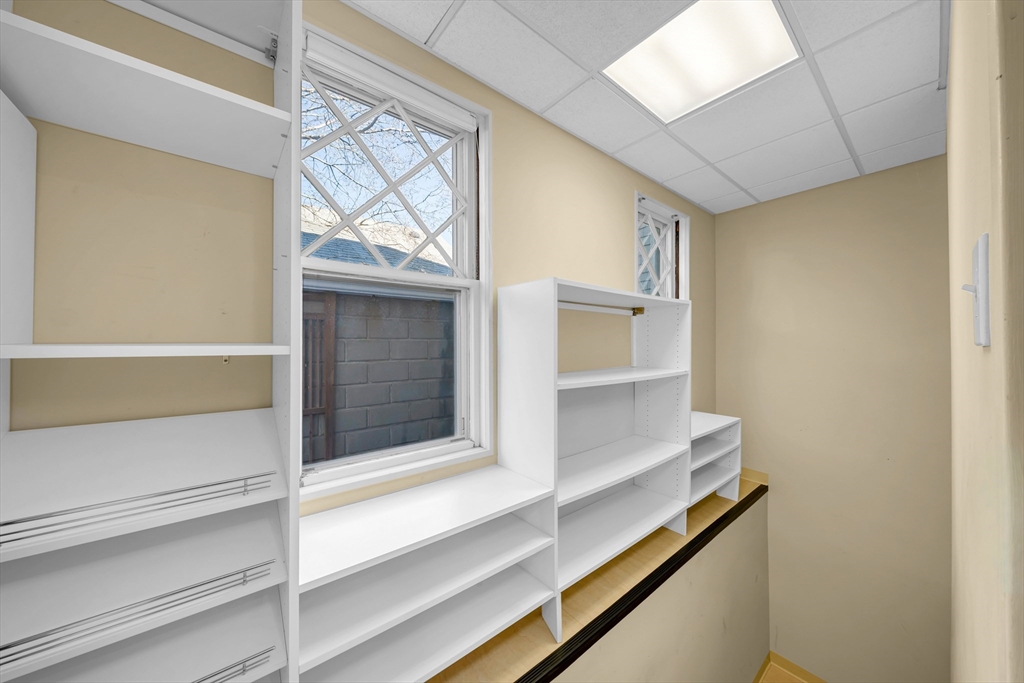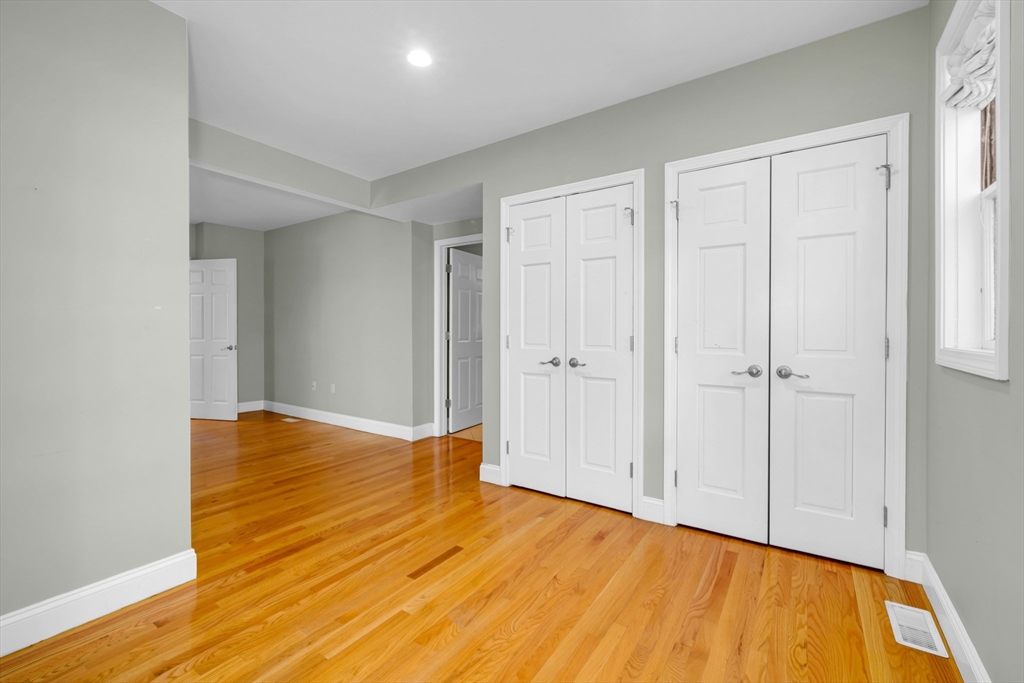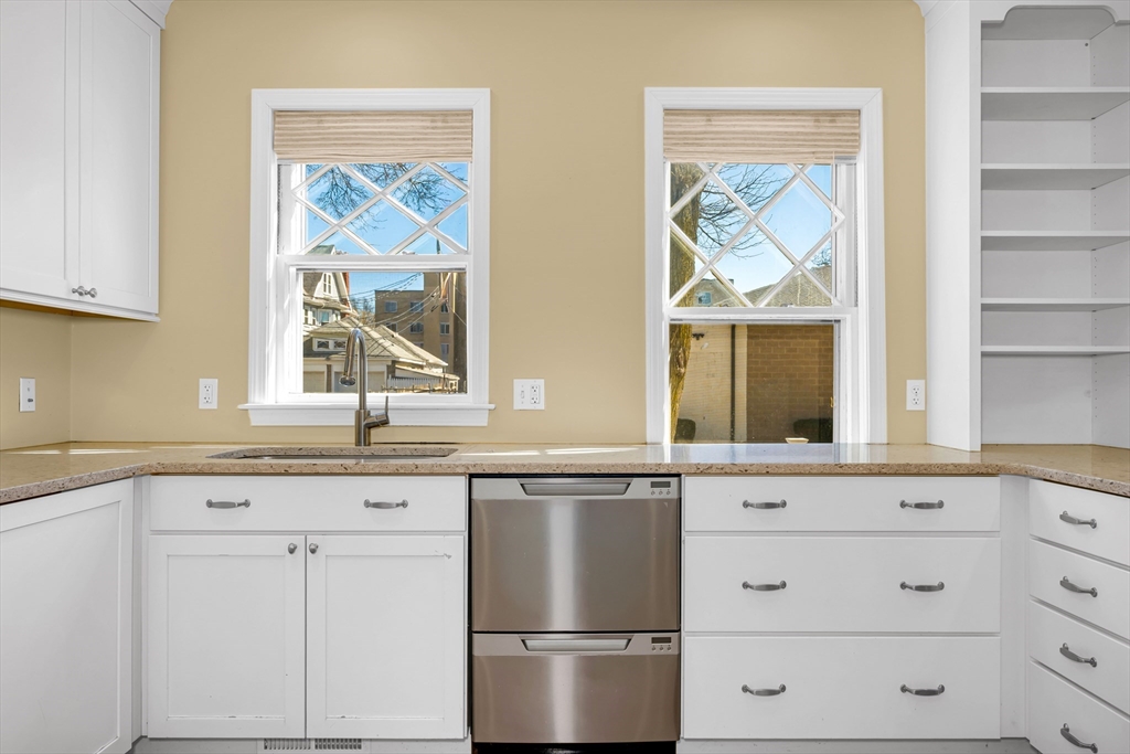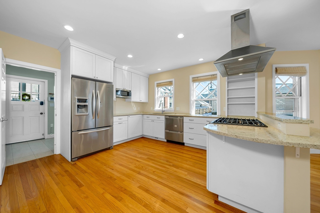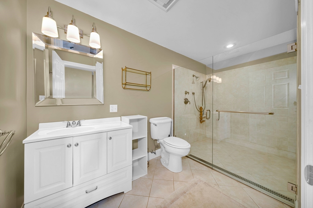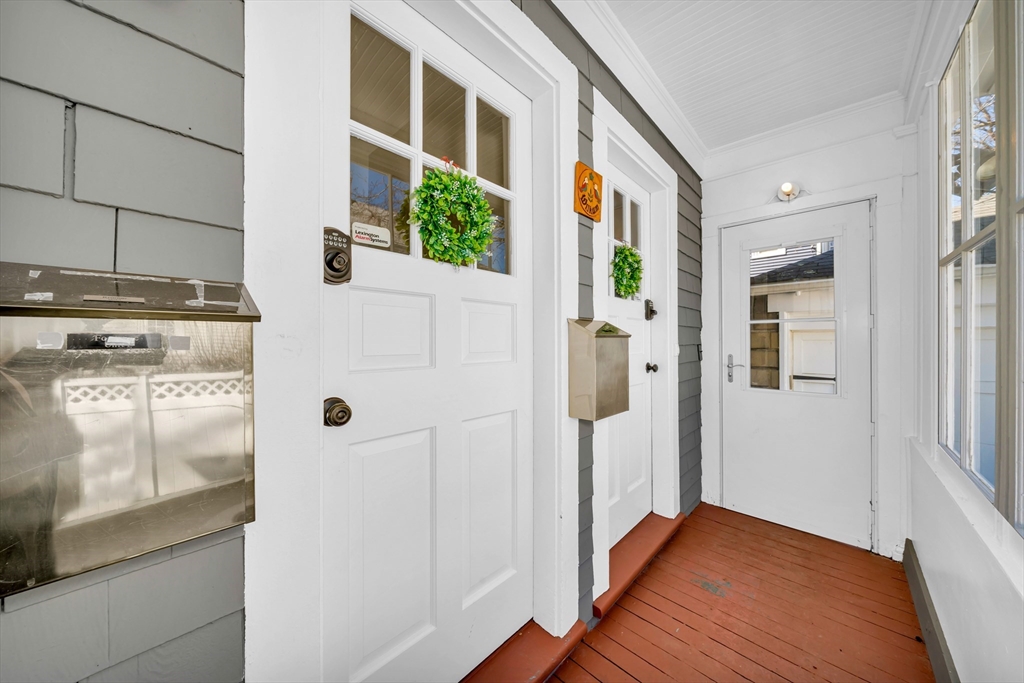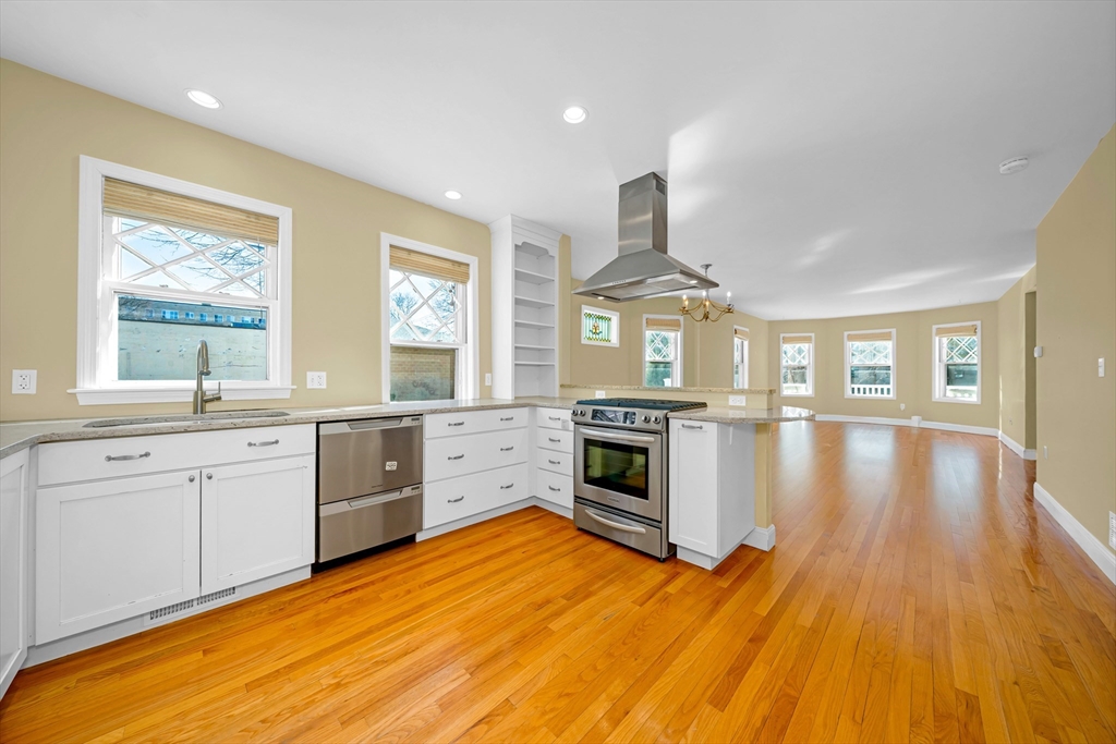 Steps to Arlington Center and Capitol Square shops and dining, with bus routes to Harvard Square and quick access to the Minuteman Bikeway toward Alewife. First-floor, one-level living with a welcoming foyer and open living/dining plan featuring bay windows and stained glass, plus flexible space for work or entertaining. High-end kitchen with abundant cabinetry, peninsula seating, granite counters, and stainless appliances. Extra-large primary suite includes a dressing room, office nook, and spa-like en-suite bath with ADA-accessible bathrooms. Plenty of closet space throughout. Move-in ready. Guest bedroom with walk-in closet and access to the second full bath. Full laundry/mudroom off the kitchen. Basement provides private and common storage. Private porch off the primary bedroom plus shared front porch. Parking: 1 garage space and 2 additional spots.