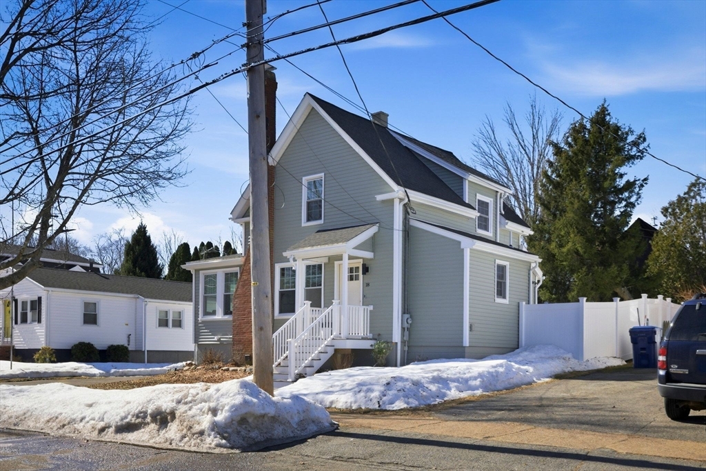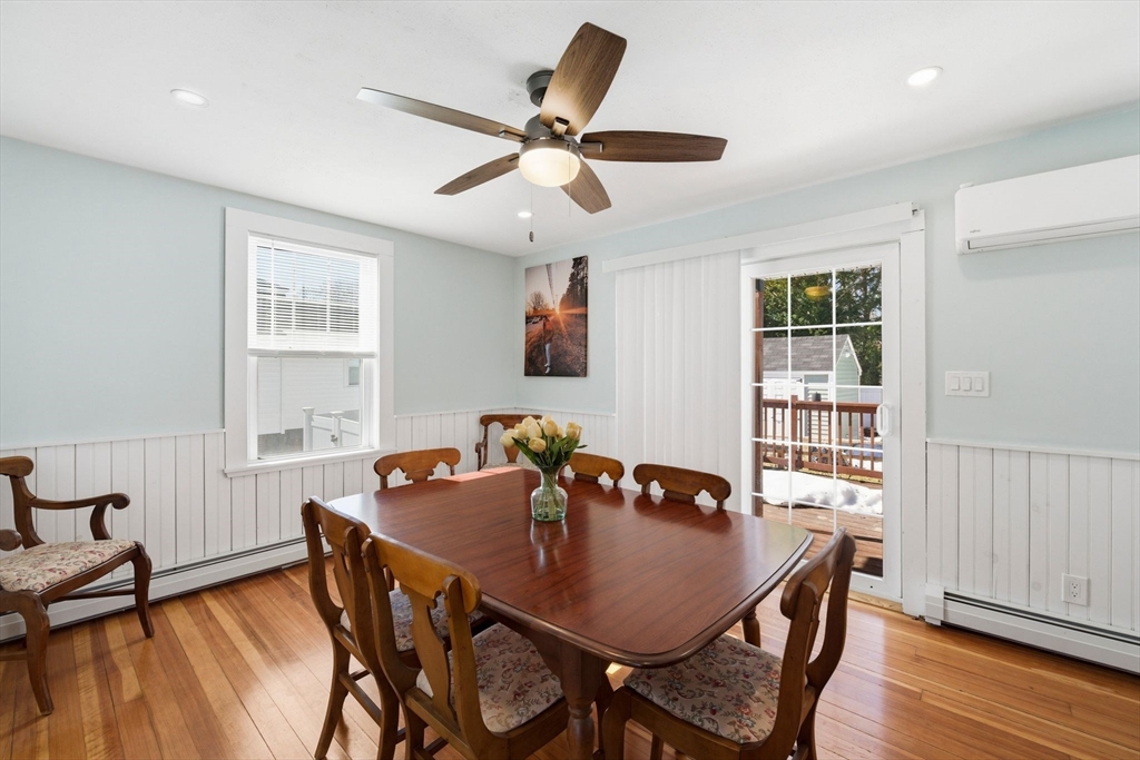 This inviting Danvers home captures comfortable living with thoughtful updates and outdoor charm. Sunlight pours through generous windows into the bright main level, where a brick fireplace with wood mantel and decorative sconces creates a warm focal point beneath soaring exposed wood beams. Hardwood floors anchor the living and dining rooms, while the updated kitchen flows into the dining area with a spacious island, updated cabinetry, quartz countertops, and stainless steel appliances. Sliders open to a welcoming deck and fenced yard—perfect for summer gatherings and relaxing evenings outdoors. First-floor laundry and a half bath add everyday ease. Upstairs, two comfortable bedrooms offer peaceful retreats alongside a full bath. The lower level adds flexibility with two bonus rooms and another full bath—ideal for a home office, gym, or guest space. Enjoy a yard with garden beds and two storage sheds. Located near McKinnon's Market, Danvers Rail Trail, Endicott Park, and downtown.