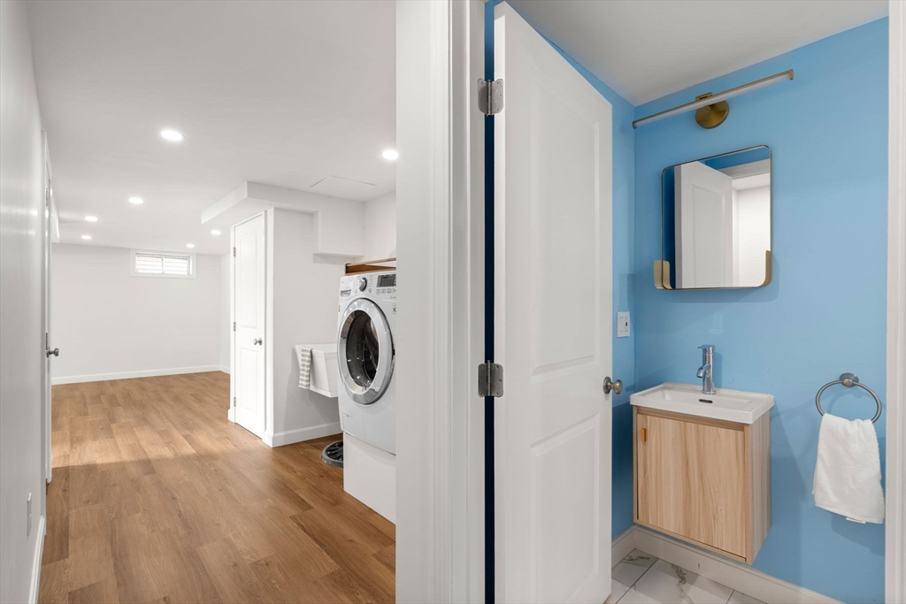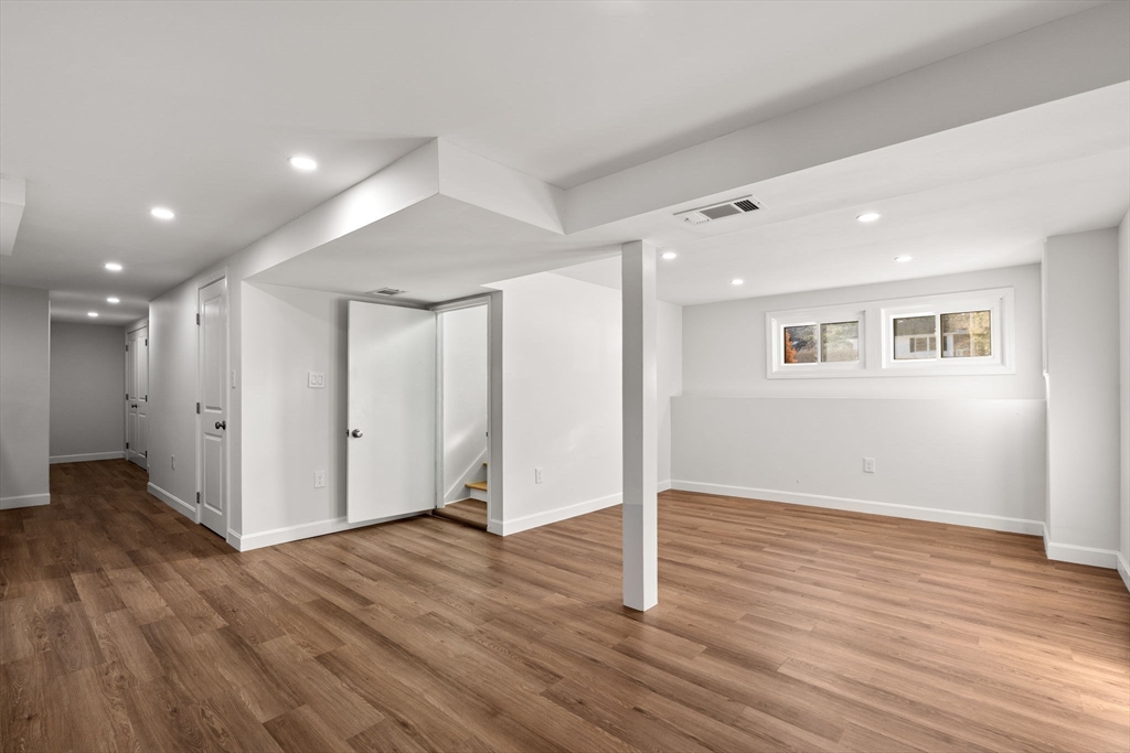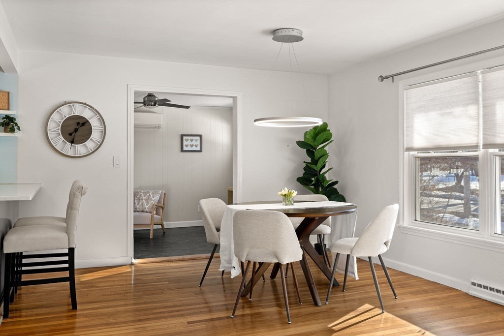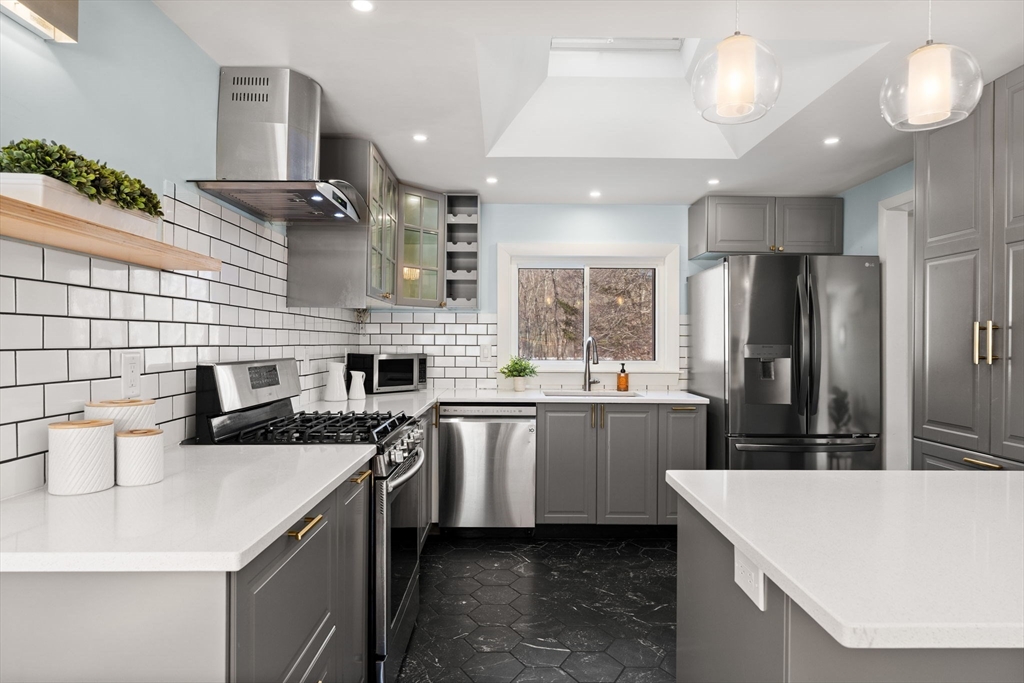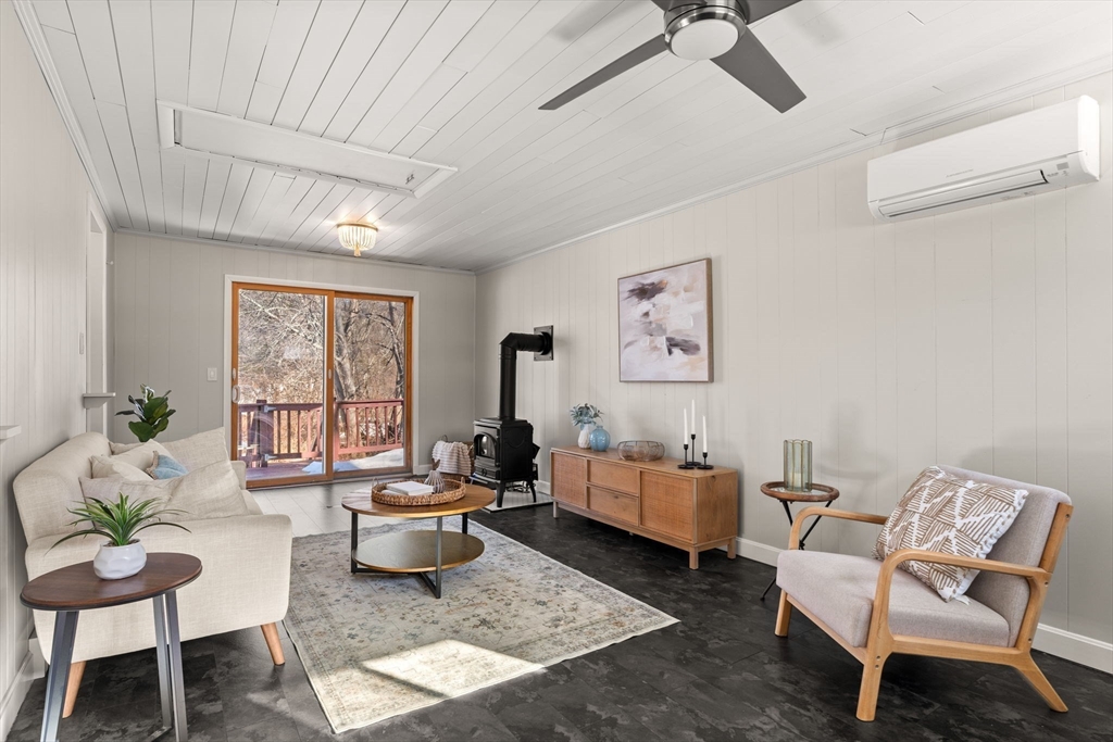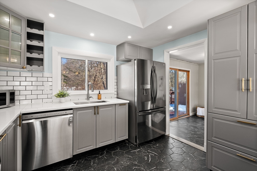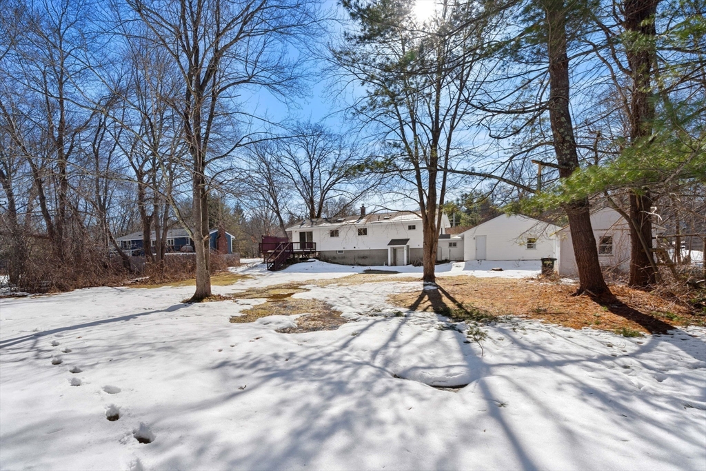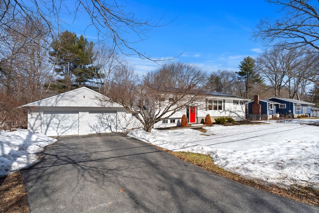 Welcome to this charming home offering convenient single-level living in a great Bedford neighborhood. Set on a spacious lot abutting conservation land, the property features a large backyard with easy access to nearby walking trails and the Minuteman Bikeway. Inside, you find a large living/dining area in addition to a large front to back family room with a gas stove, mini-split cooling and direct access to the deck, creating an easy indoor-outdoor flow. The renovated kitchen features newer cabinets, appliances, and flooring along with peninsula seating and a skylight for added natural light. The home has 3 beds on the main floor as well as a 3/4 bath, a newly finished basement with additional full bath, detached 2-car garage w/workshop, owned solar panels with Powerwall battery system, and several major updates including roof, plumbing, insulation, and more. Close to everything, this well-maintained home blends comfort, efficiency, and a beautiful natural setting.