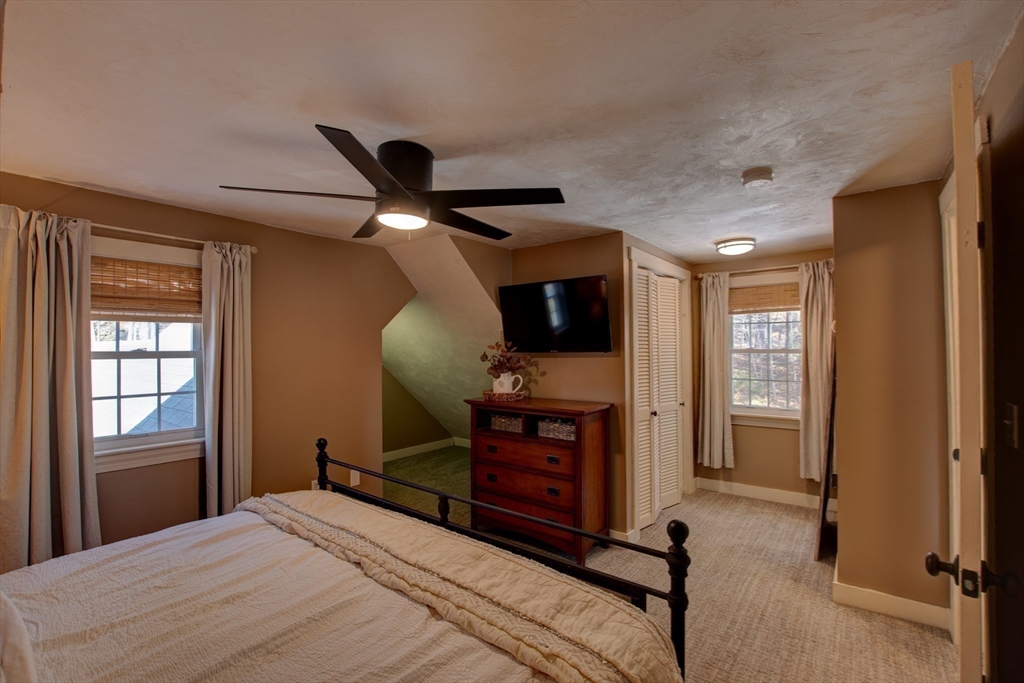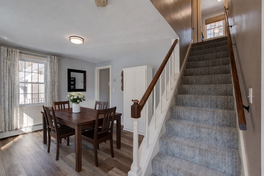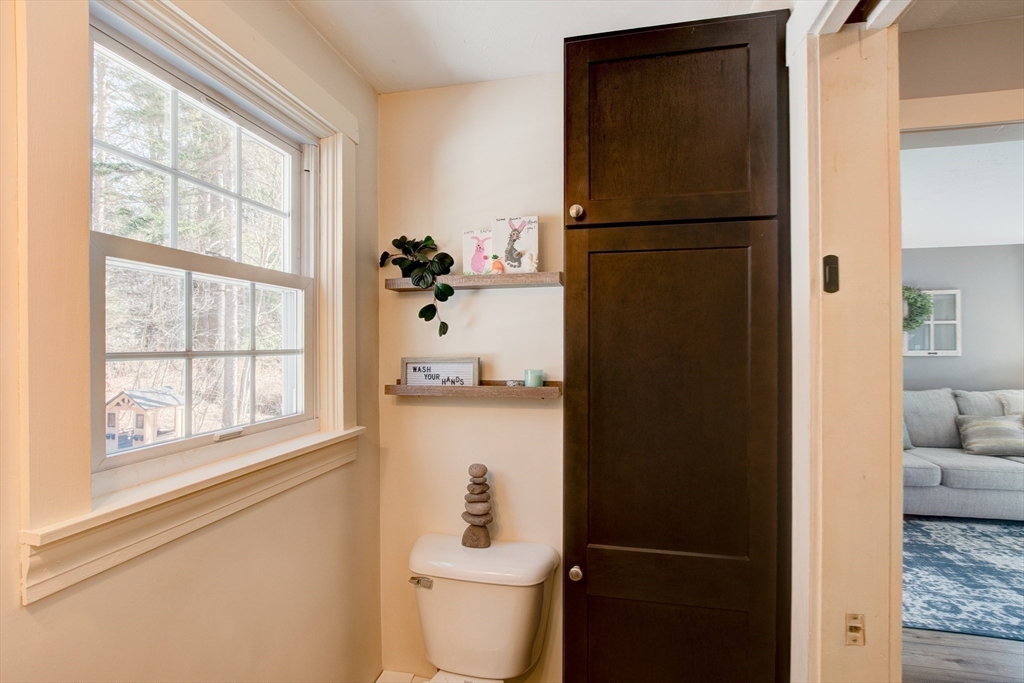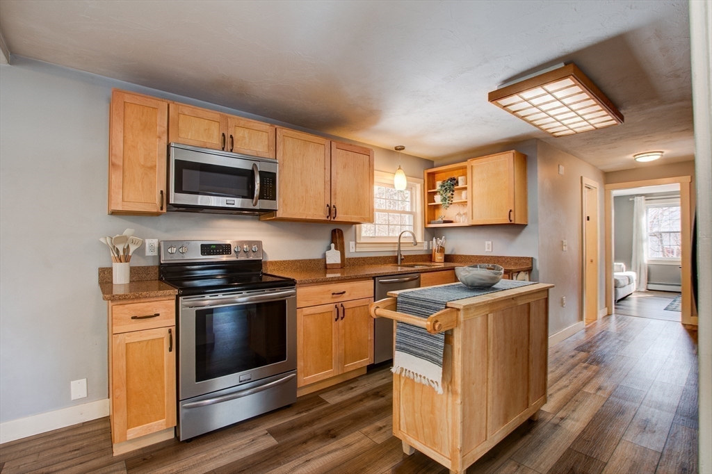 New England Cape style home well-loved, impeccably maintained set on a beautifully landscaped ½ acre in a rural part of the city on a quiet cul-de-sac. Charming 3-bedroom, 2-full bath home is move-in ready and filled with warmth and tasteful décor that creates an inviting, comfortable feel throughout. Mudroom entry leads to the kitchen. Spacious front-to-back living room features a cozy fireplace, the dining room at the front of the home is perfect for gatherings. Updated eat-in kitchen with stainless appliances includes a French door to the back deck for easy indoor-outdoor entertainment overlooking beautiful flower gardens. Luxury vinyl plank flooring runs throughout most of the first floor. The second floor offers 3 bedrooms with ample closets, new wall-to-wall carpeting on the stairs and bedrooms, and a full bath. Vinyl siding, vinyl windows, updated mechanics, 2-car garage with storage above. Convenient to Fitchburg University, Burbank Hospital, Train Station.