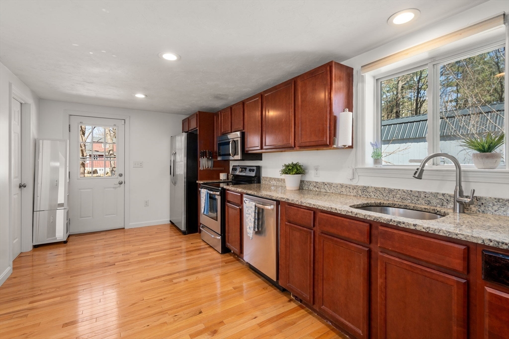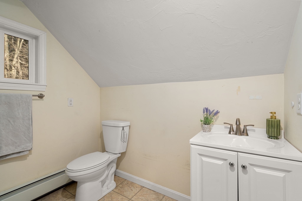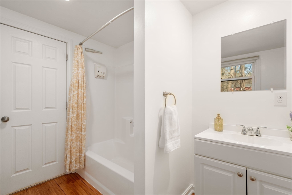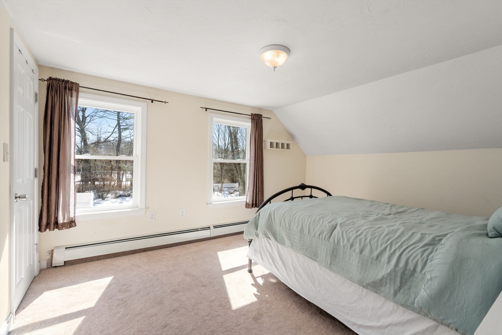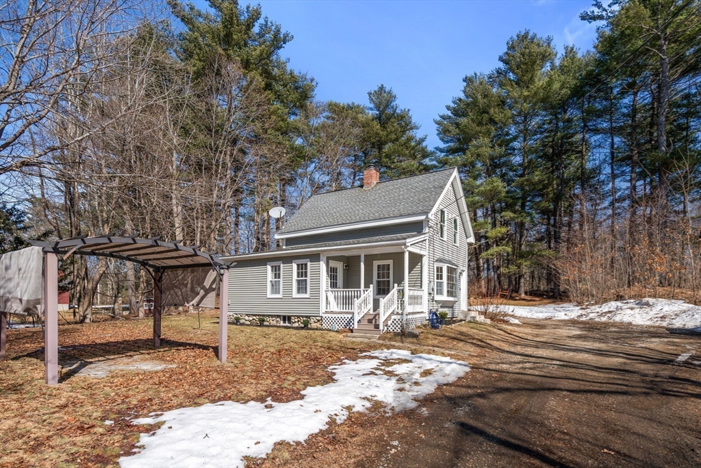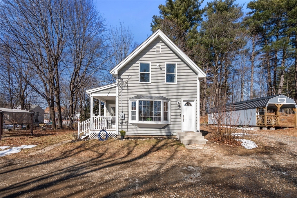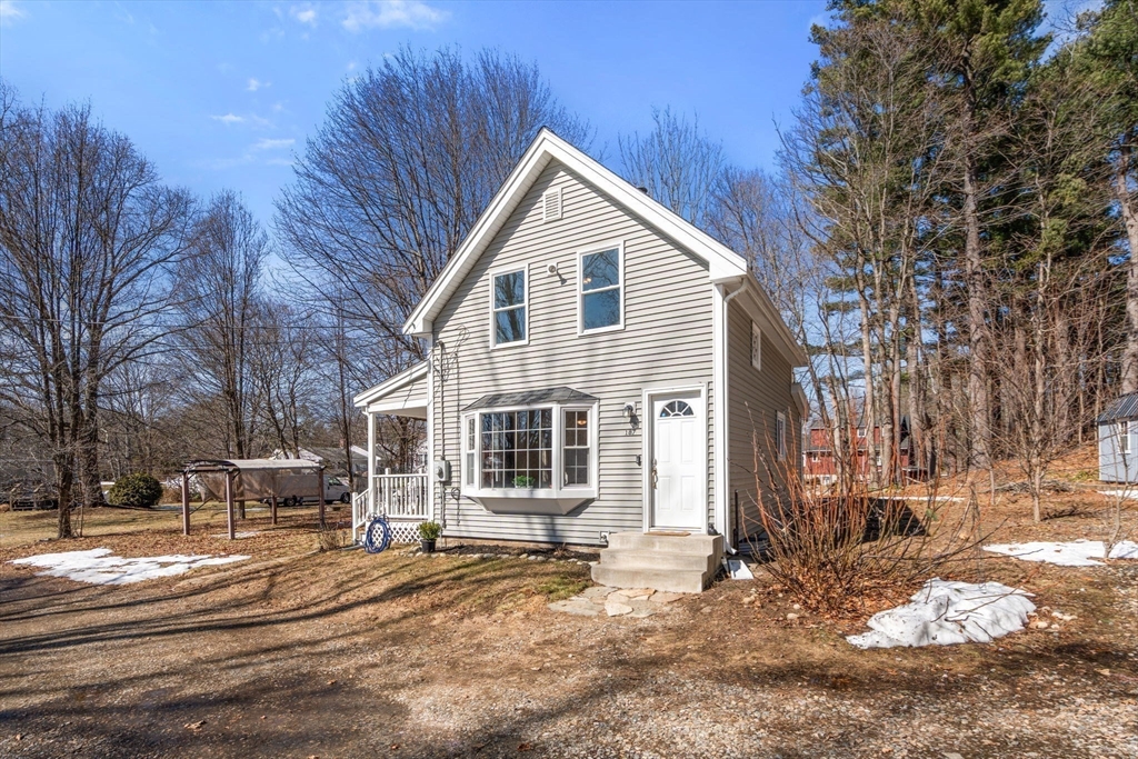 Looking for land, small house or condo alternative? Come see this remodeled and updated Village Colonial with side porch entry and many possibilities. The floor plan is bright and open. First floor features a large kitchen, sun splashed dining area, full bath with washer/dryer, gleaming hardwood floors, and a living room with a pretty angled bay window. Two bedrooms and another full bath are upstairs. Updates include systems, roof, vinyl siding and the huge shed. Sitting at the end of a long Right of Way, the land has so many possibilities and opens to 1.8 acres overlooking woodlands and Huckleberry Brook in the far distance. The large outbuilding/shed has even more possibilities. Currently on private septic, there could be potential access to town sewer at back of property. As always, buyer to do own due dilligence. Hurry to see this unique opportunity. SHOWN BY APPOINTMENT ONLY. Call or text for a time slot.