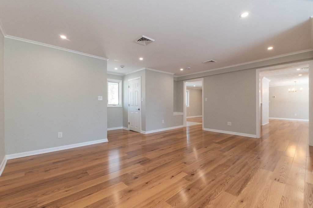 This is a tastefully renovated ranch, inside and out, with an open floor plan. Upon entering you'll notice the living room has a fireplace and picture window and the dining room has a bay window. In the kitchen you'll find upgraded white shaker cabinets with a breakfast bar, quartz countertops with a backsplash, stainless steel appliances, and gas cooking with exterior venting. There is a large family room with a slider leading to a patio and a laundry closet with a gas & electric dryer hookup. The main bedroom has two closets and a full bath with a tiled walk-in shower. Most rooms have high-end engineered flooring plus recessed lighting. There is a new gas warm air heating system with central air conditioning, an upgraded 200-amp electric service, and a gas Navien tankless instant hot water system. The exterior has tremendous curb appeal with new landscaping, vinyl siding, roof, driveway, and a brick walkway. Easy highway access and close to schools, parks, shopping, and restaurants.