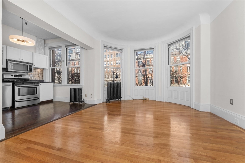 This bright, front-facing one-bedroom, one-bath apartment in the heart of Back Bay is located on the second floor of a classic brownstone and beautifully combines historic character with modern updates. The open kitchen is equipped with a gas range and large windows overlooking Beacon Street. The generous living area features 10-foot ceilings, a decorative fireplace, and hardwood and tile flooring. The bedroom offers excellent storage with three closets and en-suite bathroom. Ductless air conditioning provides year-round comfort. Residents also enjoy access to a common roof deck with stunning views of the city skyline and the Charles River. Heat and hot water are included, and laundry is available in the building. Unit was just painted.