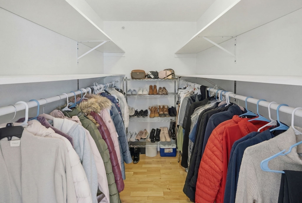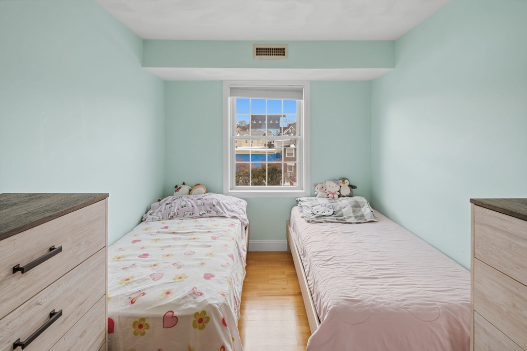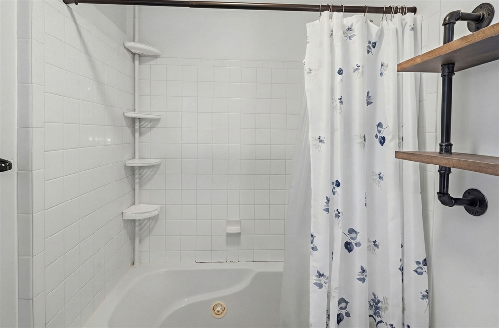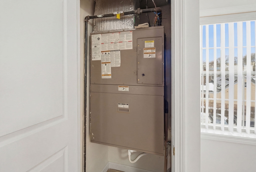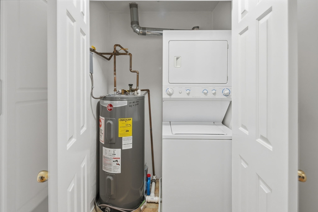 Enjoy turnkey living in this top-floor corner condo overlooking manicured gardens and a peaceful courtyard, and decorative garden lighting. This sunlit 2-bedroom, 1-bath home features an open-concept living and dining area with hardwood floors. The modern galley kitchen offers Frigidaire stainless steel appliances, granite counters, a pantry, and a dishwasher. The primary bedroom includes a walk-in closet; the second bedroom is ideal for guests or a home office. Relax in the bathroom with a jetted tub. Additional perks include an in-unit stack washer/dryer, CENTRAL AIR, and TWO DEEDED PARKING APACES. Move-in ready and minutes from Boston, shopping, public transit, and beaches—see it today!