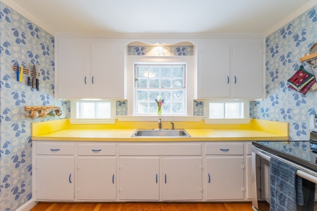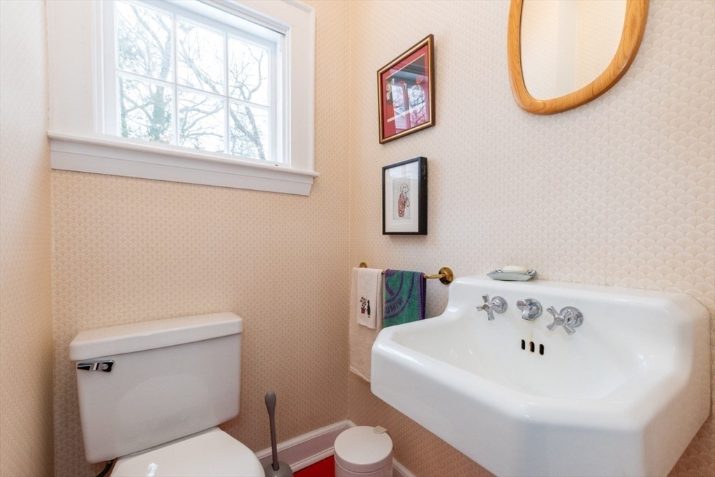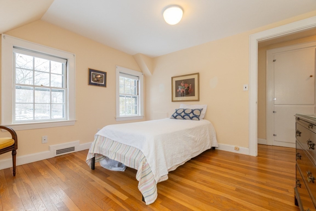 This adorable cape has been lovingly maintained and sits on a quiet corner lot, ensuring privacy and lots of sun from every angle.The main level has a charming living room with a wood burning fireplace, abundant windows, a cozy kitchen with lots of storage, a bedroom/office, a spacious dining room, a half bath and a lovely enclosed, three season porch. The second level has two roomy bedrooms, a full bath and a large closet in the primary. The lower level has a recently updated, large family or play room and is built out in original, warm pine. Attached one car garage, a pretty yard with space designed for gardening and nicely manicured plantings. Located on a desirable street that hosts block parties, Easy walk to Woodland T stop, easy access to commuter rail and express bus.
