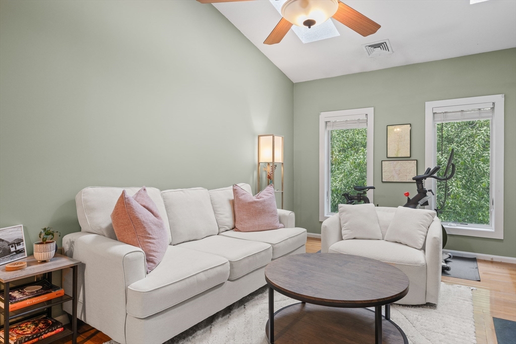 Welcome to 44 Bay Farm Rd! This well-maintained second-floor unit is bright and inviting, with serene wooded views from every window and the back deck. Gleaming hardwood floors greet you at the entrance, leading to a spacious living room featuring a cozy fireplace, new skylights, and a vaulted ceiling. Step onto your deck for peaceful mornings or relaxing evenings. The sparkling kitchen boasts granite counters and tile backsplash. The Livingroom flows into an open dining area—perfect for entertaining. Down the hall, the main bedroom offers a walk-in closet, skylights, and an en suite bath. A second bedroom, could be ideal for an office, and another full bath complete the space. There is also a detached garage. Bay Farm is beautifully landscaped with walking trails, a pond, an inground pool, tennis courts, new gym facility and lush lawn areas. Conveniently close to beaches, highways, shopping, and dining—this home is a gem!