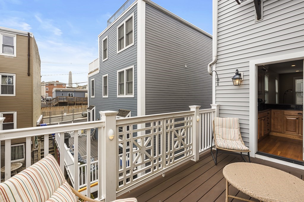 Oversized 1 bed + den, 1 bath condo spanning nearly 900 SF of thoughtfully designed living space, complete with a private deck and modern finishes. The open-concept kitchen and living area features stainless steel appliances, granite countertops, and a breakfast bar ideal for everyday living and entertaining. Just off the kitchen, a large glass door leads to a private deck with views of the Bunker Hill Monument. The spacious bedroom easily accommodates a king-sized bed and is complemented by a dream custom walk-in closet. A separate den provides the perfect dedicated home office, guest space, or nursery. Additional highlights include hardwood floors, A/C, in-unit washer and dryer, and soaring ceilings. Windows on three sides flood the home with natural light, creating a bright and inviting atmosphere. Ideally located between neighborhood favorites Monument and Waverly Kitchen, with easy access to all that Charlestown has to offer.