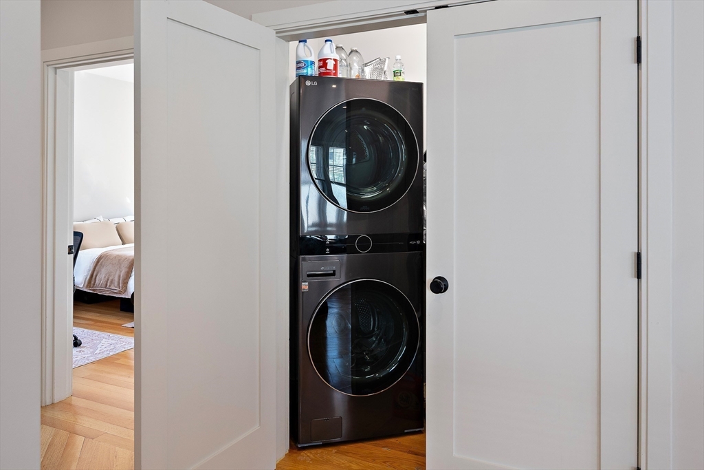 Natural light, clean design, and an easy layout make this home at The Residences at Mt. Pleasant feel instantly comfortable. The open living and dining space is framed by beautiful herringbone oak floors and oversized windows, creating a bright setting for everyday living or hosting. The kitchen is designed to gather around, featuring quartz countertops, GE stainless steel appliances, two-tone cabinetry, and a large island with seating. Step outside to a private deck, perfect for grilling or enjoying a quiet morning coffee. Two spacious bedrooms include a primary suite with custom closets and a spa-style bath with an oversized walk-in shower. Additional features include central air, in-unit laundry, built-in Sonos sound, video intercom, private basement storage, and deeded parking with EV hookup. Move-in ready and thoughtfully designed for modern city living.