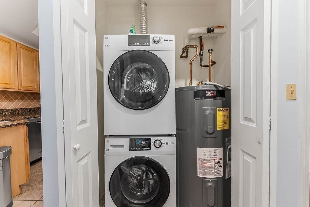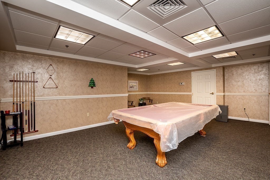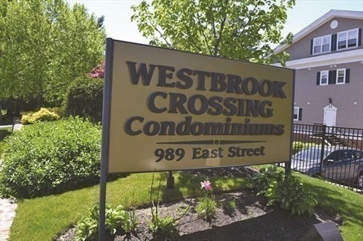 Tired of mowing the lawn, shoveling snow, and maintaining a house? Try the condo life! Tucked into a residential area, this 55+ community offers the convenience of condominium living with a neighborhood feel. This top floor unit features an open floorplan with a spacious living room and slider to the balcony. Modern kitchen with granite counters, newer stainless steel appliances and a breakfast bar. Dining area with room for table and hutch. Primary bedroom with fabulous walk in cedar closet. Full bath with generous counter space, tub/shower combo. Full size stackable washer and dryer in unit. Two parking spaces, including a coveted garage spot. Additional storage outside of unit. Updated systems. Gas heat, central air. Common amenities include function room with kitchen, library, fitness room, and screened porch overlooking conservation land. Walking distance to Endicott rail station, minutes to highways, Legacy Place and University Station. Easy to show! OH Sat Sun 12-1:30