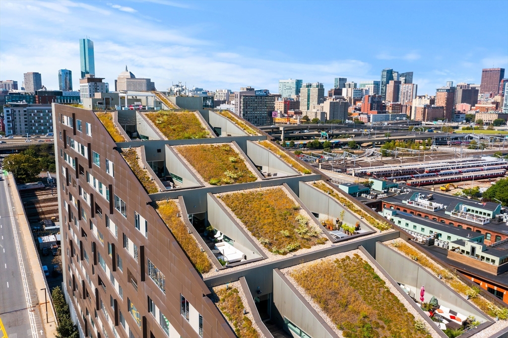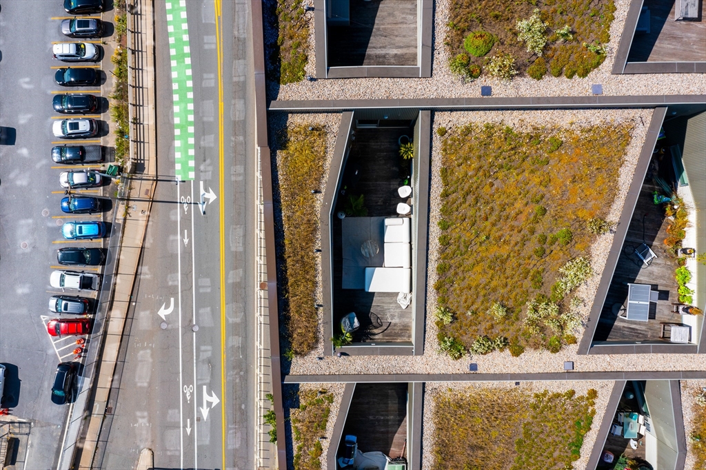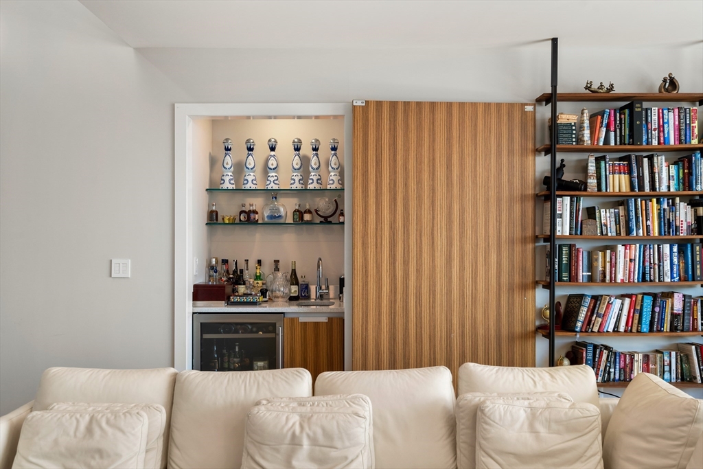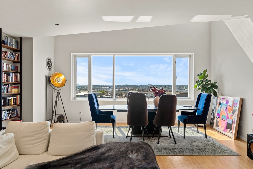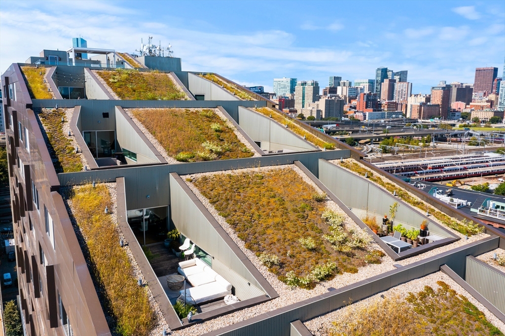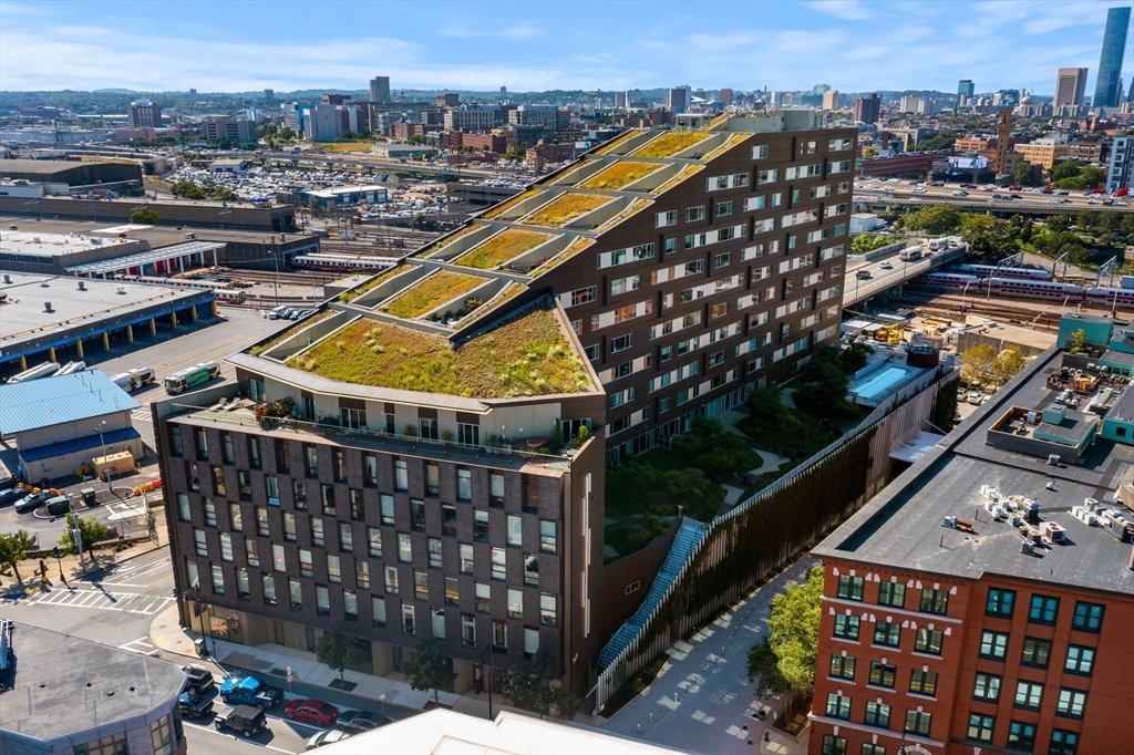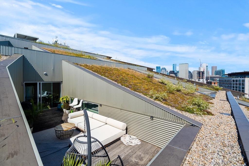Residence 910 at the Macallen Building is a rare triplex penthouse offering a thoughtful multi-level layout and exceptional outdoor space. The upper level features a large eat-in kitchen, powder room, and an expansive private roof deck (over 300 SF). The middle level showcases a loft-style living area with soaring ceilings and a wet bar. The lower level includes a primary suite and a second bedroom, both featuring custom built-in closets, along with an adjacent full bath. Additional highlights include bamboo flooring, in-unit laundry, central A/C, and one garage parking space. This south-facing home is filled with natural light. Located in a LEED Gold-certified, full-service building with 24/7 concierge, heated pool, fitness center, and more—just steps to the Broadway T, major routes, and neighborhood dining.