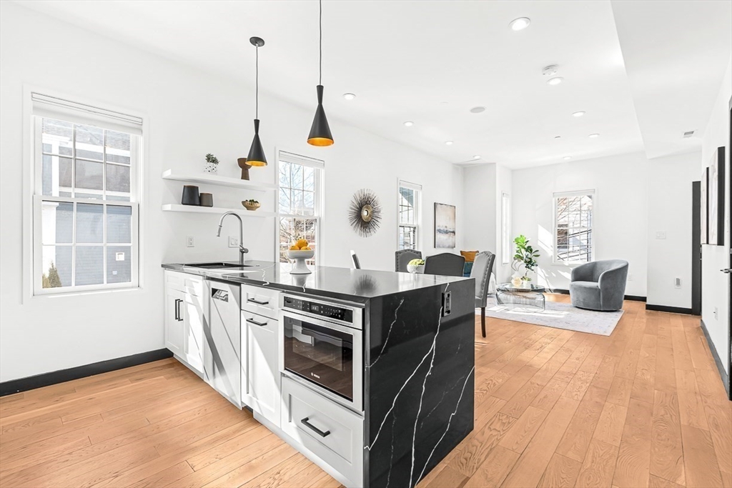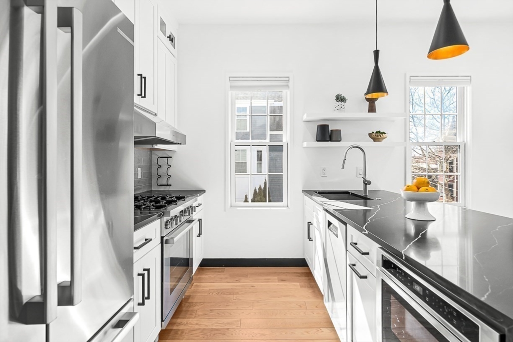 Experience modern luxury in the heart of Union Square with this stunning 3-bedroom, 2-bath condo, fully renovated in 2021. Located on the second floor, the home features soaring ceilings and engineered hardwood floors throughout, creating a bright, sophisticated atmosphere. The designer kitchen showcases stainless steel appliances, sleek cabinetry, and modern finishes that flow seamlessly into the open living and dining areas—ideal for entertaining. The spacious primary suite serves as a private retreat with a beautiful ensuite bath and a custom walk-in closet. Two additional bedrooms provide flexibility for guests or a home office. Enjoy the convenience of in-unit laundry and abundant natural light. Relax on your private balcony, plus tandem parking with a side driveway. Pet-friendly with a low HOA fee, and close to restaurants, Market Basket, shopping and public transportation—this turnkey home blends luxury, comfort, and prime location. New roof as of March 2026