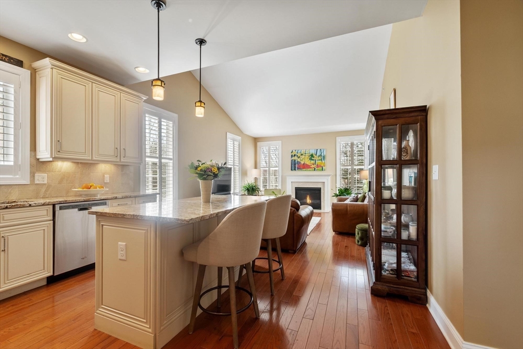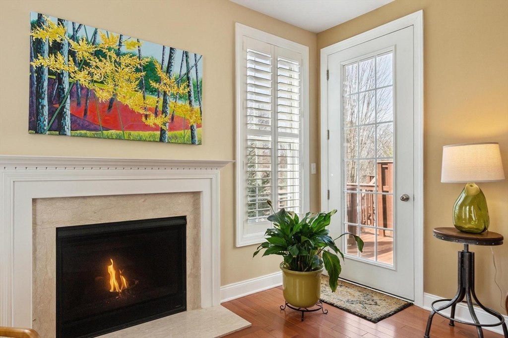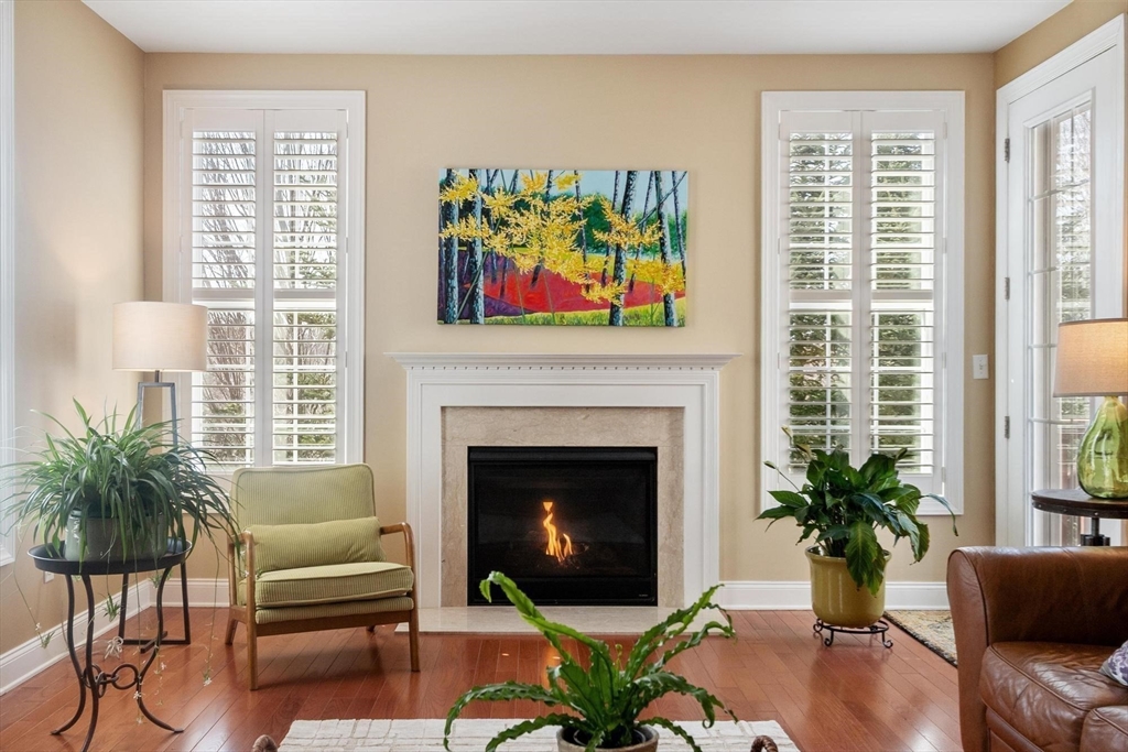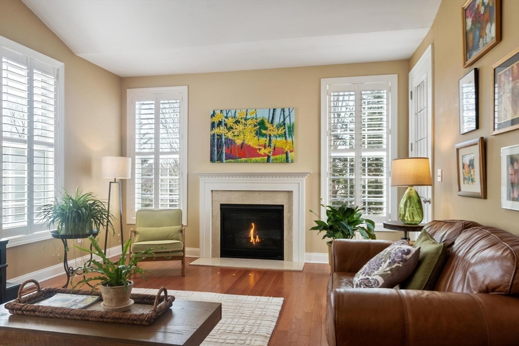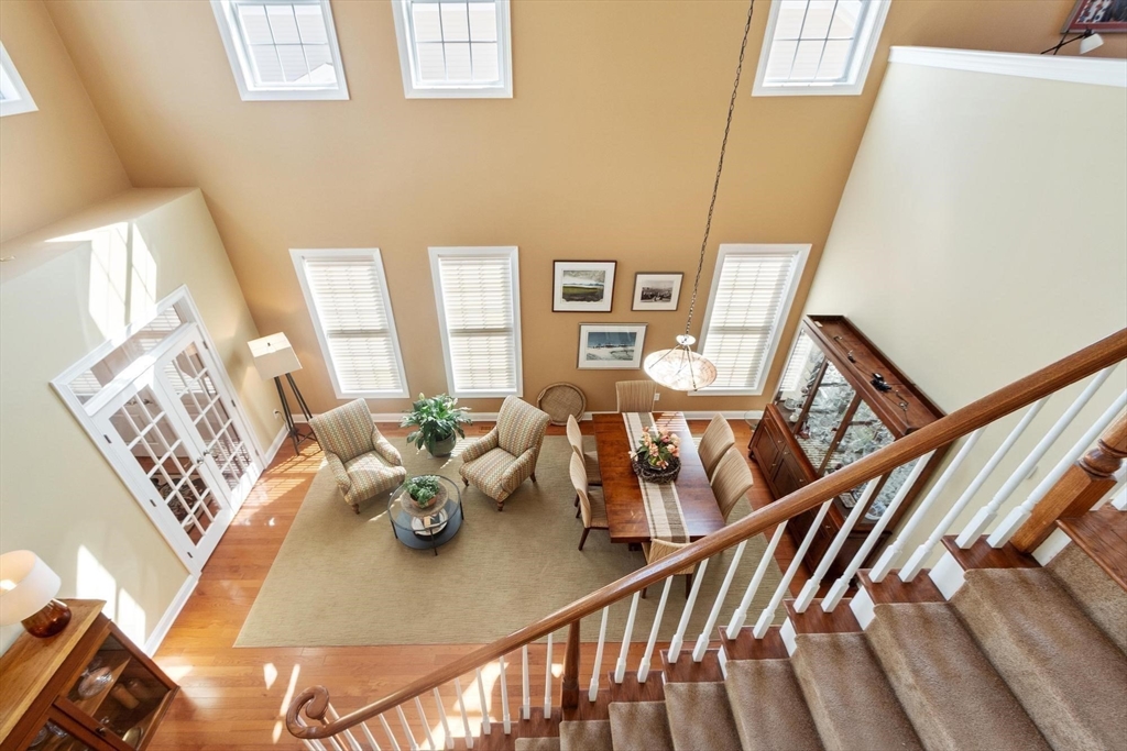 Sun-filled end-unit townhome in desirable Regency at Assabet Ridge (over 55) close to major routes, shopping, restaurants, rail-trail, new library and much more ! The front foyer with custom French doors welcomes you into the LR/DR with a dramatic 20' ceiling, gleaming H/W floors and windows galore with custom window treatments. The upgraded kitchen offers cream cabinets and granite on countertops and island. The sun-splashed family room features a gas fireplace, vaulted ceiling, H/W floors and custom window shutters. The lovely main floor bedroom includes a handsome tiled ensuite with soaking tub, shower and walk-in closet. Laundry area,half bath and direct entry to 2 -car garage complete the main floor. Upstairs are 2 additional carpeted sunny bedrooms both with walk-in closets. The open loft area is ideal for an office area. Large unfinished walk-out basement offers great storage or finishing potential. The deck overlooks a private, wooded area. A gem in a wonderful community !