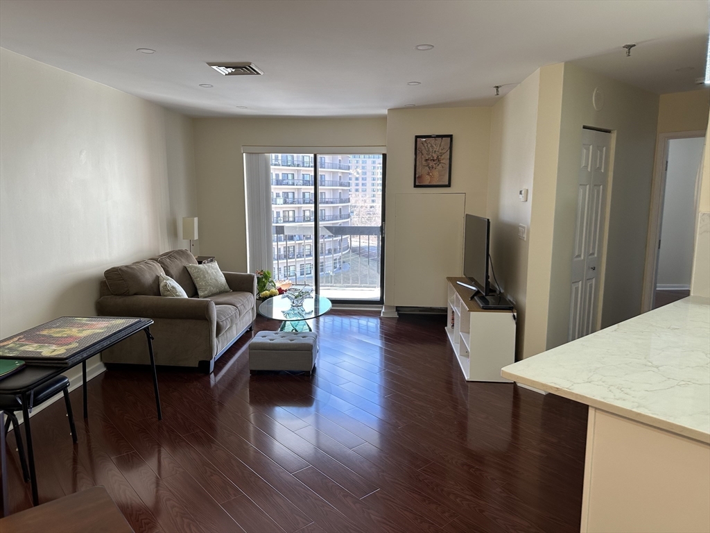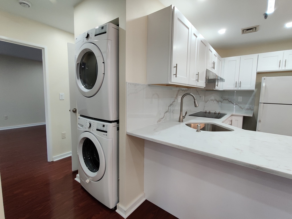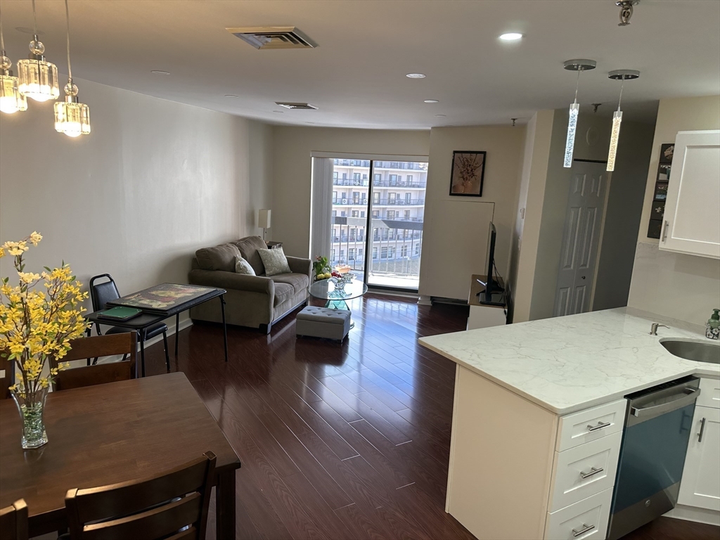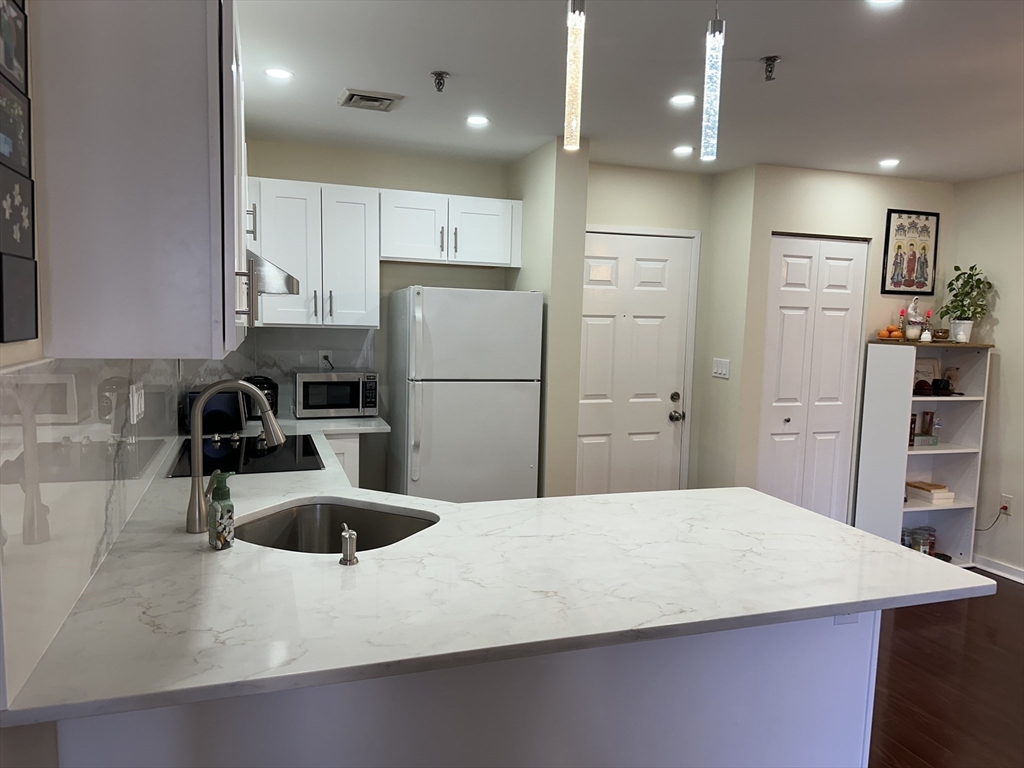Completely remodeled residence with open floor plan featuring gleaming waterproof laminate floors throughout, with tile in bathroom. New kitchen design with quartz countertops and backsplash with penisula for seating. Radiant cooktop installed and new dishwasher. Separate dining area open to living space with slider to balconly. Luxury bath and new stackable washer dryer outside of your bedroom. Bedroom offers recessed lighting, 3 closets and access to balcony as well. You have extra storage and garage parking. Also, amenities include a large fitness room, sauna and steam and outdoor swimming pool. Conveniently located near N Quincy T, Wollaston beach, Marina Bay and highway.