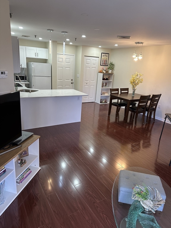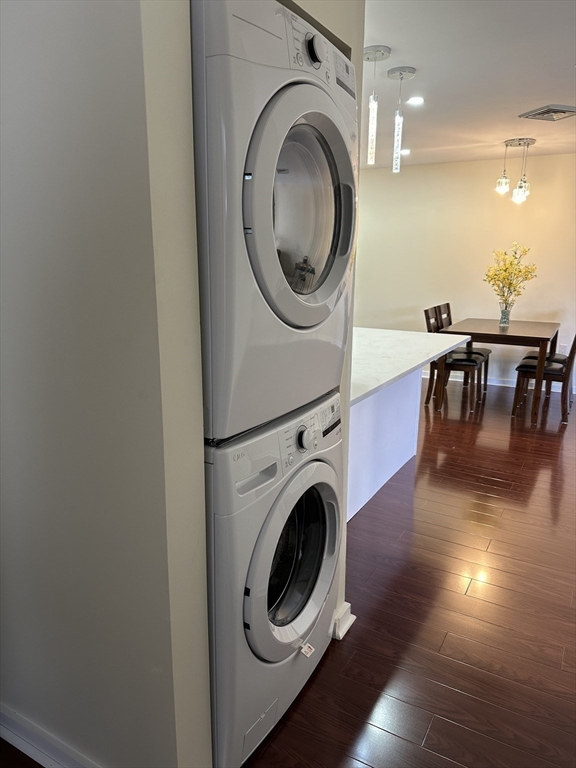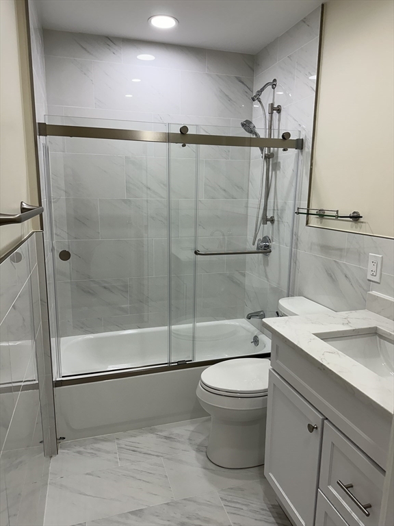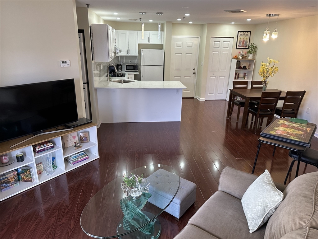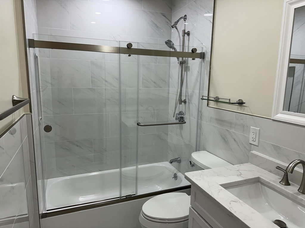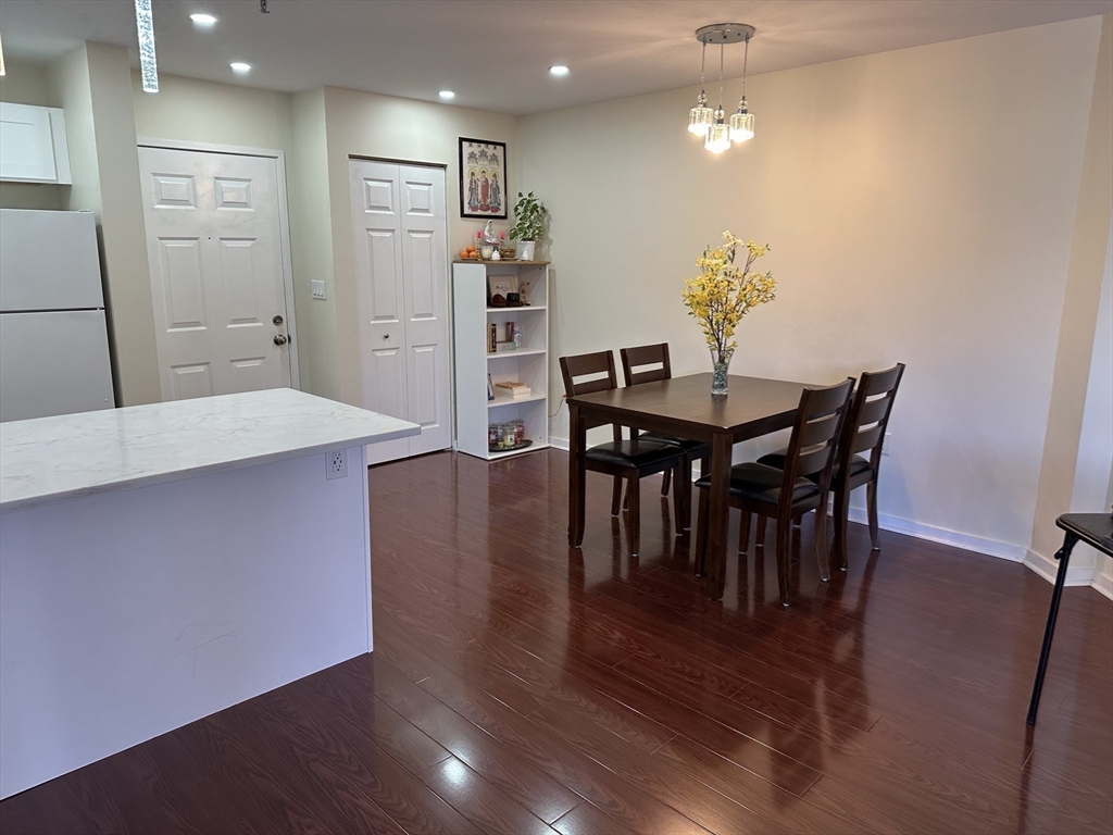 Completely remodeled residence with open floor plan featuring gleaming waterproof laminate floors throughout, with tile in bathroom. New kitchen design with quartz countertops and backsplash with penisula for seating. Radiant cooktop installed and new dishwasher. Separate dining area open to living space with slider to balconly. Luxury bath and new stackable washer dryer outside of your bedroom. Bedroom offers recessed lighting, 3 closets and access to balcony as well. You have extra storage and garage parking. Also, amenities include a large fitness room, sauna and steam and outdoor swimming pool. Conveniently located near N Quincy T, Wollaston beach, Marina Bay and highway.