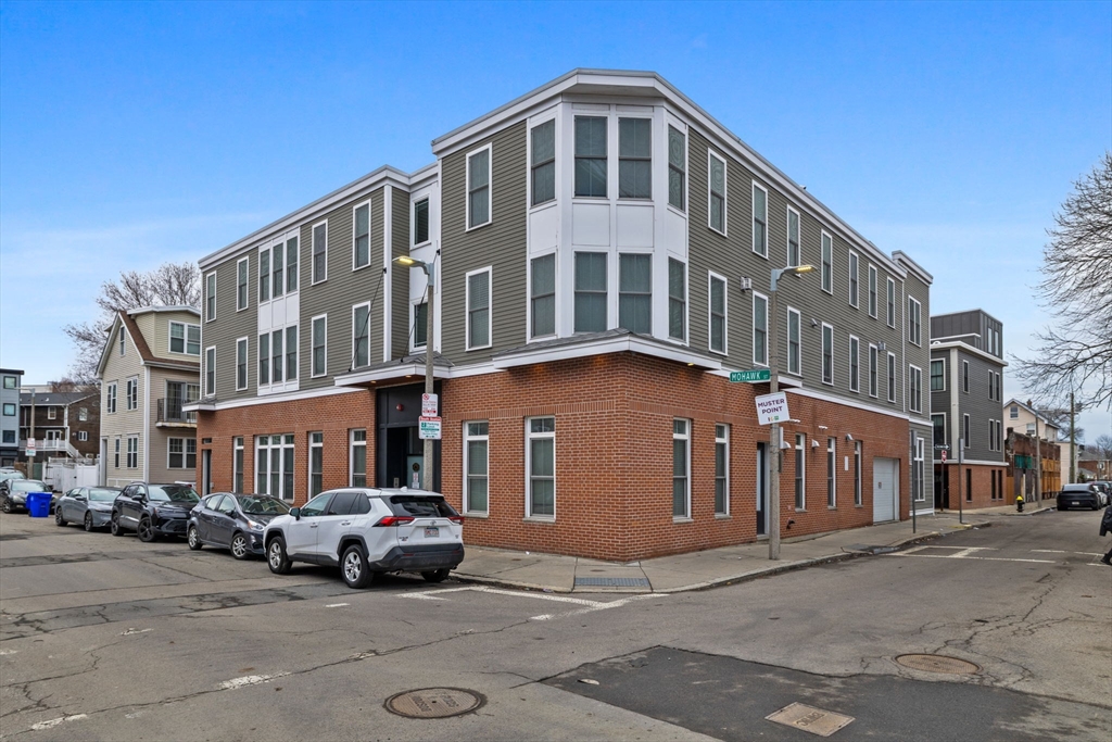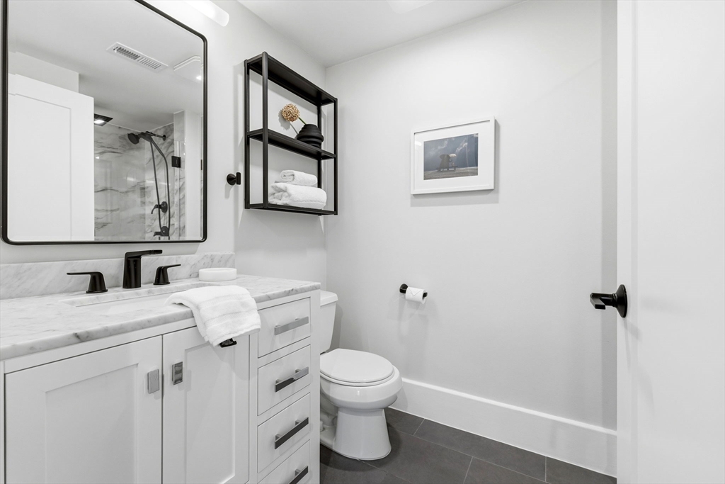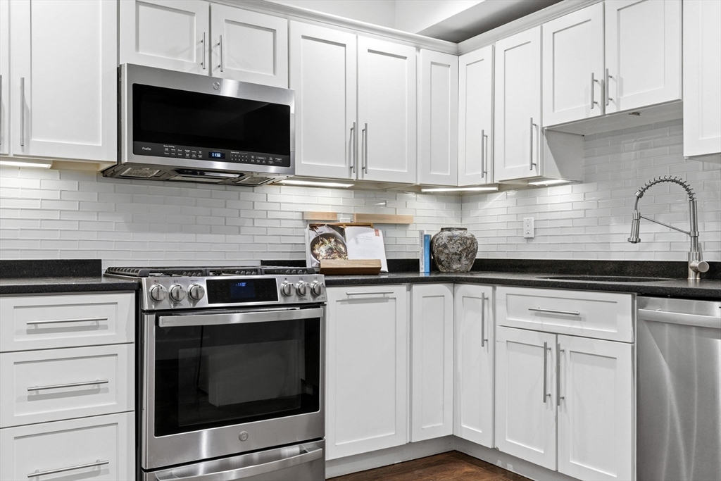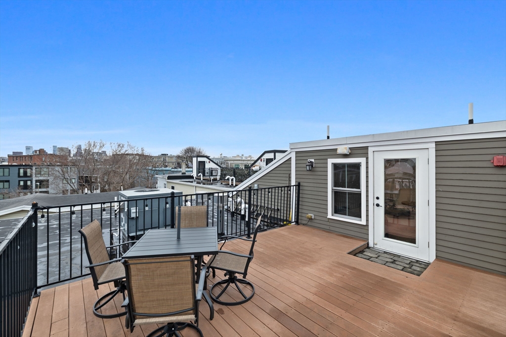 Exceptional penthouse 2-bed + den, 2-bath offering with oversized private roof terrace boasting sprawling city skyline views. Beautiful oak hardwood floors, oversized windows, recess lighting, and speaker system throughout. The gourmet eat-in kitchen boasts modern stainless appliances, 5-burner gas range, white custom cabinetry, and dark granite countertops. Thoughtfully designed living/dining area with handsome gas fireplace. Luxurious primary suite, complete with a modern vanity bathroom, walk-in closet and custom built-ins. Perfect second bedroom with large closet, exquisite wainscotting and private balcony. Upper level offers a rare, fully equipped den and wet bar with sink, minifridge, abundant cabinetry and massive 270+ sqft walk-out roof terrace with lighting. This rare and versatile layout comes with 320+ sqft of private storage space and one garage spot. Minutes to Andrew Square T, Carson Beach, South Bay, and i93. Professionally managed, pet friendly.