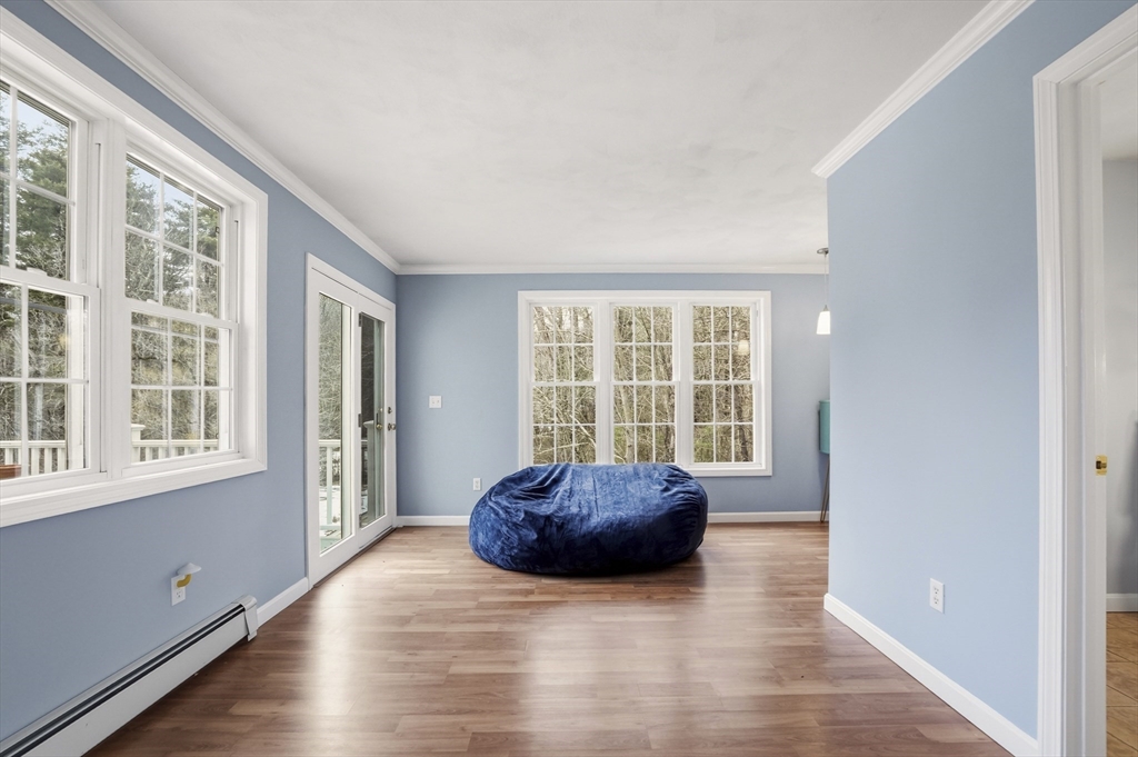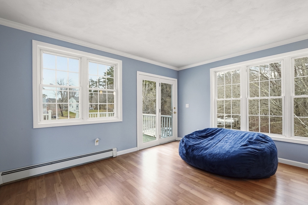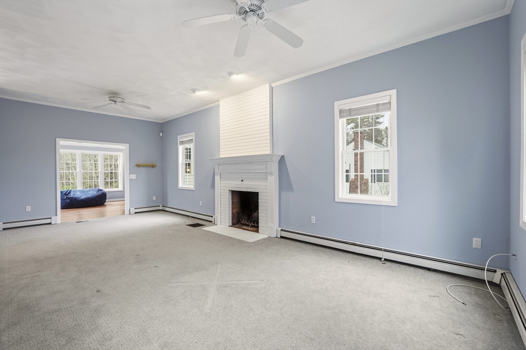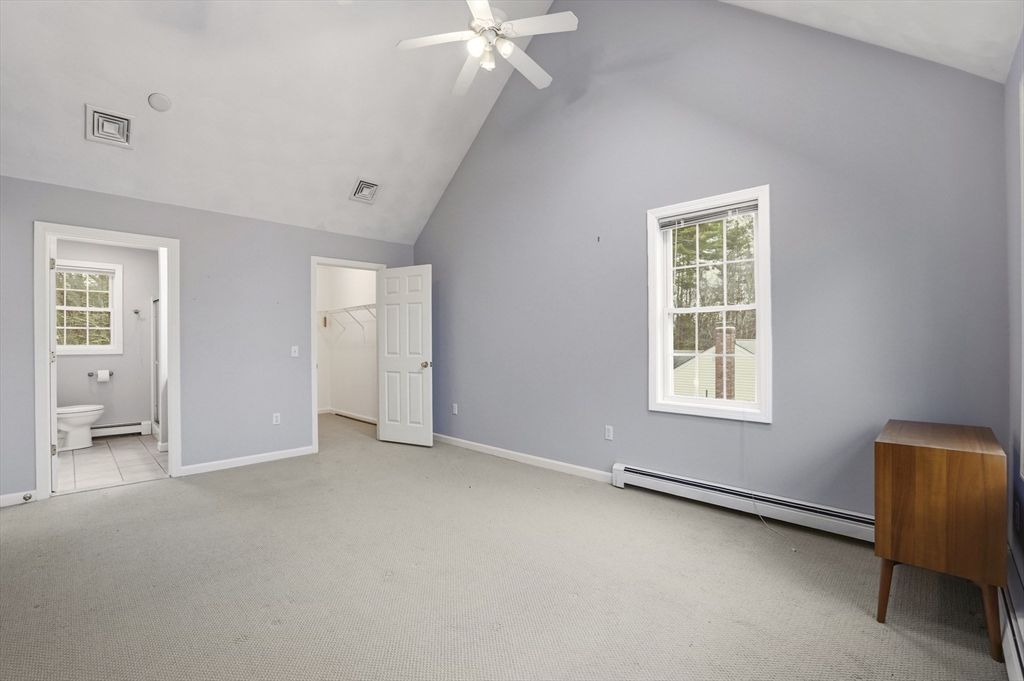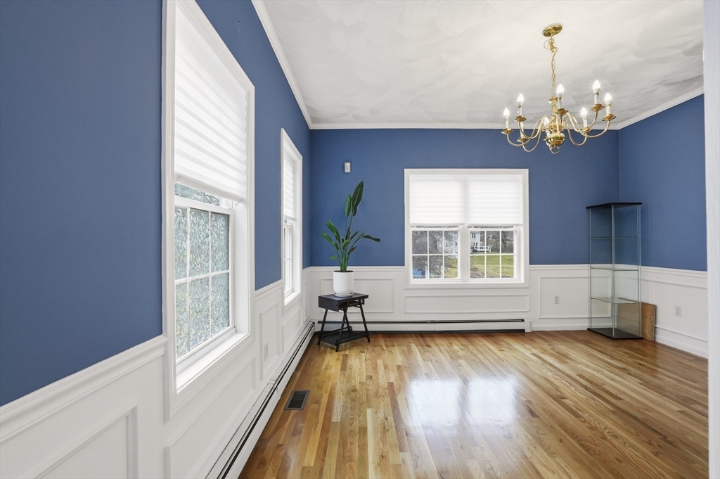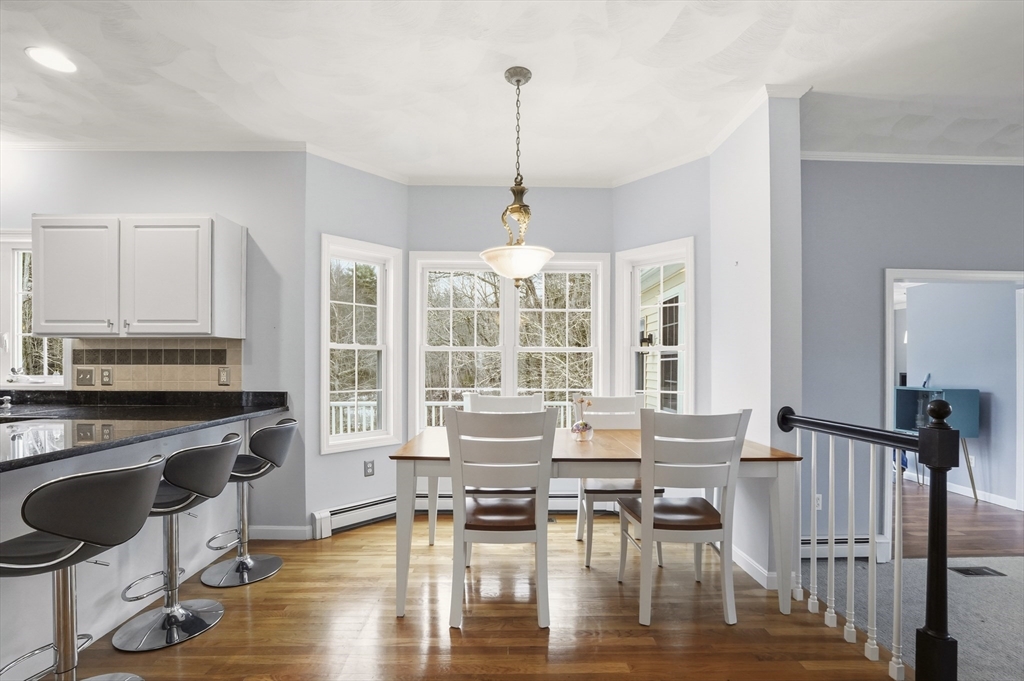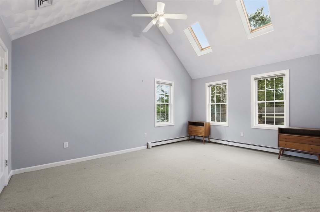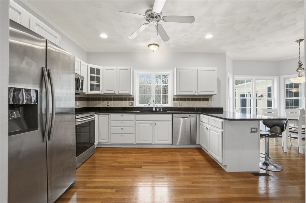 Southwest-facing Contemporary Colonial offering great space and natural light. A dramatic two-story foyer with center staircase and Palladian window creates an impressive entry. The sunken living room features a whitewashed brick fireplace with custom wood mantel. The updated kitchen includes granite countertops, peninsula seating, stainless appliances, tiled backsplash, and dining area, with an adjacent formal dining room perfect for entertaining. A bright den or home office with half bath and exterior access to the deck adds flexible living space. Upstairs offers three bedrooms, including a spacious primary suite with vaulted ceilings, skylights, walk-in closet, and private bath. Additional highlights include central air, partially finished basement, two-car garage, irrigation system, and storage shed, on a half-acre lot with conservation land in the back, ensuring peaceful privacy. Roof and AC are original, heating system and hot water heater are brand new.