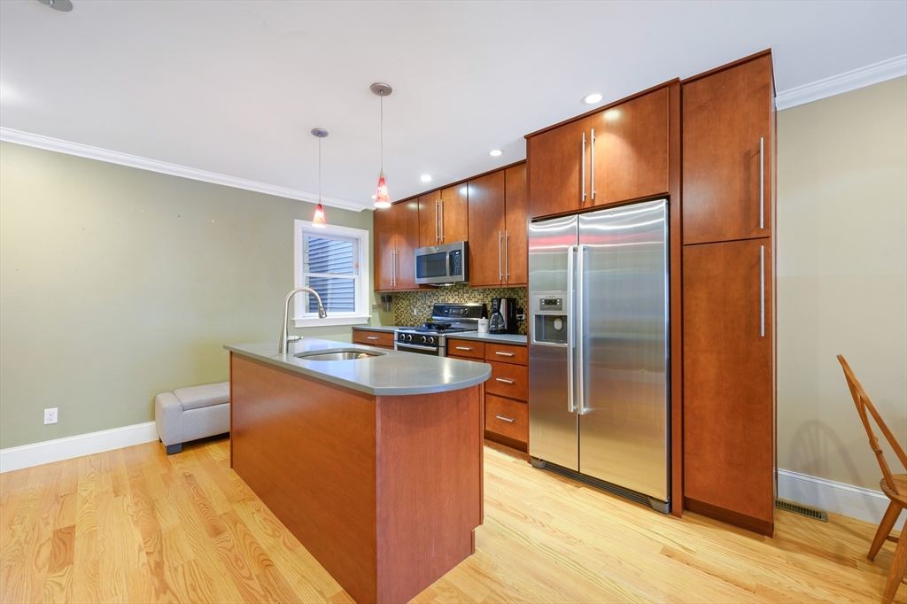 West Side 2-bedroom condo just minutes from South Boston’s best restaurants, shops and parks. Ideally located with Andrew Square Station less than half a mile away and West Broadway Station just under a mile. Built in 2009, this home offers a smart open layout with two spacious bedrooms and one bathroom with 2 showers! The eat-in kitchen features quartz countertops, a large center island with sink, stainless steel appliances, and gas cooking. Gleaming hardwood floors, recessed lighting, and crown molding add warmth and character throughout the living room and hallways. Additional highlights include coat and linen closets, central A/C, in-unit washer and dryer, and a private rear deck. A major bonus is the approximately 400 square feet of private basement bonus space with a french drain, ideal for storage or future finishing potential. Low condo fees and a well-maintained building make this a perfect 1st time condo or investment.