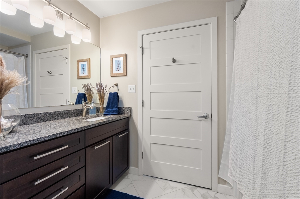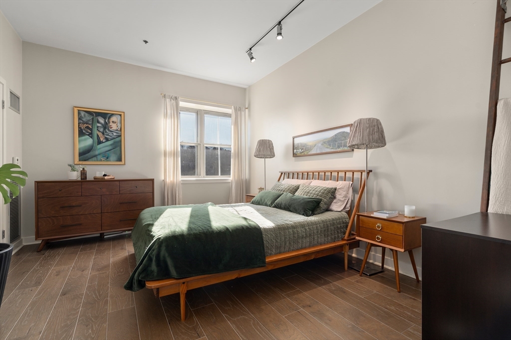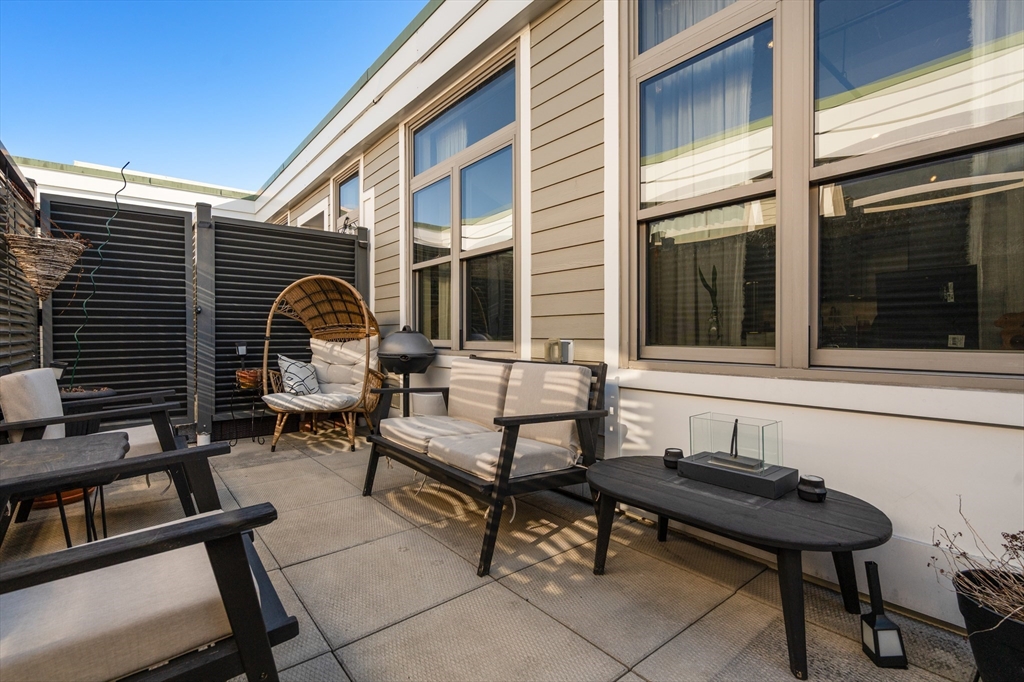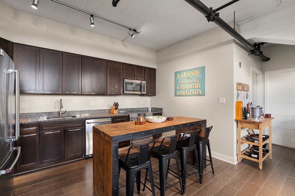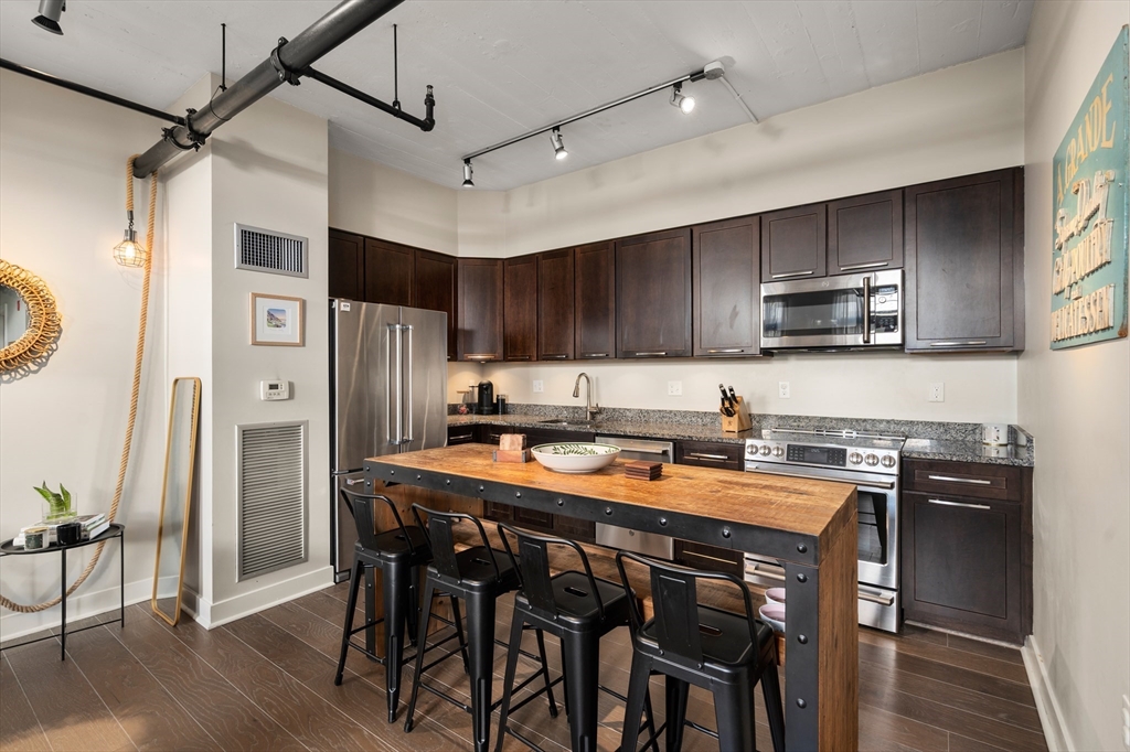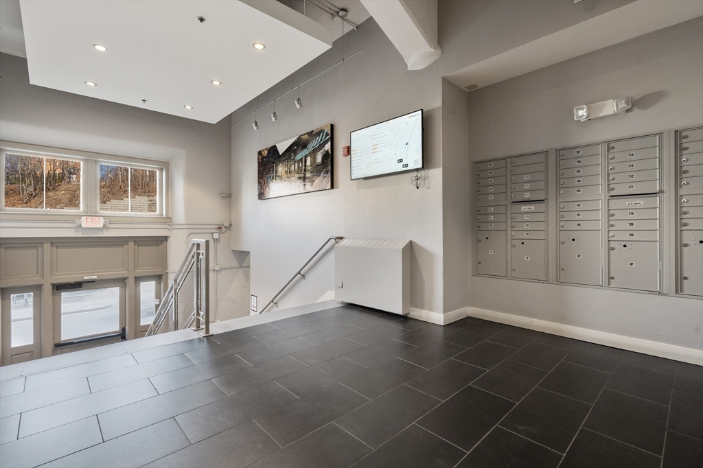 Penthouse living at Oliver Lofts. Perched atop this brick Georgian Revival, which appears on the National Register of Historic Places, we find this airy contemporary loft with two bedrooms and two baths. The great room features oversized windows, direct access to the private roof terrace, and an open kitchen with richly toned wood cabinetry, granite counters, and a suite of stainless steel appliances. There is a large primary suite with two walk-in closets, and a custom shower with tiled bench. Additional amenities include central air, in-unit laundry, two-car garage parking spaces, and private storage. All this in an elevator building with on-site professional management that is convenient to Northeastern, Longwood Medical Center, and multiple Orange and Green line T stops.