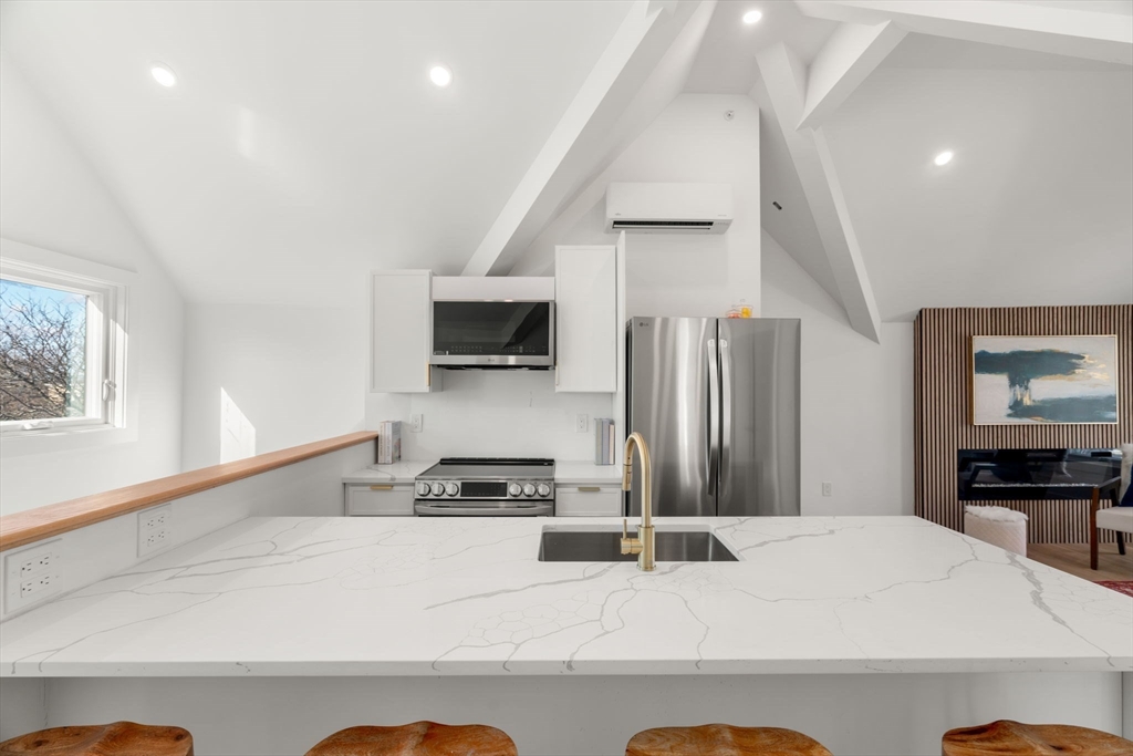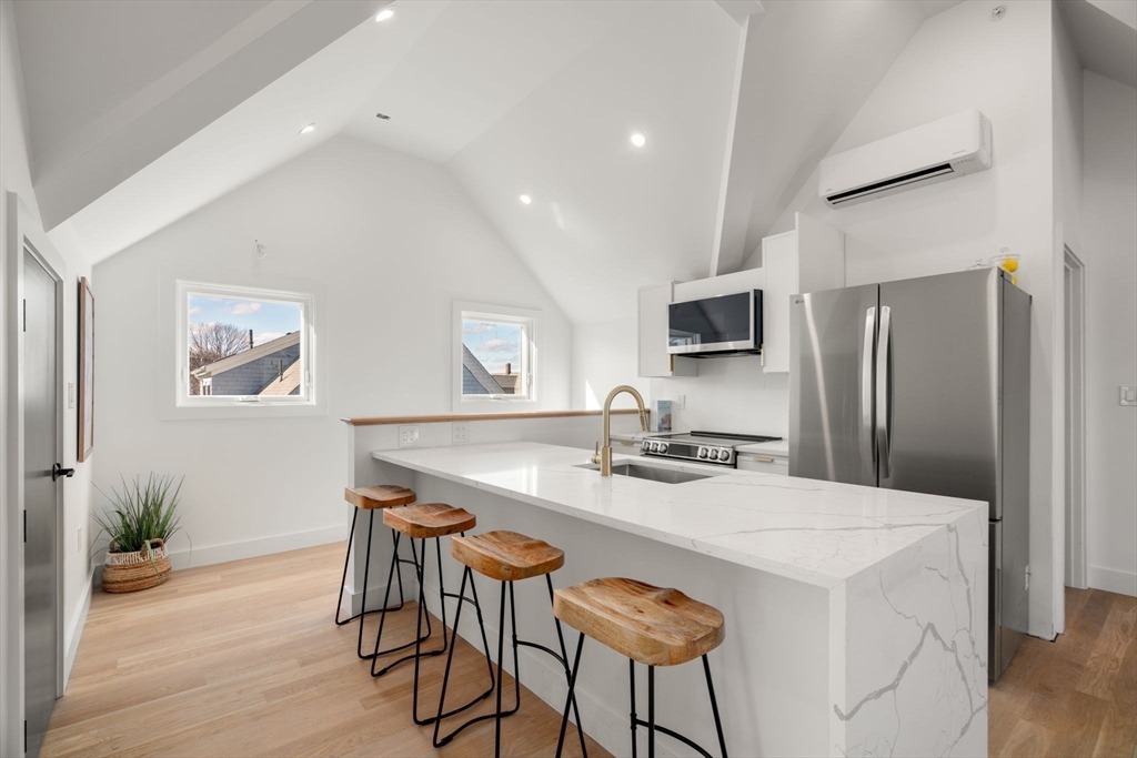 Last Unit Left in this Luxurious, brand new condo ideally located in Davis Square, just steps to vibrant shops, acclaimed restaurants, and the Red Line MBTA. This sun-filled top floor, 2-bedroom, 2-bath home offers modern living at its finest, featuring soaring vaulted ceilings and a spacious open-concept layout with a cozy fireplace.The sleek designer kitchen is beautifully appointed with quartz countertops, a center island, and stainless steel appliances,perfect for everyday living and entertaining. The primary bedroom includes a spa-like bath showcasing custom tile work and a curbless shower. Additional highlights include 2nd custom tiled full bath, in-unit laundry and a Ring doorbell for added security and peace of mind. A rare opportunity to own a turnkey home in one of Somerville’s most sought-after neighborhoods