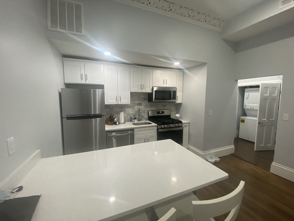 RECENTLY REMODELED 800 sqft 2 bed 1 bath in gorgeous South End brownstone building available September 1st. Apartment features: central A/C, in-unit laundry, 2 equal size bedrooms, all new modern bathroom with subway tile shower, hardwood floors throughout, and recessed lighting throughout. Kitchen has all new quartz countertops, breakfast bar island, marble backsplash and new stainless steel appliances, including dishwasher, disposal, and 5-burner gas stove. Very high ceilings and original details preserved. Walking distance to Northeastern, Berklee, the Prudential, Copley Square, and multiple T stops.
