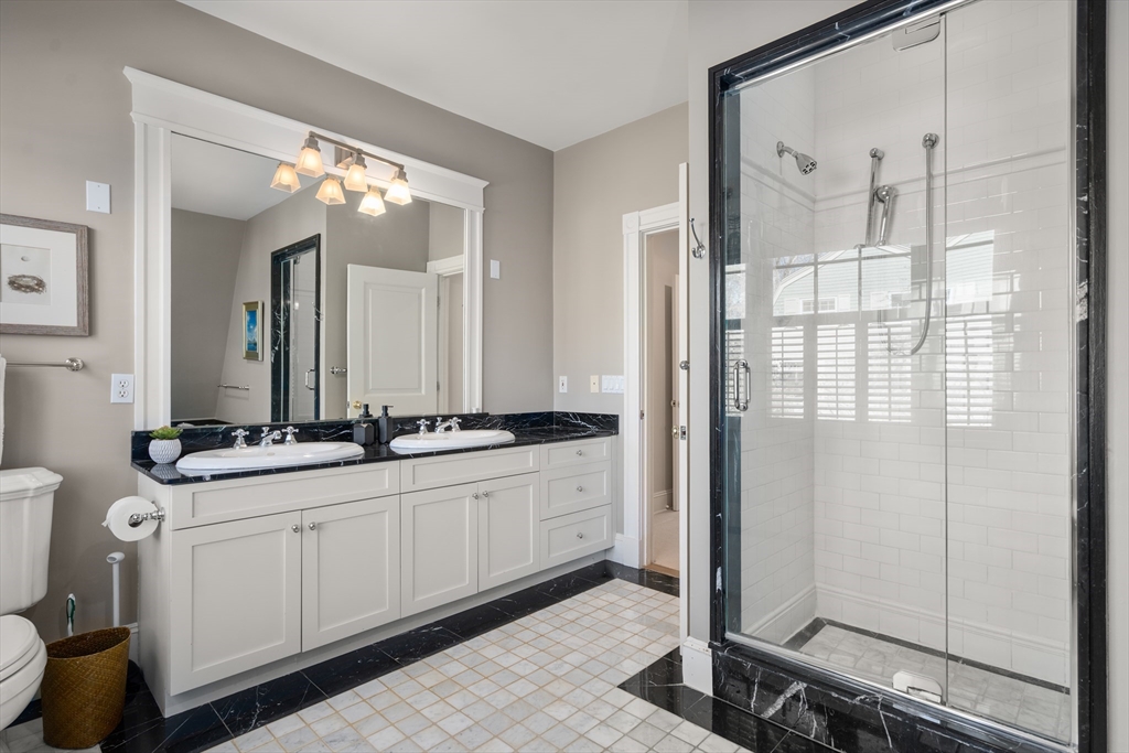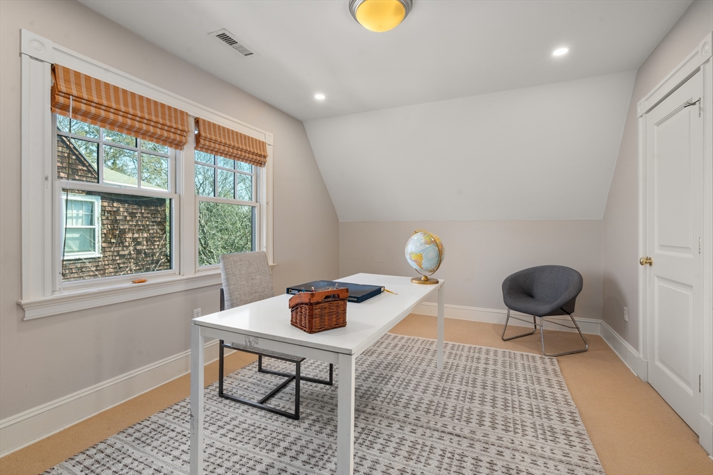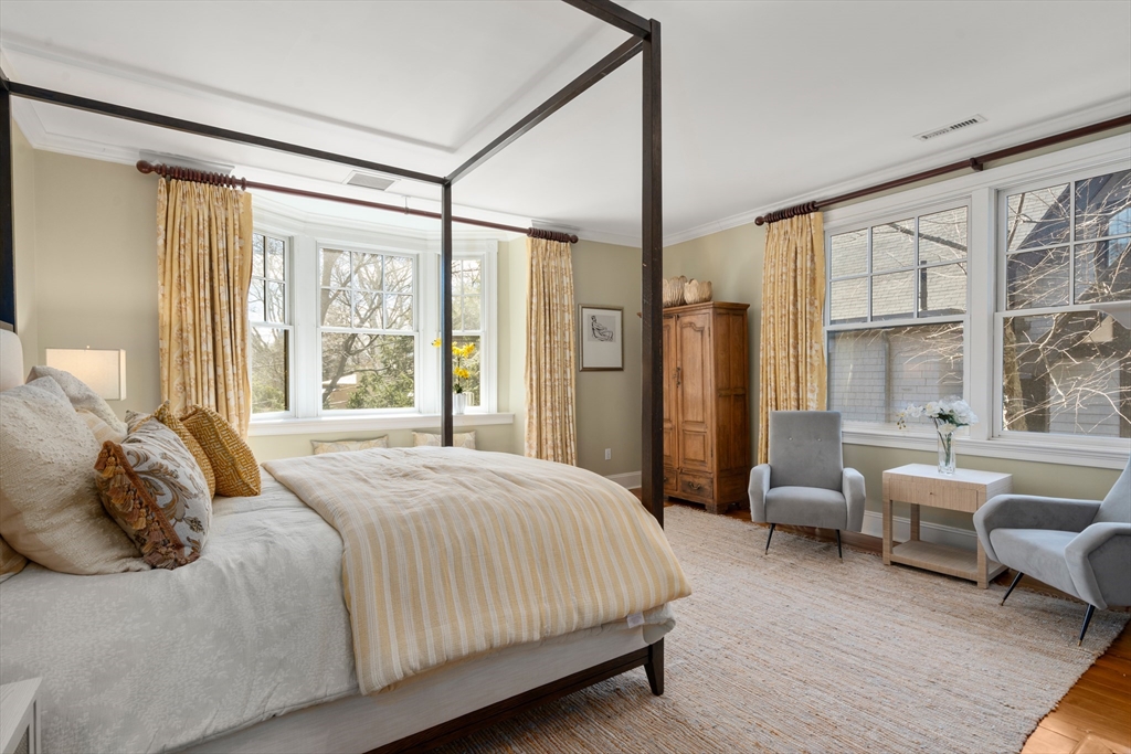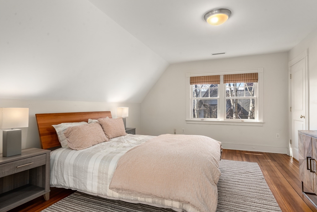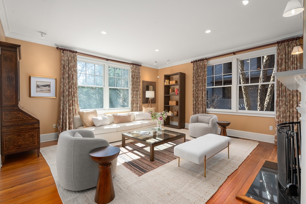 Tucked away on a pretty private way in Harvard Square, this elegant residence offers generously scaled rooms for living, working, and entertaining. A dramatic two-story foyer introduces the living room and library, each with a gas fireplace and custom built-ins. The dining room, also with a fireplace, opens through French doors to a beautifully landscaped, fenced backyard with gardens. The eat-in chef’s kitchen features high-end stainless-steel appliances and a dining area with French doors to the yard, plus a half bath on this level. Upstairs, the primary suite has a bay window, fireplace, custom walk-in closet, and four-piece bath. Two additional bedroom suites and laundry complete the second floor. The skylit top floor offers three more bedrooms and a hall bath. The lower level includes a family room, exercise studio, full bath, and second laundry room. Located just a few blocks away from the Harvard Quad and Cambridge Common. Easy access to Boston and beyond via Memorial Drive.