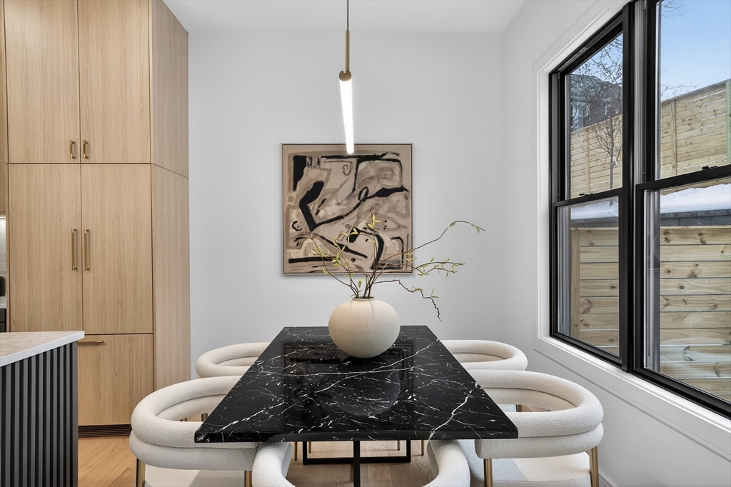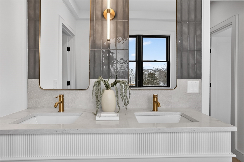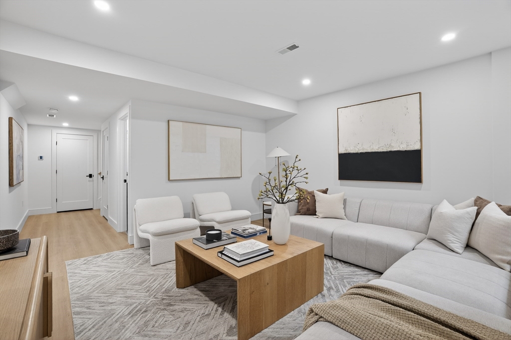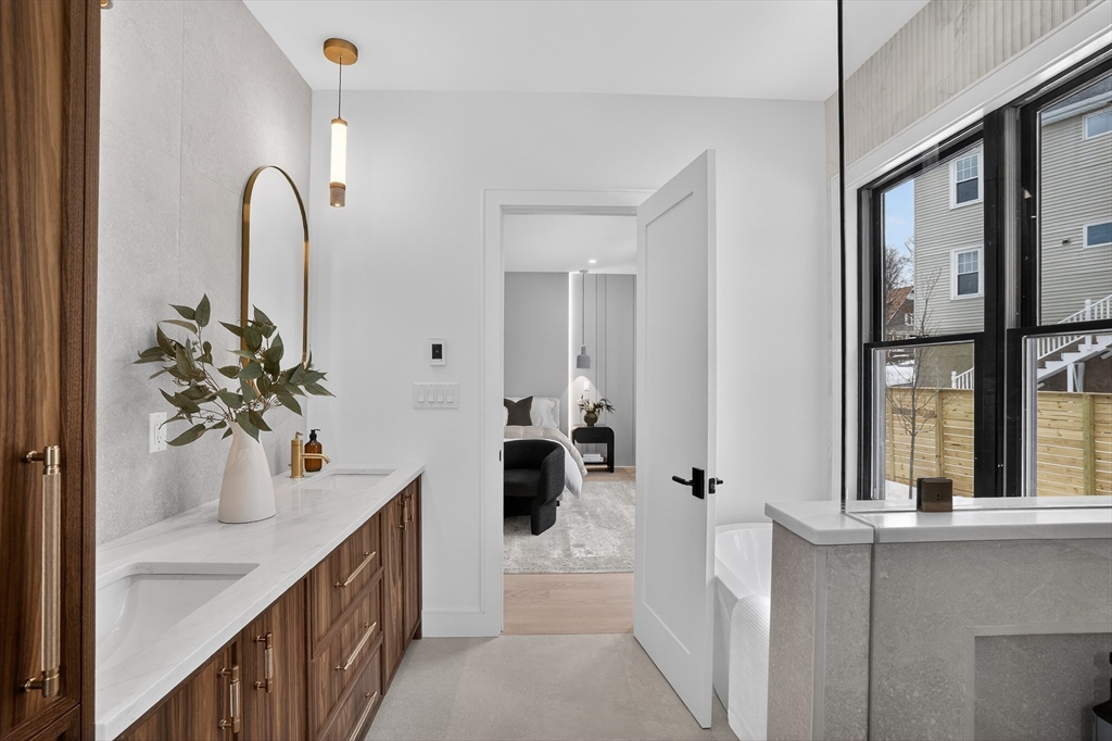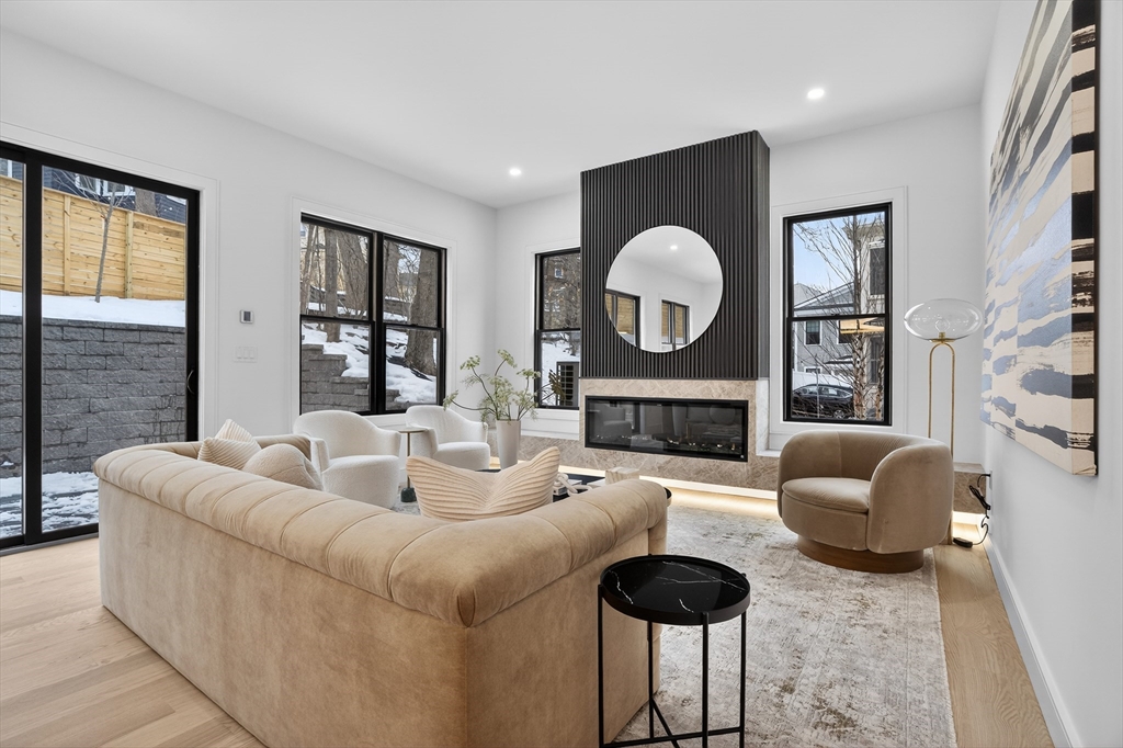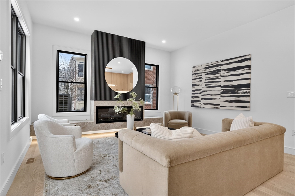 This craftsman style new construction townhome is located close proximity to Cabot School. Upon entering, you’ll find a coat closet and designer powder room with brushed brass accents. The open concept 1st floor offers many stunning features like a chef's kitchen featuring high-end appliances and gorgeous modern cabinets. The living room features a linear fireplace with wood slat wall detail accent and floating bench. There are 3 bedrooms on the 2nd level, including the primary suite with its very own walk-in closet and a gorgeous spa-like ensuite bathroom with soaking tub and walnut custom cabinetry. A full bathroom and laundry complete this level. The fully finished 3rd floor gives you bonus space with large windows. The lower level is the perfect place to turn into a gym, movie room, or playroom, and has a private bedroom with a full bathroom perfect for your guests or an office. Conveniently located in close proximity to Newtonville Village Center, the commuter rail, and 90/95.
