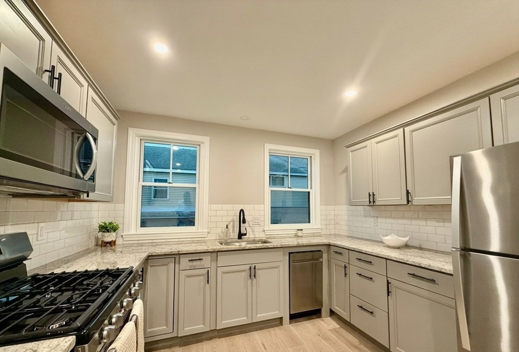 This meticulously updated 2-bedroom, 2-bathroom unit in Chelmsford exudes luxury and modern elegance. The generously sized bedrooms are bathed in natural light, featuring recessed lighting and expansive closet space. The stunning eat-in kitchen is a true focal point, with sleek gray cabinetry, a custom tile backsplash, and pristine granite countertops, complemented by high-end stainless steel appliances, including a gas stove, microwave, dishwasher, and refrigerator. Both bathrooms are outfitted with luxurious heated floors, creating a spa-like experience. Additional upscale amenities include an in-unit stacked washer and gas dryer, high-efficiency electric heat pump for heating and cooling, and a shared side porch. With two dedicated parking spaces and ample guest parking, this sophisticated home offers the ultimate in comfort and convenience for effortless, high-end living.