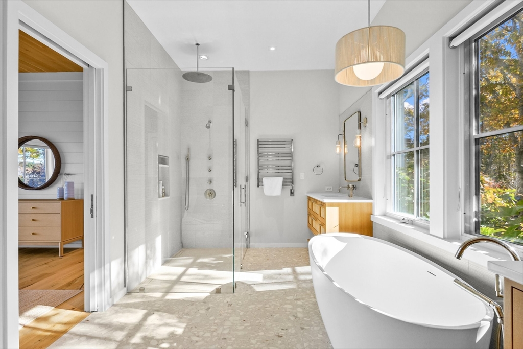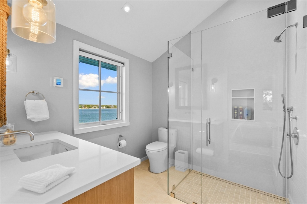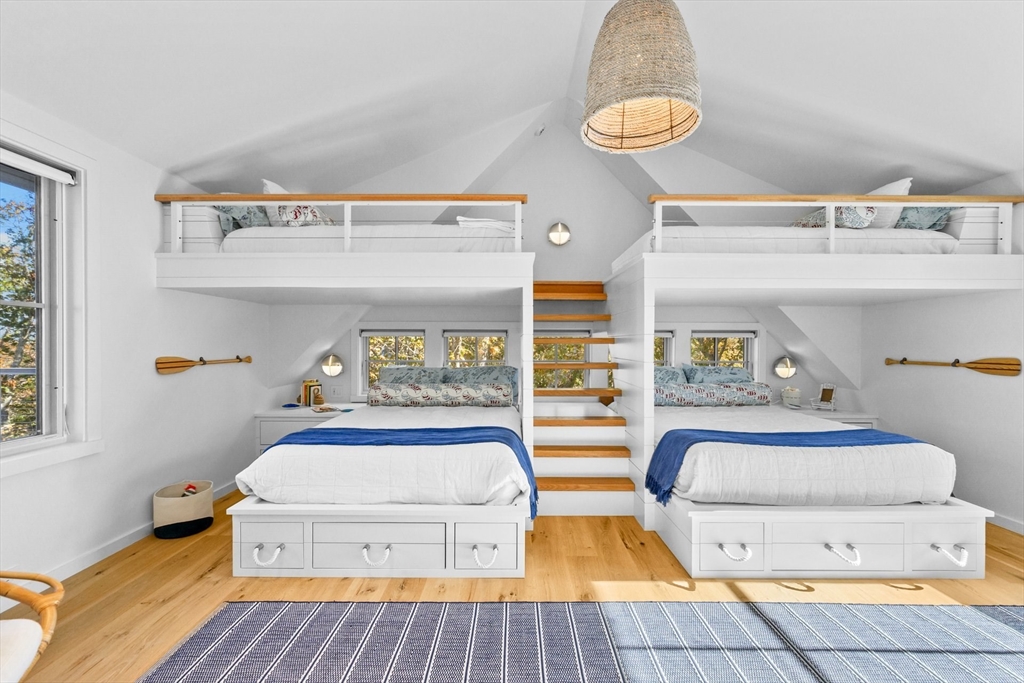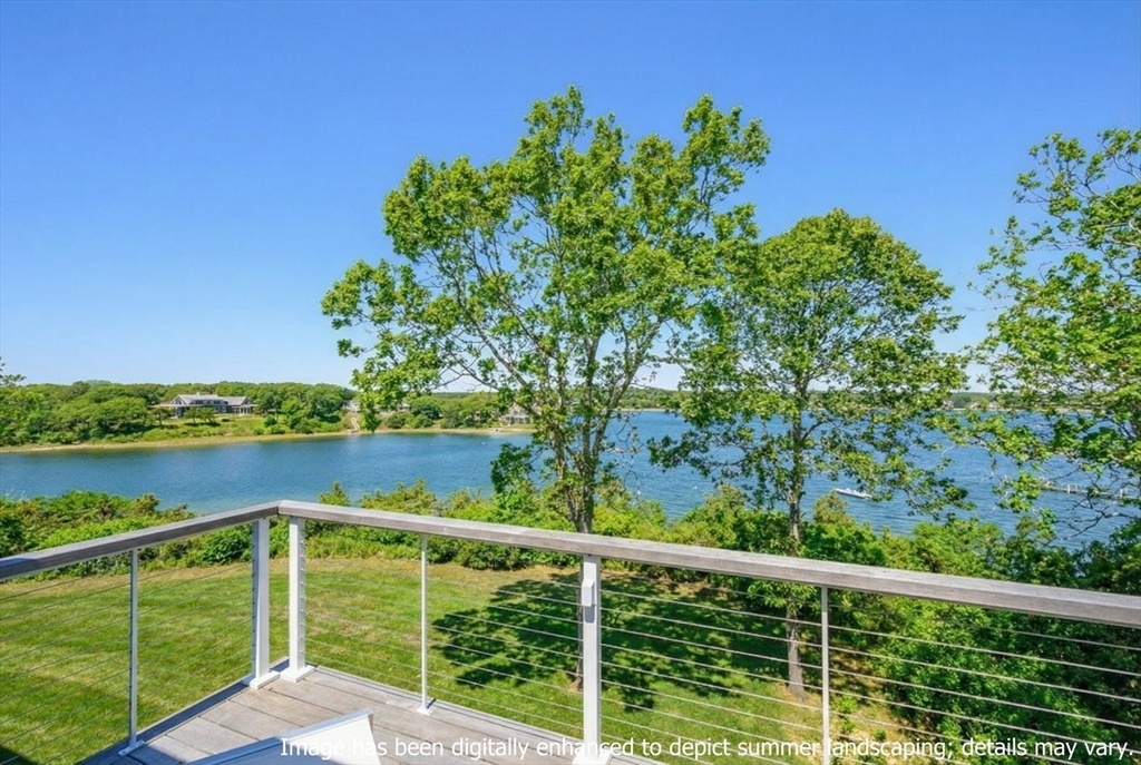 Nestled above the shimmering waters of Bassing Harbor, this extraordinary waterfront retreat was conceived through a multi-year collaboration with Salt Architecture, LaBarge Homes, and Martha’s Vineyard Interior Designs. Walls of glass frame sweeping views and fill the home with natural light, while indoor and outdoor spaces flow seamlessly to expansive decks, terraces, and a resort-style pool area. The main living spaces balance comfort and sophistication with warm wood floors, curated finishes, and multiple gathering areas, including a lower level with a glass-enclosed wine room, custom bar, game area, and media lounge. The kitchen features sleek cabinetry, open shelving, and picture windows overlooking the landscape, while bedrooms serve as private retreats complemented by spa-quality baths. Outside, panoramic water views unfold as a private stairway leads to the shoreline. A detached two-car garage with a guest suite above adds flexibility, completing this exceptional offering.