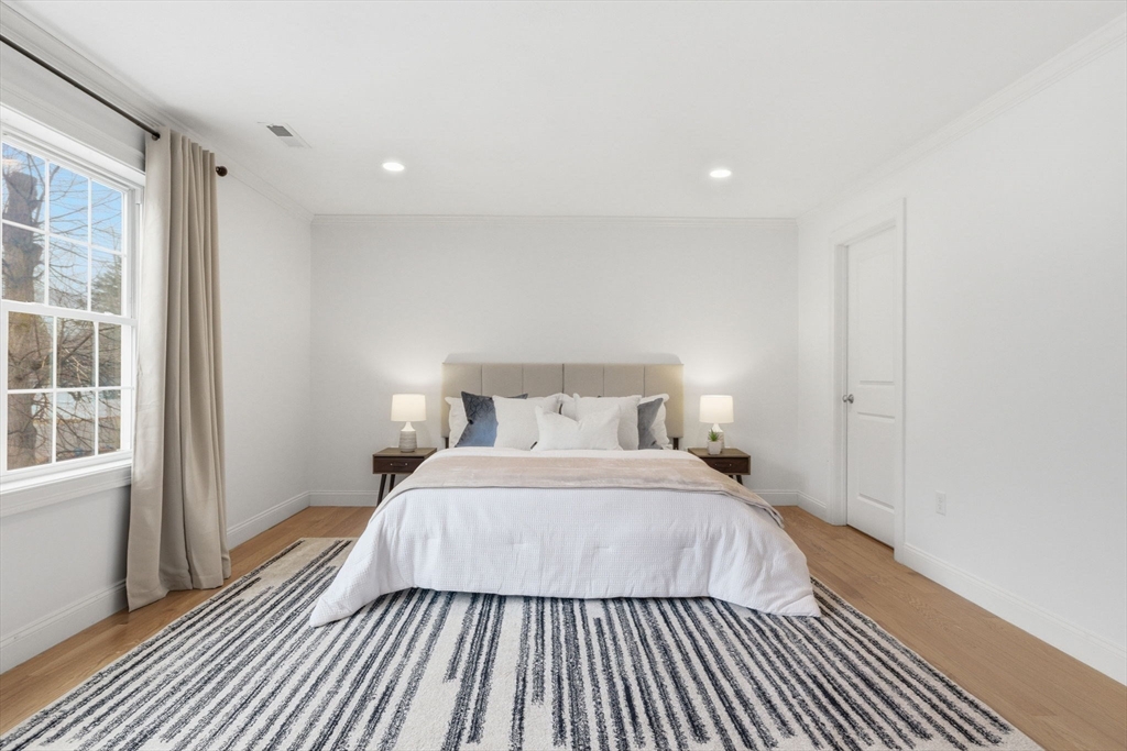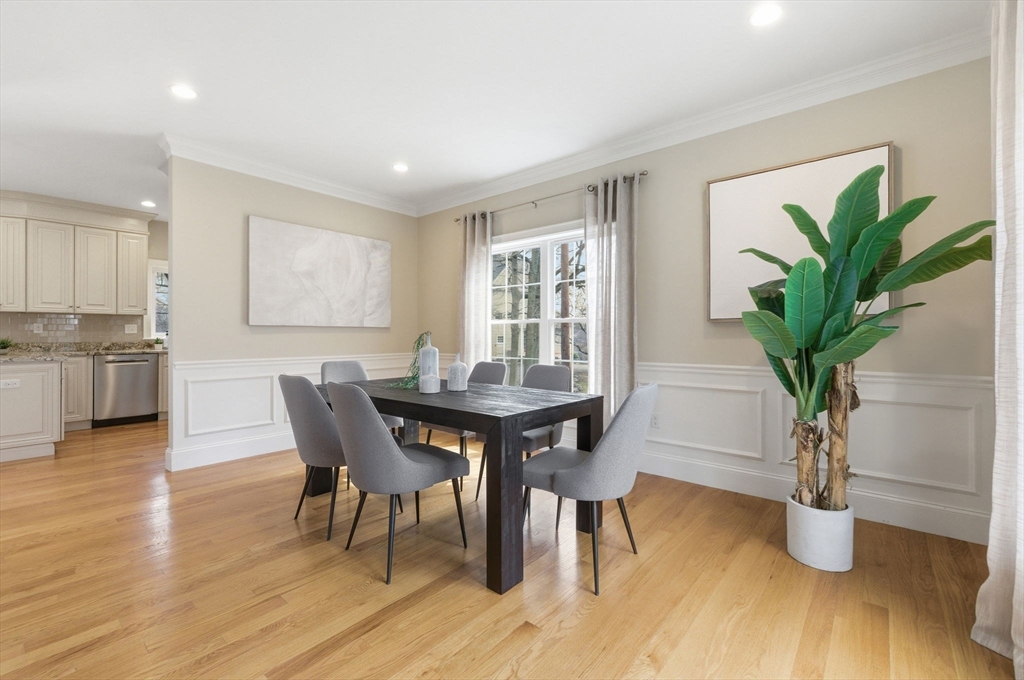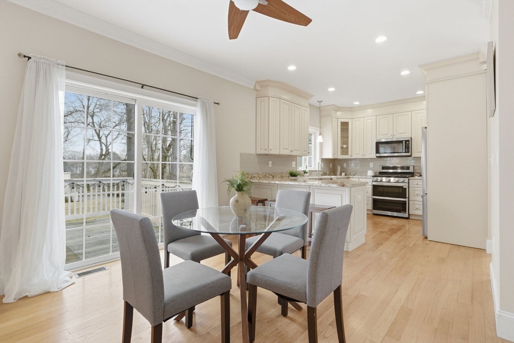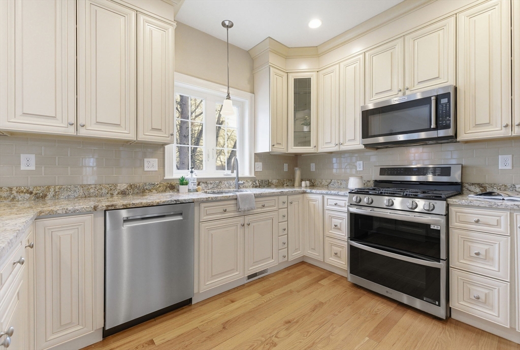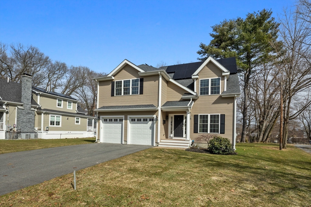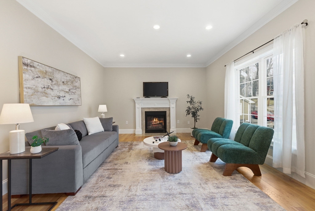 This stunning 4-bedroom, 2.5-bath colonial home features 9' ceilings, crown molding, recessed lighting, and hardwood flooring throughout. The state-of-the-art kitchen is equipped with glazed soft-close cabinetry, granite countertops, and stainless steel appliances. From the dining area, a slider leads to an expansive backyard with beautiful views of Gleason Pond. The family room offers a relaxing space with a gas fireplace and custom mantle. The spacious master suite includes a large walk-in closet and a luxurious bathroom featuring a double-sink marble vanity, a glass-door shower, and a separate tub. Additional highlights include owned solar panels for energy savings, professional landscaping with irrigation, and a prime location just minutes from shopping, restaurants, and the commuter rail. This is a must see!