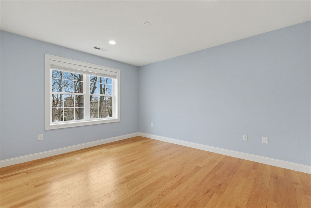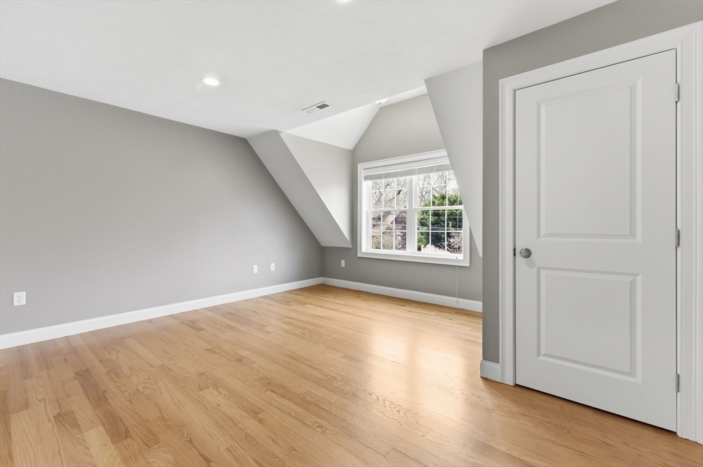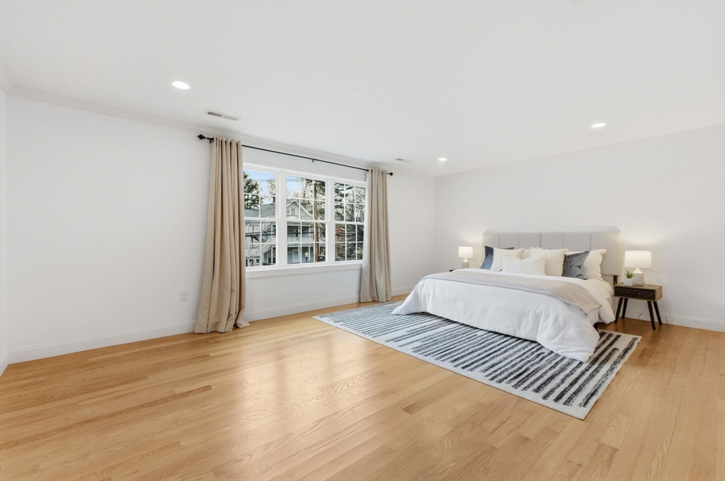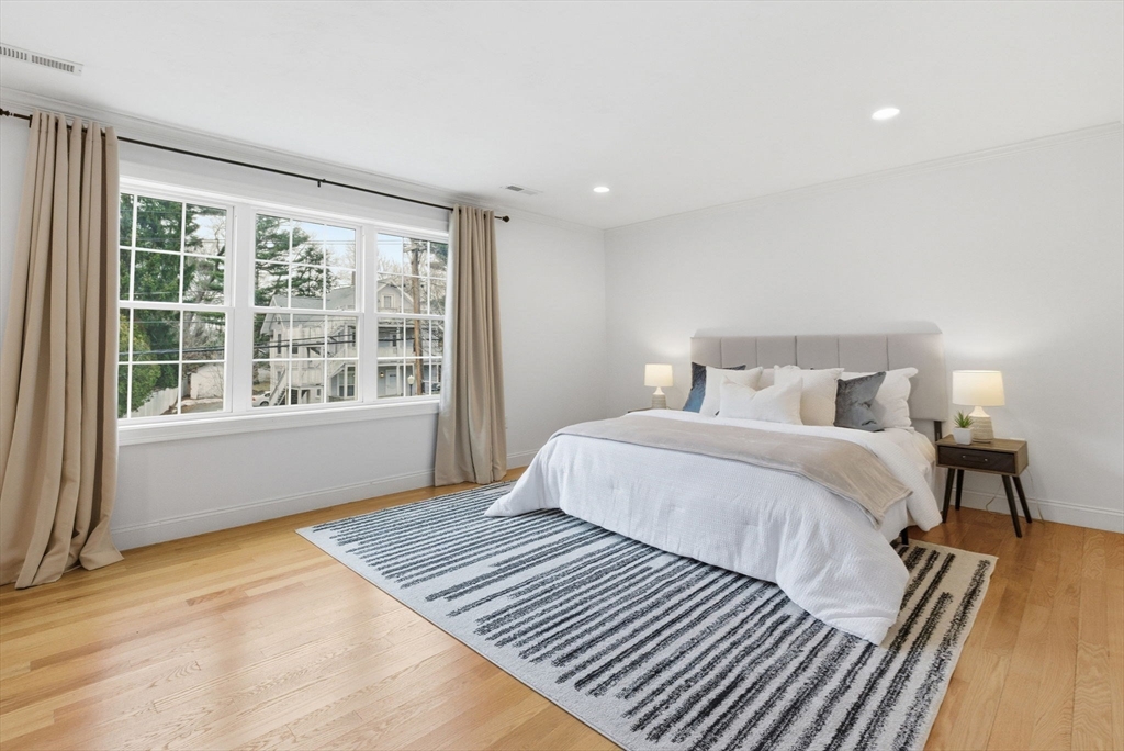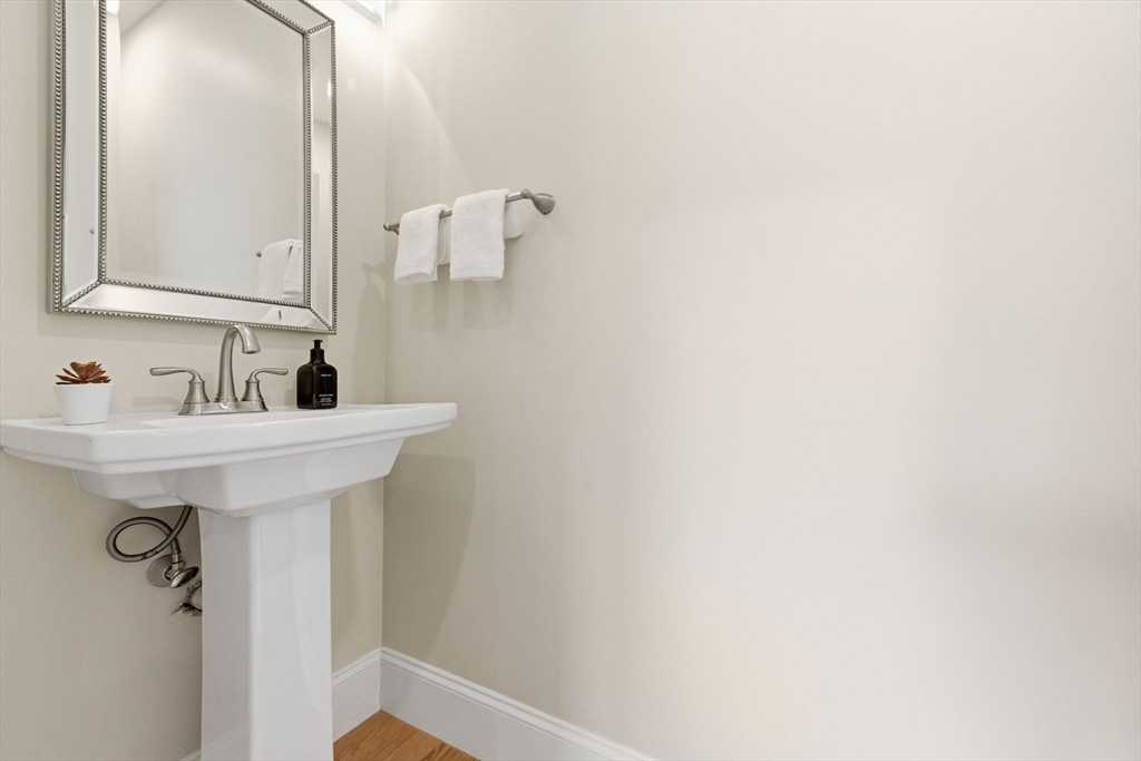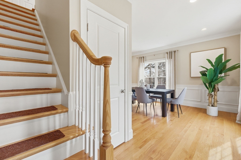 This stunning 4-bedroom, 2.5-bath colonial home features 9' ceilings, crown molding, recessed lighting, and hardwood flooring throughout. The state-of-the-art kitchen is equipped with glazed soft-close cabinetry, granite countertops, and stainless steel appliances. From the dining area, a slider leads to an expansive backyard with beautiful views of Gleason Pond. The family room offers a relaxing space with a gas fireplace and custom mantle. The spacious master suite includes a large walk-in closet and a luxurious bathroom featuring a double-sink marble vanity, a glass-door shower, and a separate tub. Additional highlights include owned solar panels for energy savings, professional landscaping with irrigation, and a prime location just minutes from shopping, restaurants, and the commuter rail. This is a must see!
