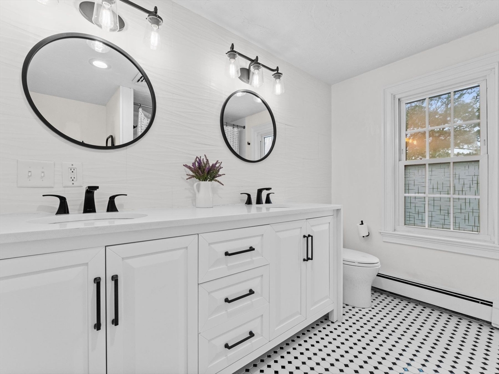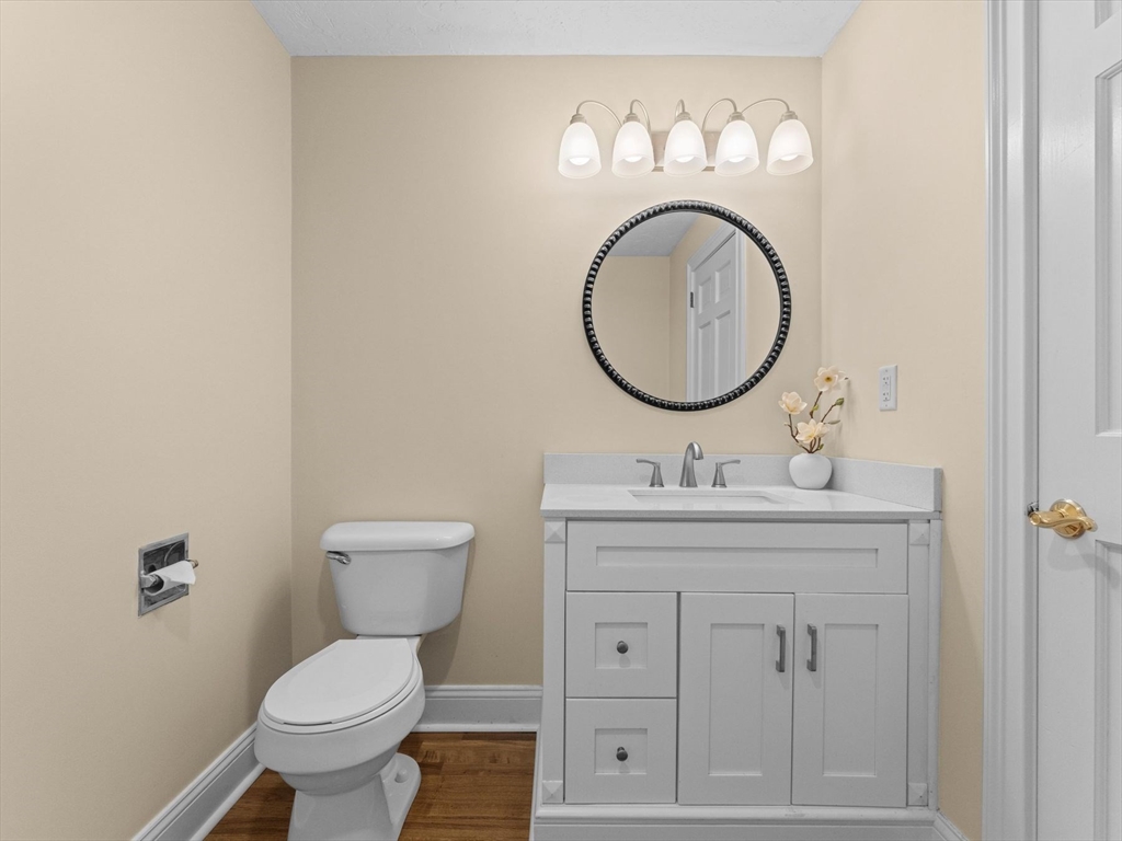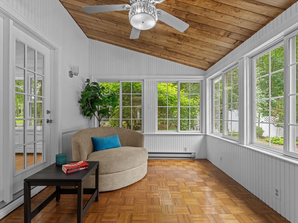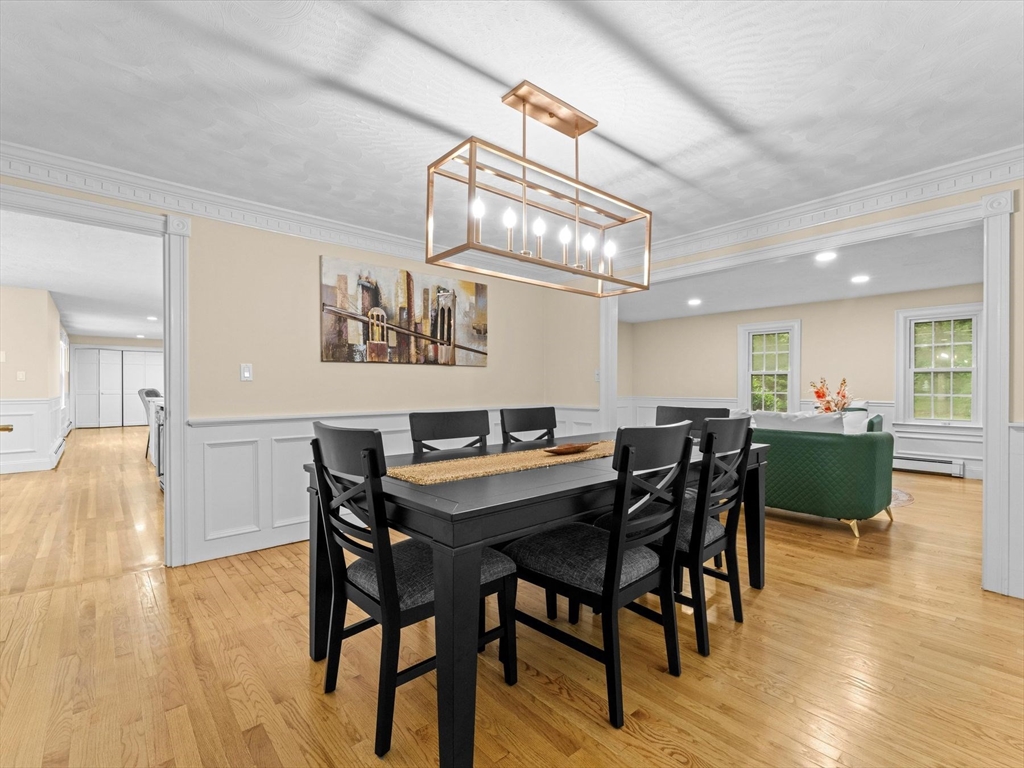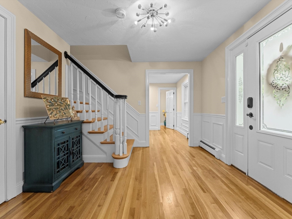 This EAST FACING Custom, Hip roof Colonial with FRESH INTERIOR PAINT (2025), offers spacious rooms and elegant details like chair rails, crown molding, and wainscoting. RENOVATED Eat-in Kitchen (2022) with island, BRAND NEW HARDWOOD FLOORS, and peninsula which opens to a cozy family room with a wood stove insert and a heated sunroom—ideal for entertaining. In addition there are Hardwood floors in the family, living, and dining rooms; BRAND NEW HARDWOOD FLOORS in the foyer & half bath; from the garage you enter into a tiled mudroom. Expansive primary suite features vaulted ceiling, walk-in closet, private deck with backyard access, and en suite bath with double sinks, NEW SOAKING TUB, skylight, updated tiled shower and BRAND NEW CERAMIC TILED FLOORS. Finished lower level boasts a bar area, projector screen, and half bath. Enjoy the outdoors with an in-ground pool with NEW VINYL LINER (2024), seasonal poolside half bath, landscaped gardens, and generous space for recreation.