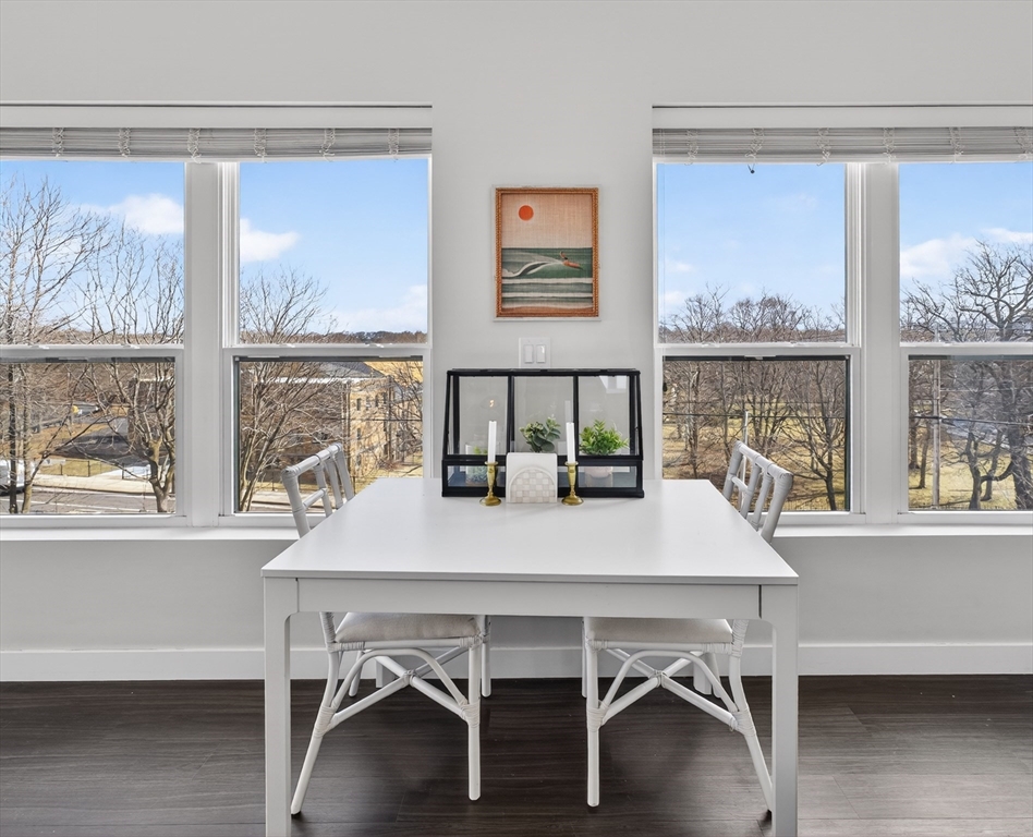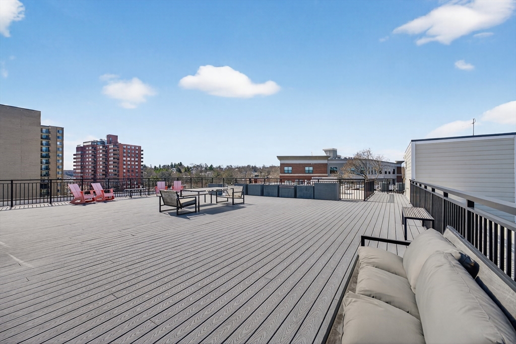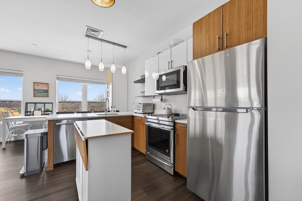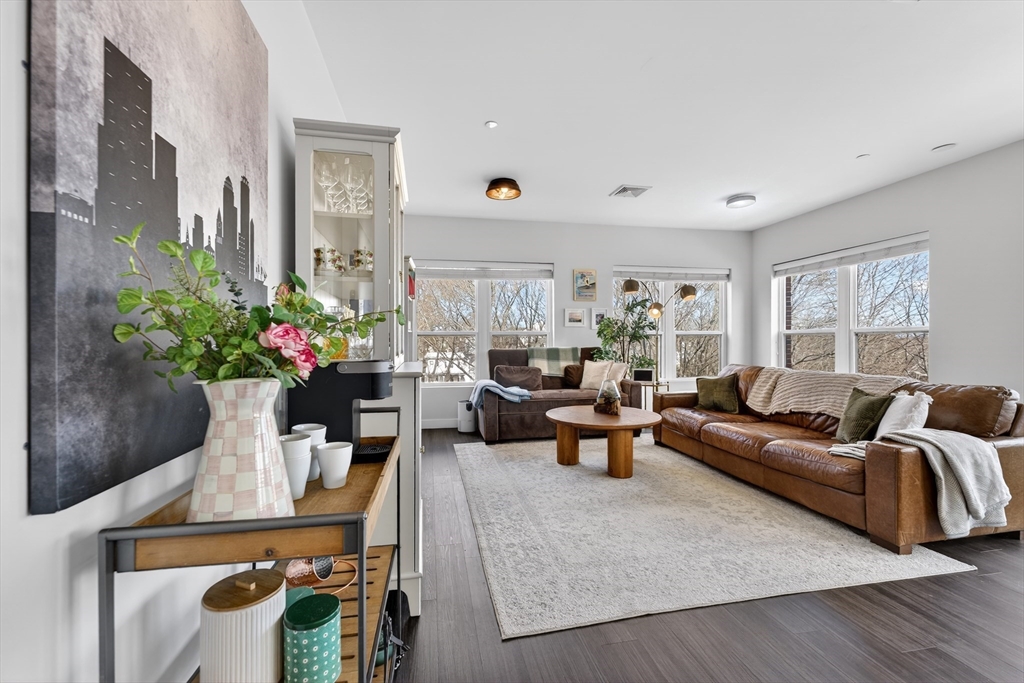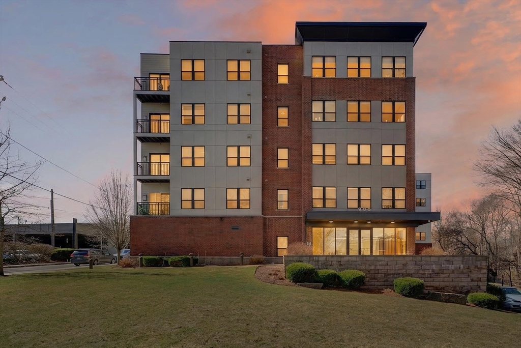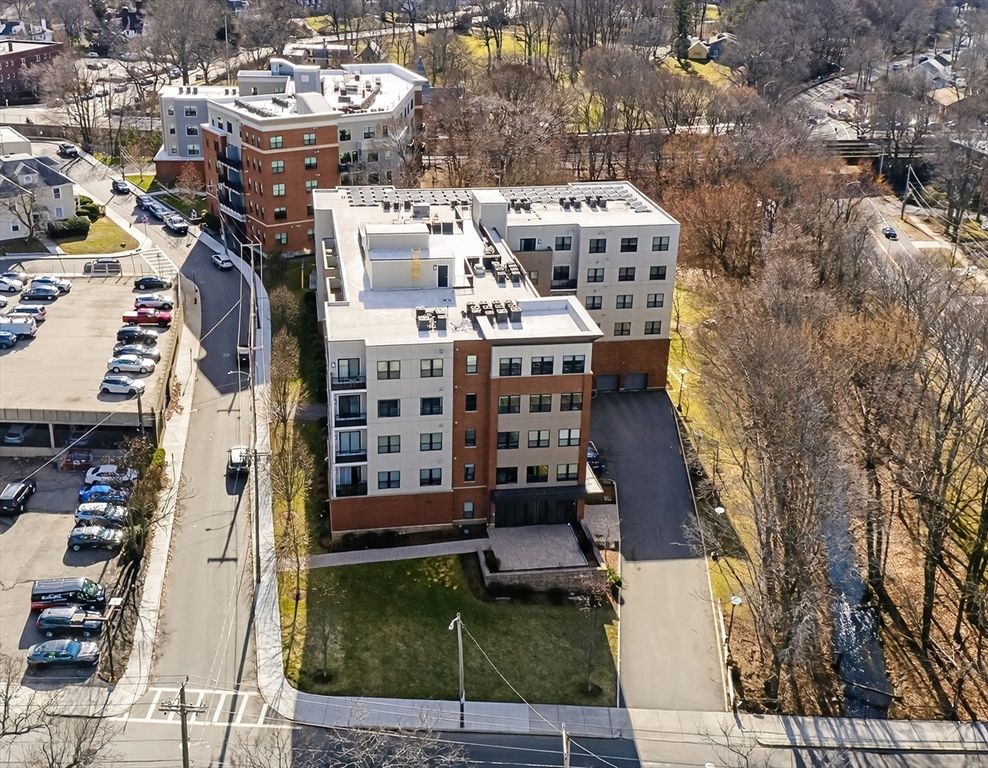 Welcome to the Residences at Brookside. A luxury Condominium building ideally situated steps from Quincy Center. This sun-filled two-bedroom two-bathroom corner unit has amazing natural light with two exterior walls of windows overlooking Furnace Brook. This modern layout offers a great entertaining space with dark-stained engineered oak floors, stainless steel appliances and stone counters. Spacious master suite with custom designed walk-in closet and finely appointed bath. Building amenities include a full gym, yoga studio, club room, common courtyard with grilling area and an expansive roof deck with city and ocean views. This Residence comes with two-deeded garage parking spaces!