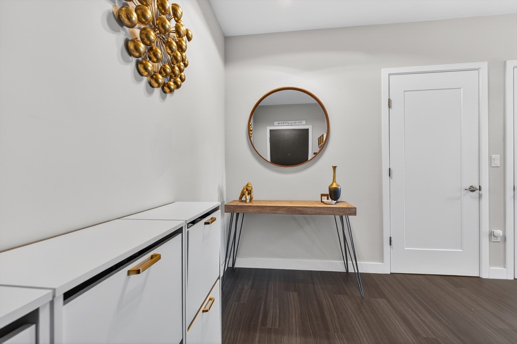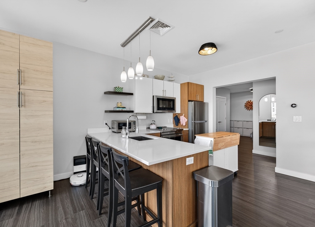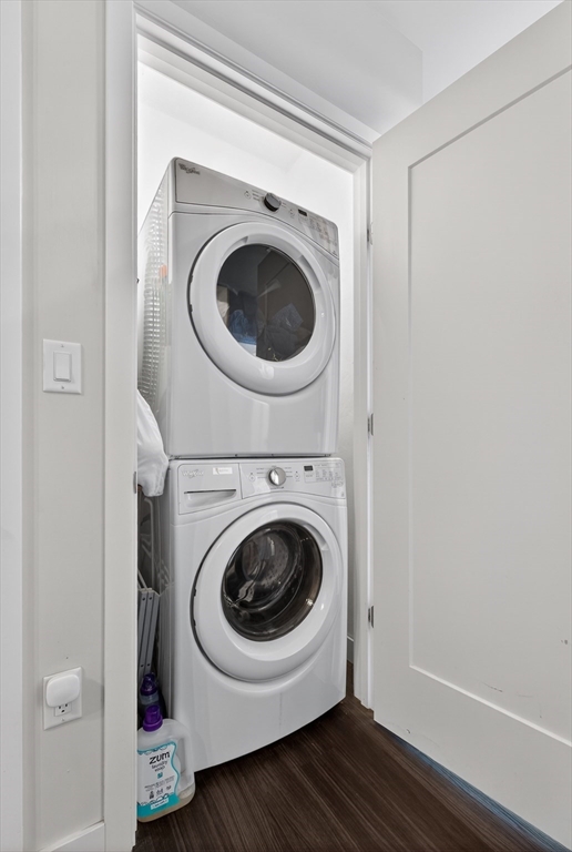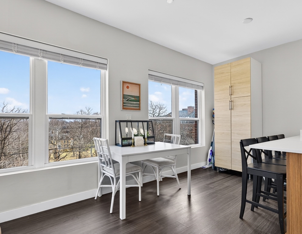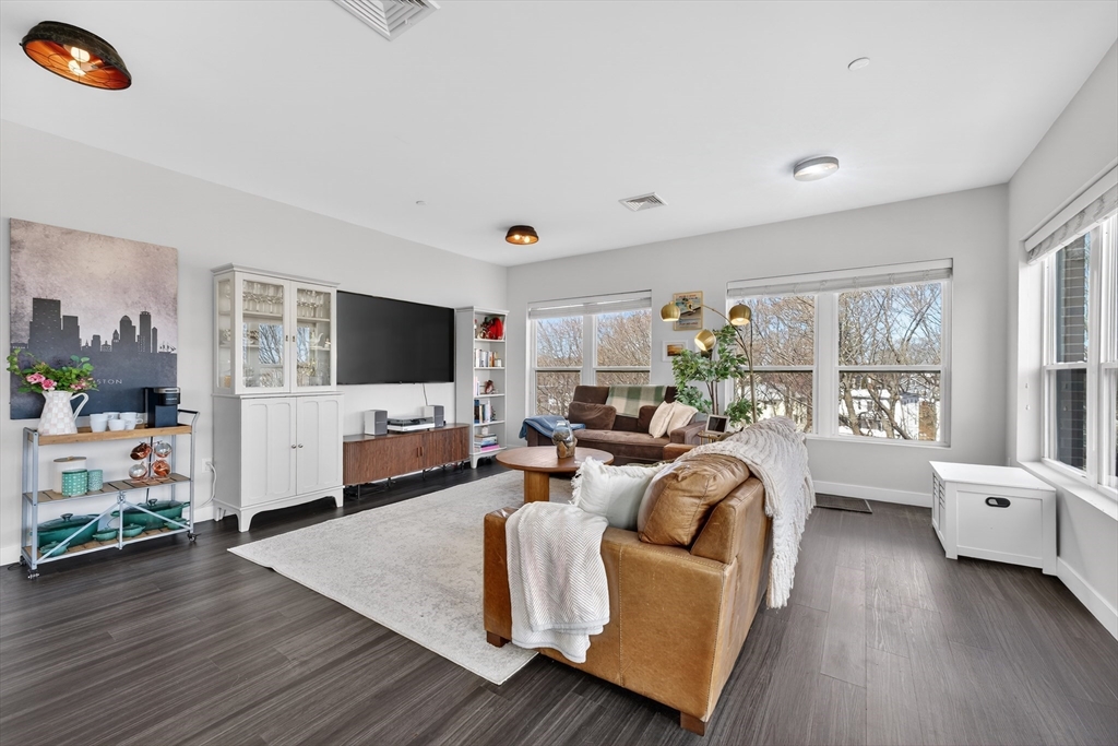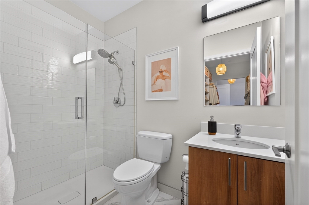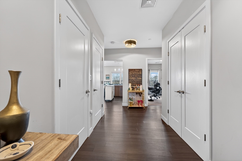Welcome to the Residences at Brookside. A luxury Condominium building ideally situated steps from Quincy Center. This sun-filled two-bedroom two-bathroom corner unit has amazing natural light with two exterior walls of windows overlooking Furnace Brook. This modern layout offers a great entertaining space with dark-stained engineered oak floors, stainless steel appliances and stone counters. Spacious master suite with custom designed walk-in closet and finely appointed bath. Building amenities include a full gym, yoga studio, club room, common courtyard with grilling area and an expansive roof deck with city and ocean views. This Residence comes with two-deeded garage parking spaces!