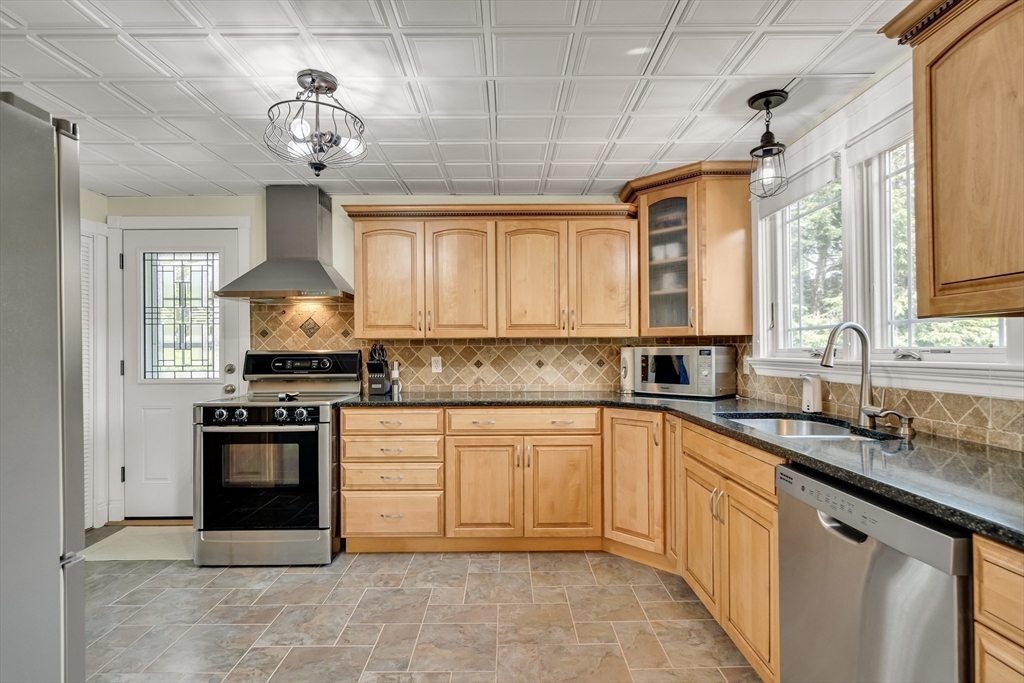Welcome to this beautifully updated and meticulously maintained ranch, perfect blend of comfort, charm, and modern convenience. Step into a well-appointed kitchen, featuring maple cabinetry and quartz counters. The kitchen flows into the dining area which opens to a deck overlooking the fenced backyard. The dining area connects to the living room, highlighted by a large bay window and fireplace. The main level offers two good sized bedrooms and a stylishly updated bath with a glass-surround tiled shower. On this level, you'll find HW floors, ample closet space, and casement windows that bring in natural light. The lower level adds versatility with a bedroom featuring a large window and closet, a family room with a walk-in closet, updated full bathroom, laundry room, and a workshop. Professional landscaping, new front walk and composite decks at both the side entry and rear. Ideally located on a dead-end near Horn Pond. Now's your chance to own this exceptional energy efficient home.