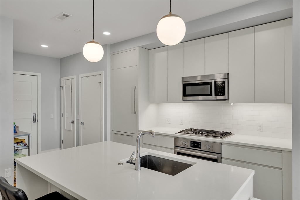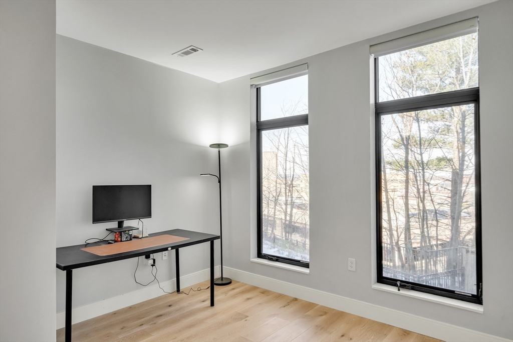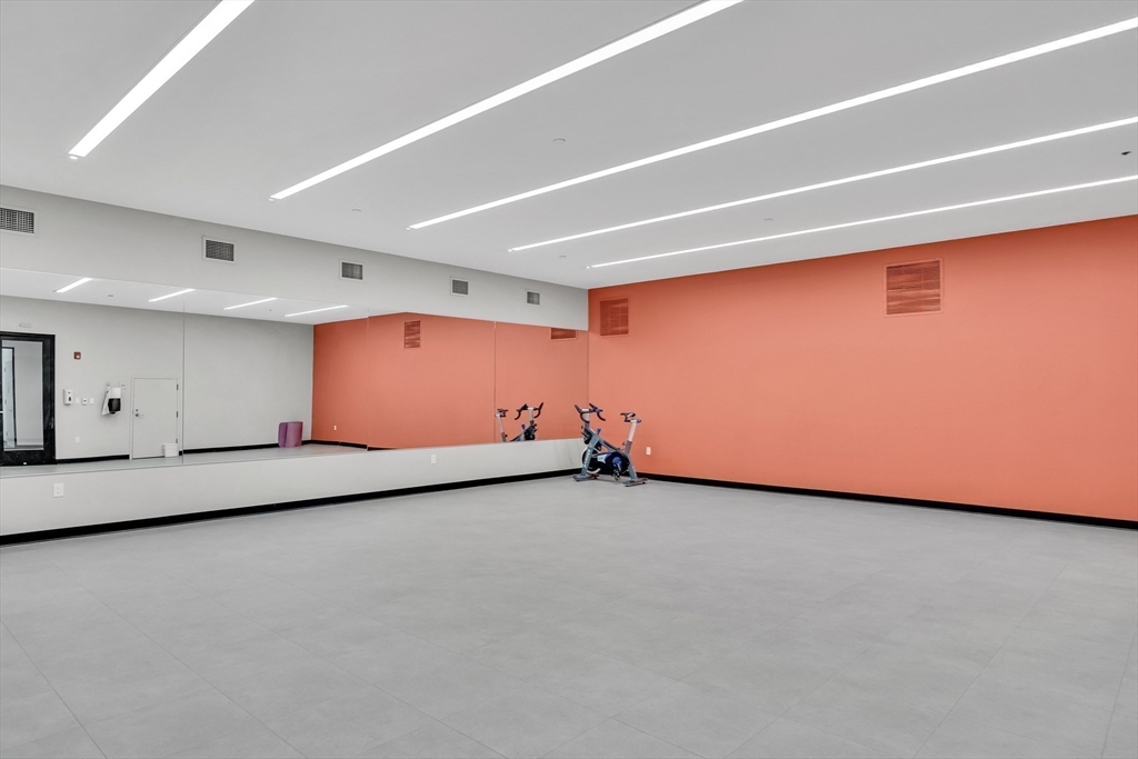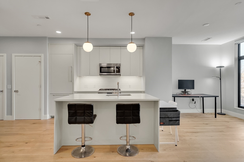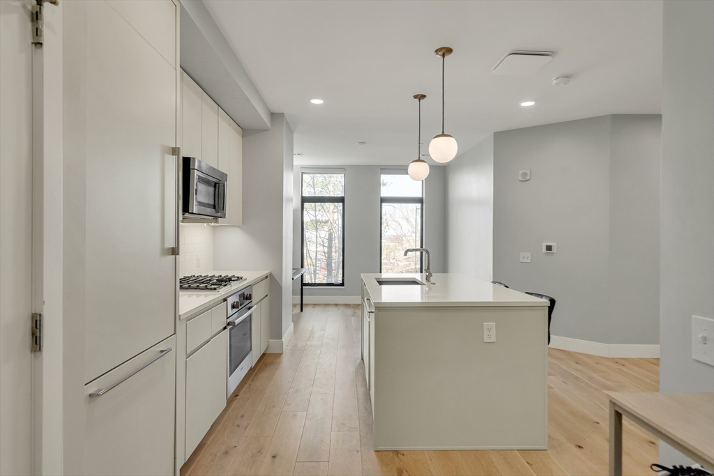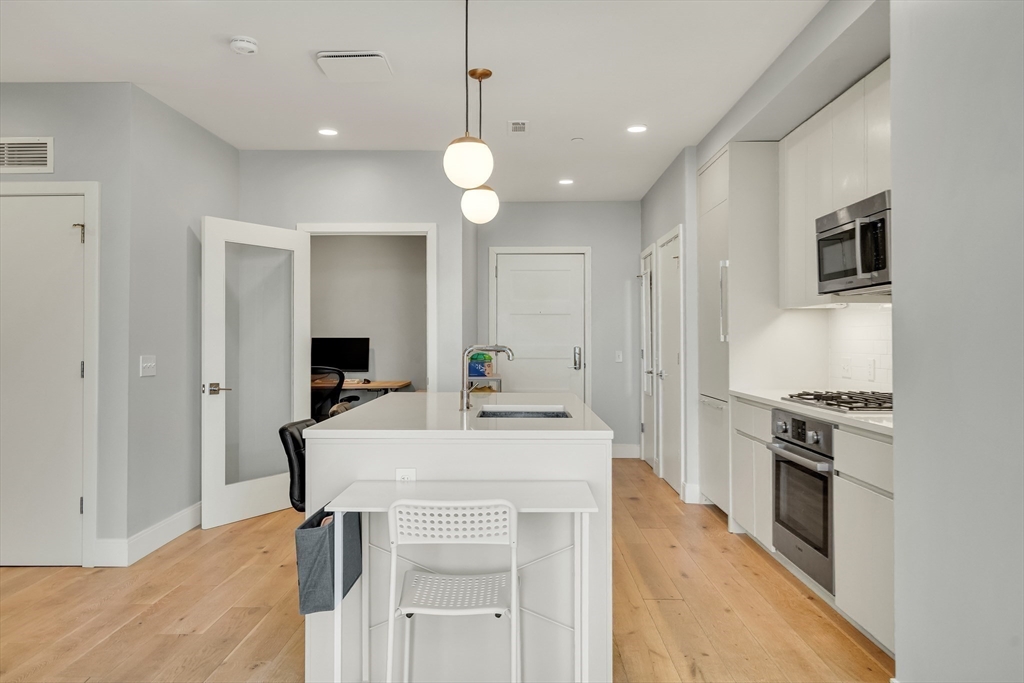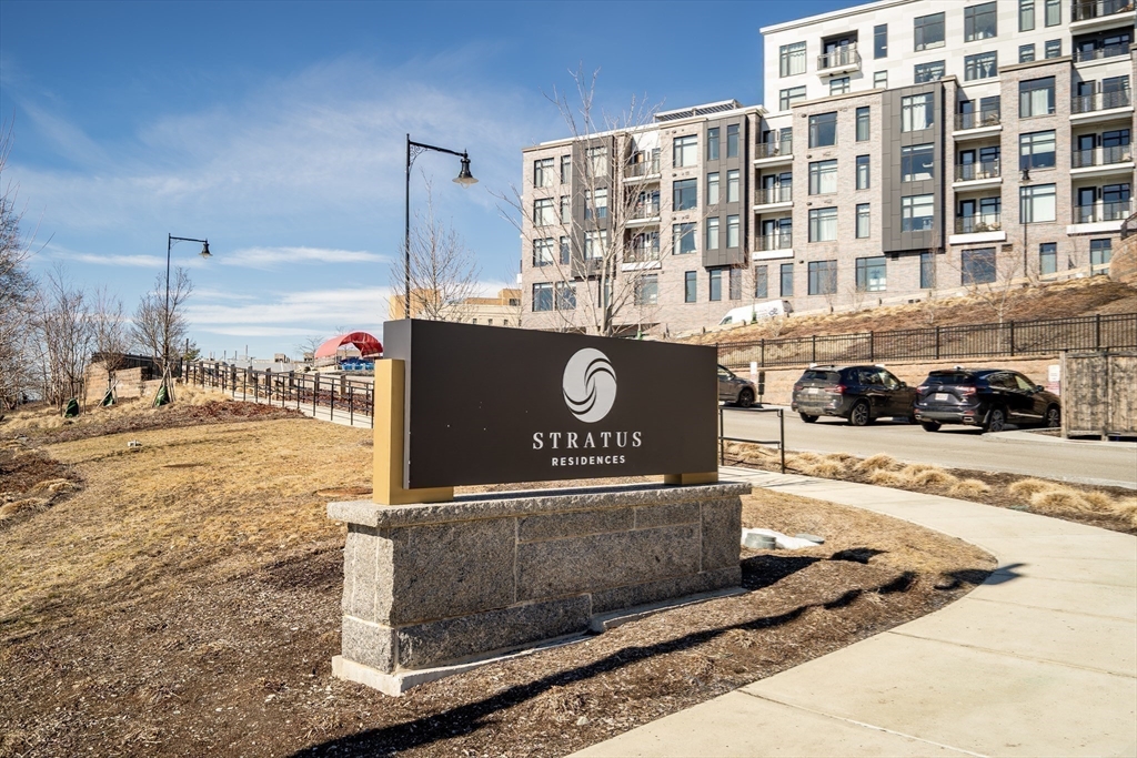 Sophisticated one-bedroom residence with bonus room ideal for a home office, den, or guest space at Stratus, a luxury condominium completed in 2022, including one garage parking space. Floor-to-ceiling windows bring natural light into the home and highlight the open living layout. Kitchen with spacious island, white cabinetry, and Bosch appliances including paneled refrigerator and dishwasher, stainless steel range and microwave. Bedroom with walk-in closet. Wood flooring, central heat and AC, and in-unit laundry. Modern bath with large walk-in shower. Stratus amenities include concierge desk, library lounge, work areas, fitness center, sauna, landscaped terrace with grilling stations and fire pits, and a sky lounge with roof deck and grills. Additional amenities, including a pool and expanded fitness facilities, are available next door at The Overlook at St. Gabriel’s for a minimal fee. Convenient location near Whole Foods, shops, restaurants, and the Green Line MBTA.