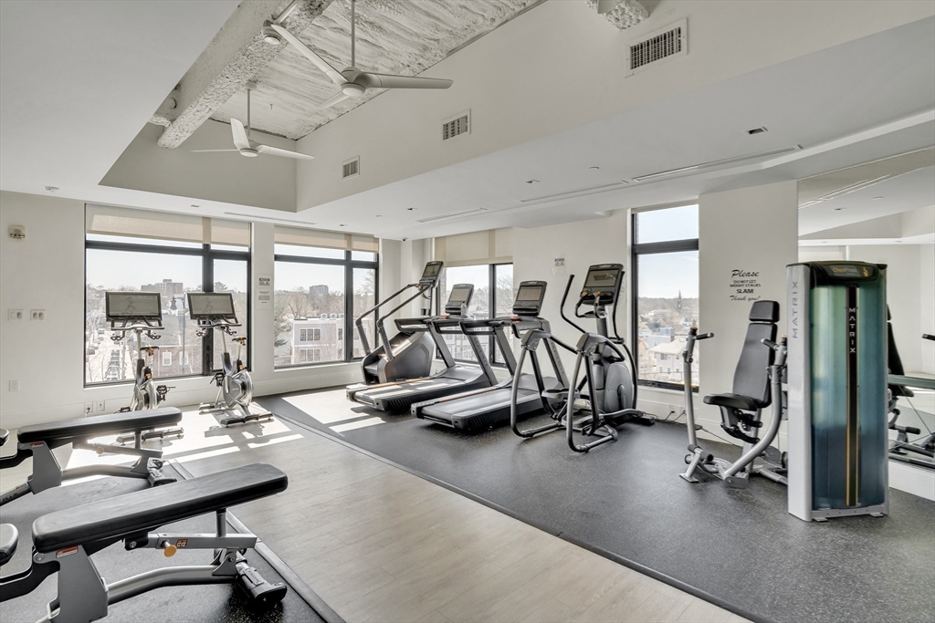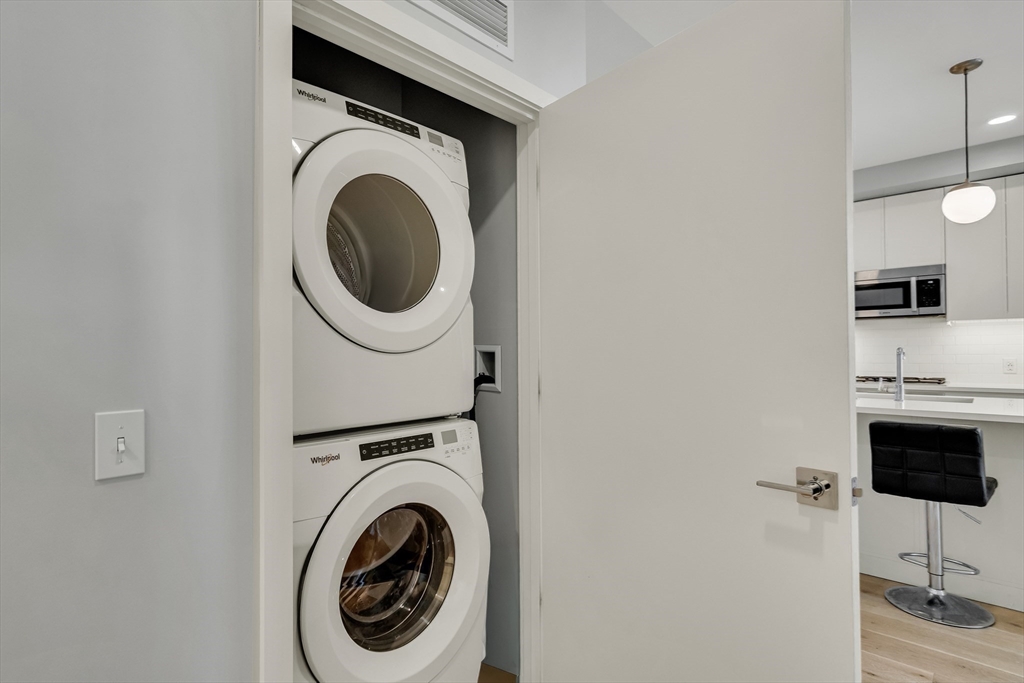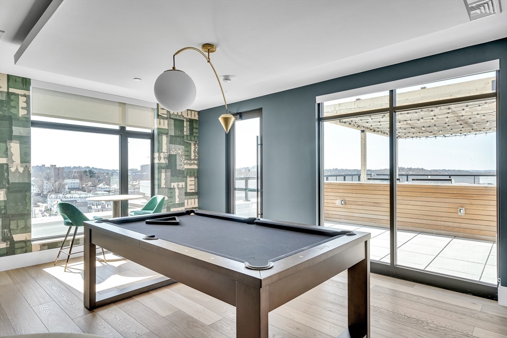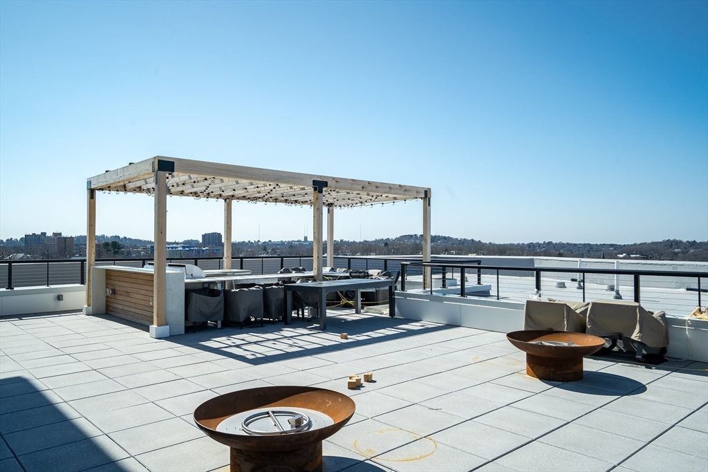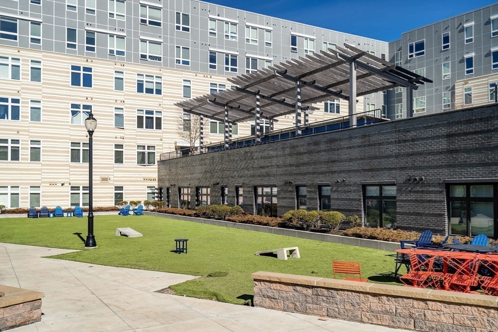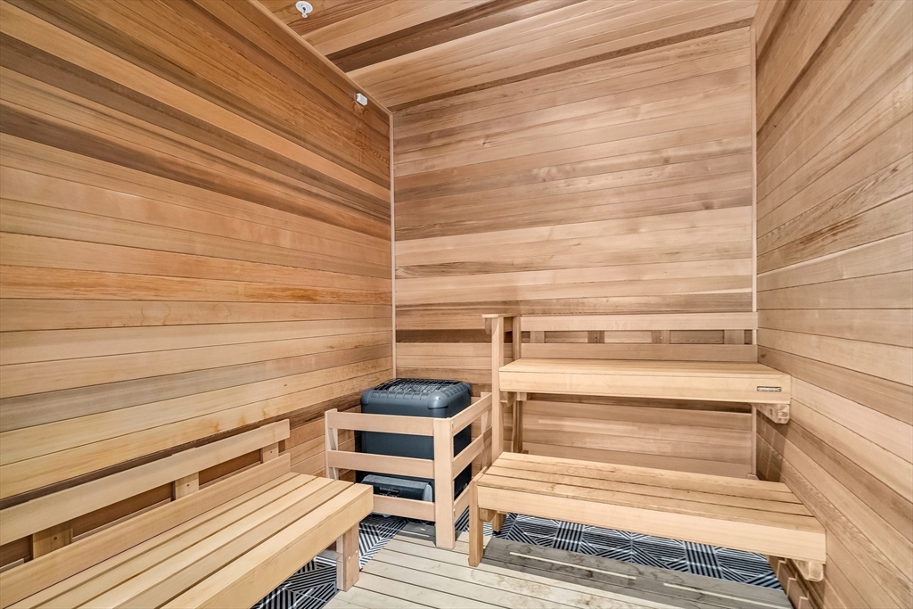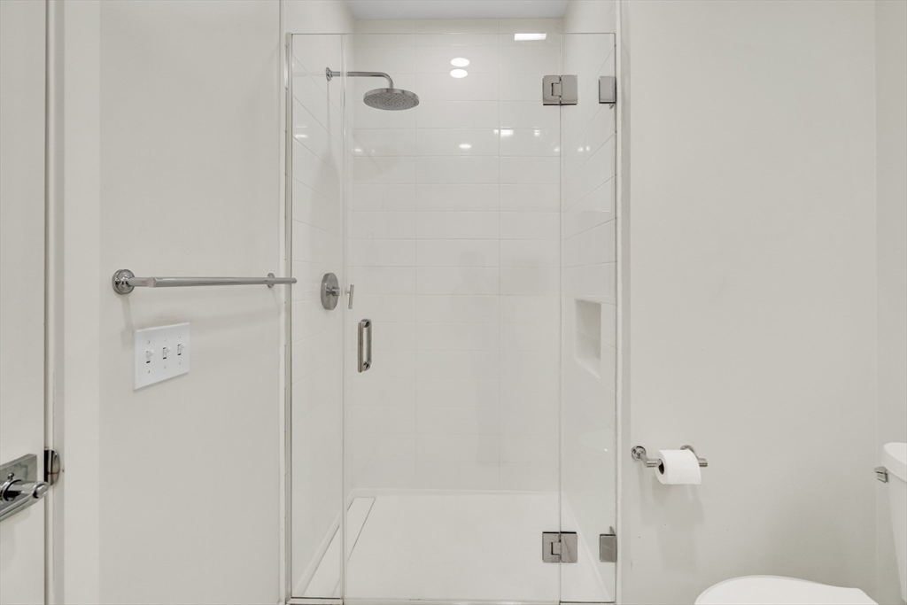 Sophisticated one-bedroom residence with bonus room ideal for a home office, den, or guest space at Stratus, a luxury condominium completed in 2022, including one garage parking space. Floor-to-ceiling windows bring natural light into the home and highlight the open living layout. Kitchen with spacious island, white cabinetry, and Bosch appliances including paneled refrigerator and dishwasher, stainless steel range and microwave. Bedroom with walk-in closet. Wood flooring, central heat and AC, and in-unit laundry. Modern bath with large walk-in shower. Stratus amenities include concierge desk, library lounge, work areas, fitness center, sauna, landscaped terrace with grilling stations and fire pits, and a sky lounge with roof deck and grills. Additional amenities, including a pool and expanded fitness facilities, are available next door at The Overlook at St. Gabriel’s for a minimal fee. Convenient location near Whole Foods, shops, restaurants, and the Green Line MBTA.