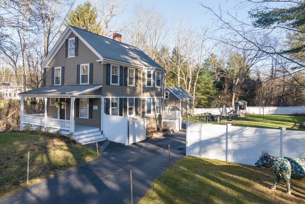 Iconic front porch welcomes you into this charming circa-1901 farmhouse. The front foyer opens to gracious living and dining rooms with a fireplace. Updated kitchen and family room with plenty of storage and easy access to a deck overlooking a flat backyard with patio and play area. The second floor offers a primary suite with vaulted ceilings and an en suite bath, three additional bedrooms, and access to a finished bonus room on the third floor. Newly refinished hardwood floors throughout all formal first-floor areas. Lower level features space for an exercise area, a storage closet, and easy access to the backyard. Two-car garage with loft. Top-rated Weston Schools.