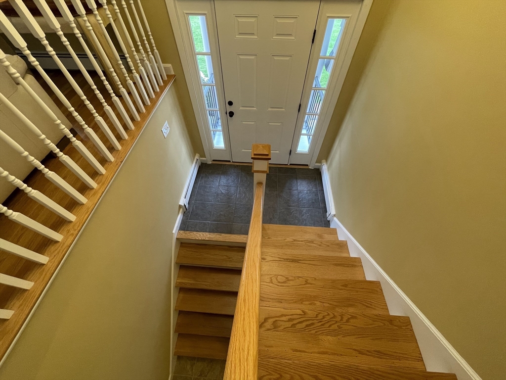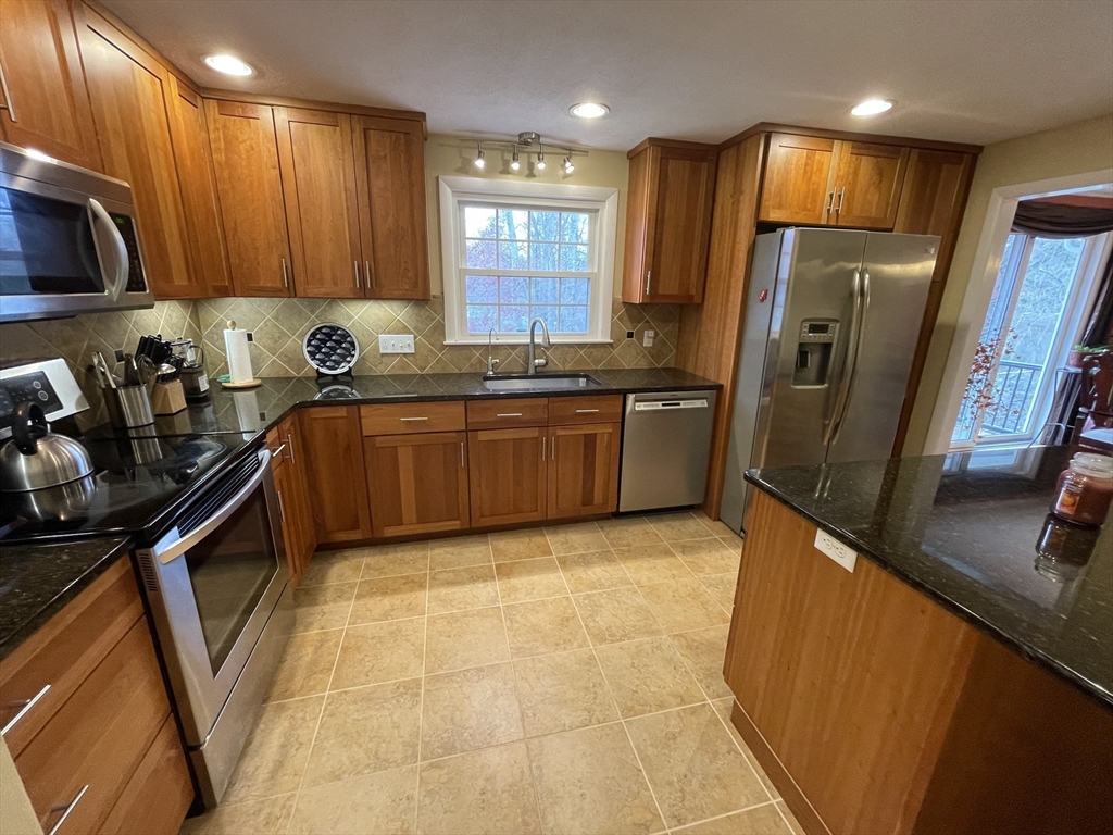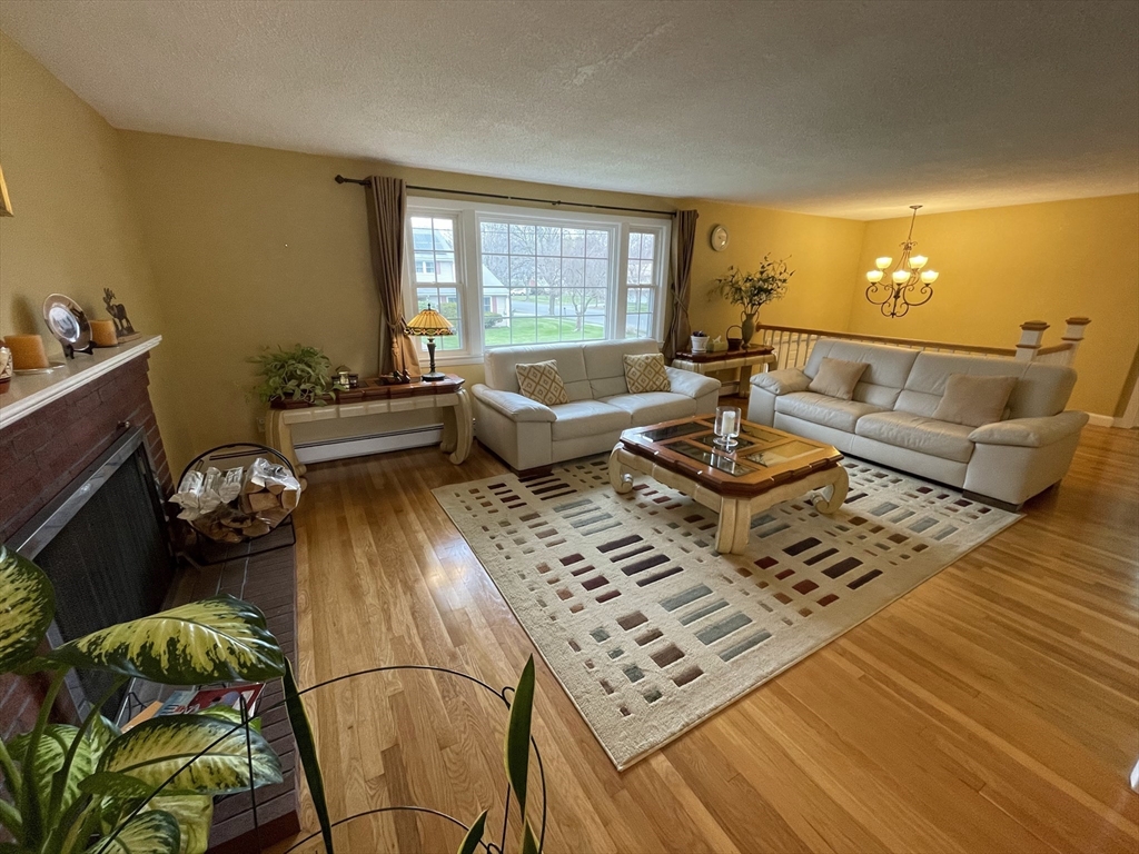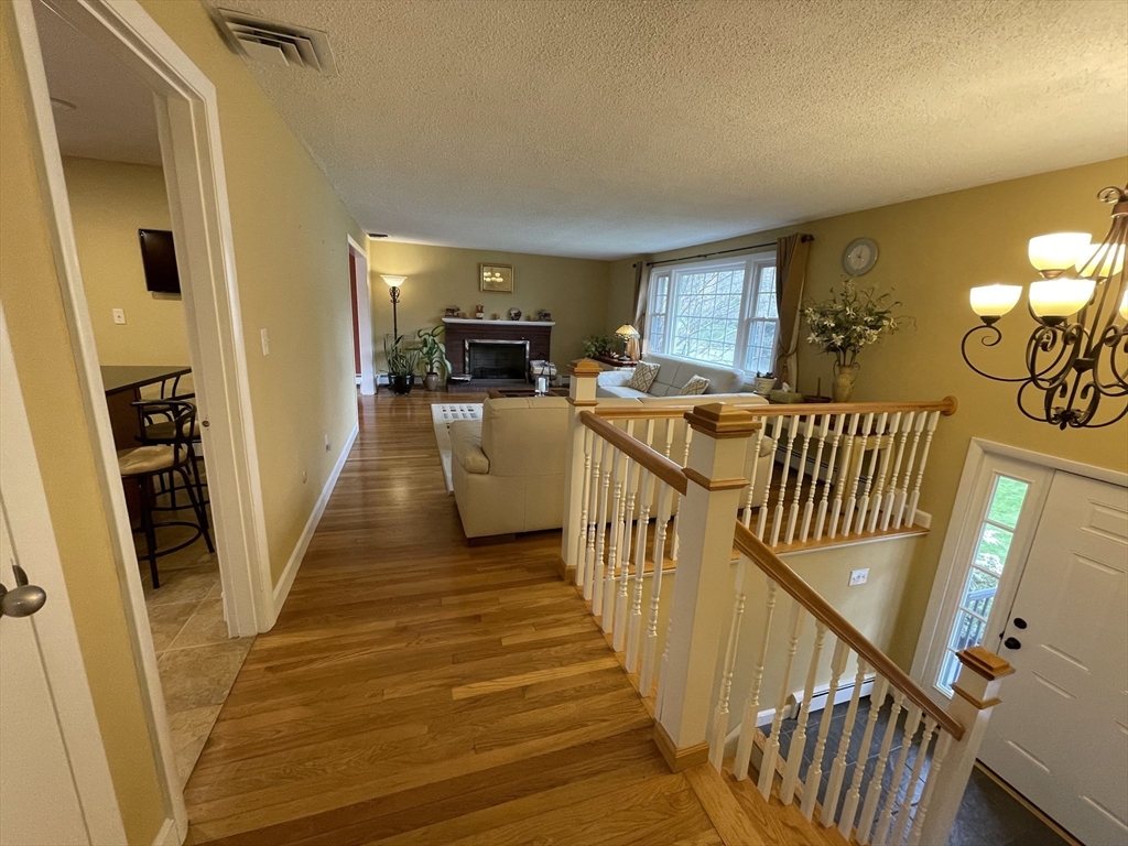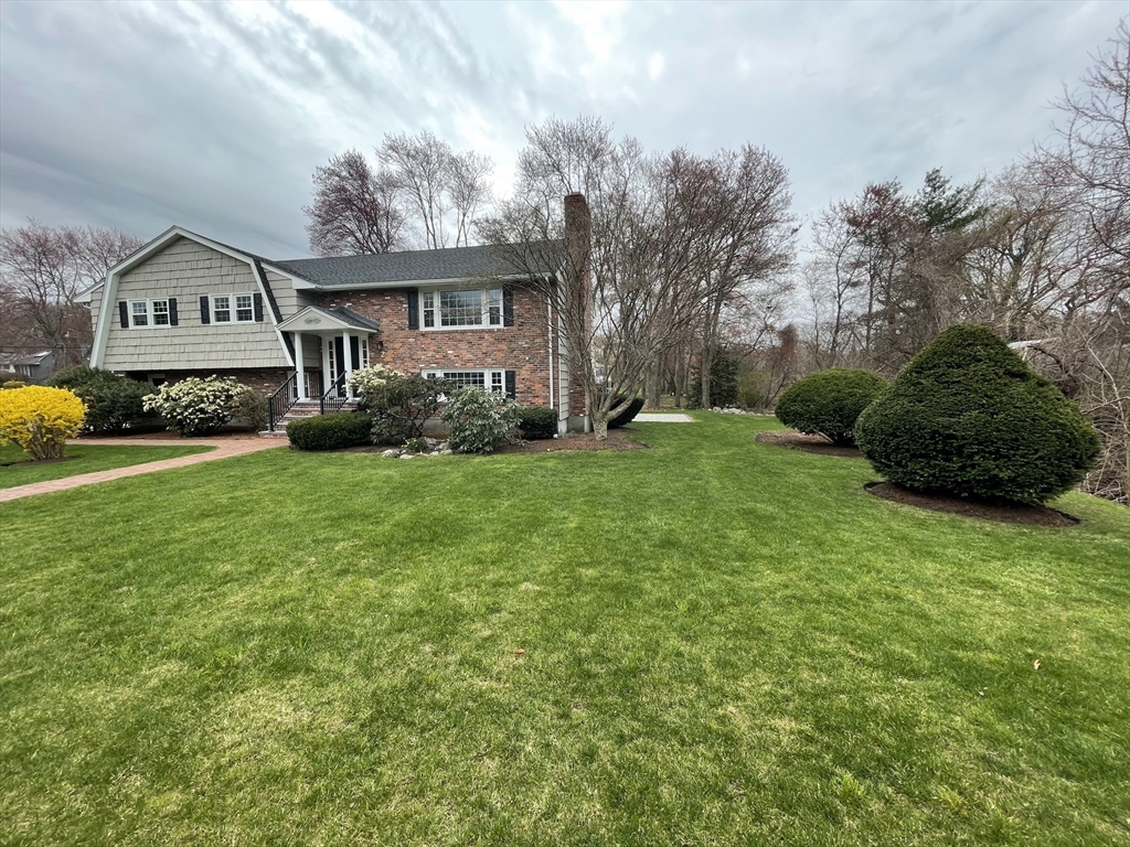 Renovated and sun-filled, four-bedroom, two-and-a-half-bath, split entry home with a two-car garage located steps from Bowman Elementary School. The main floor features hardwood floors, a welcoming living room with a fireplace, a Sunny eat-in kitchen with stainless steel appliances, and a formal dining room with sliders leading to the renovated deck overlooking the gorgeous lawns. The walk-out lower level features a fire-placed family room, the fourth bedroom, and a half bathroom. Several thoughtful renovations include a renovated kitchen, bathrooms, and windows, and the addition of central air on the main floor. Enjoy outdoor entertaining on the beautiful deck and the paver patio. Laundry with washer & dryer, a 2-car garage, and plenty of storage, including a storage shed. Easy access to major routes, public transportation, and a short walk to Wilson's farms. Move-in ready! Simply unpack!