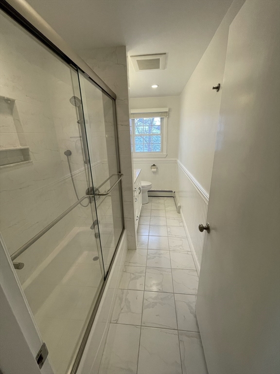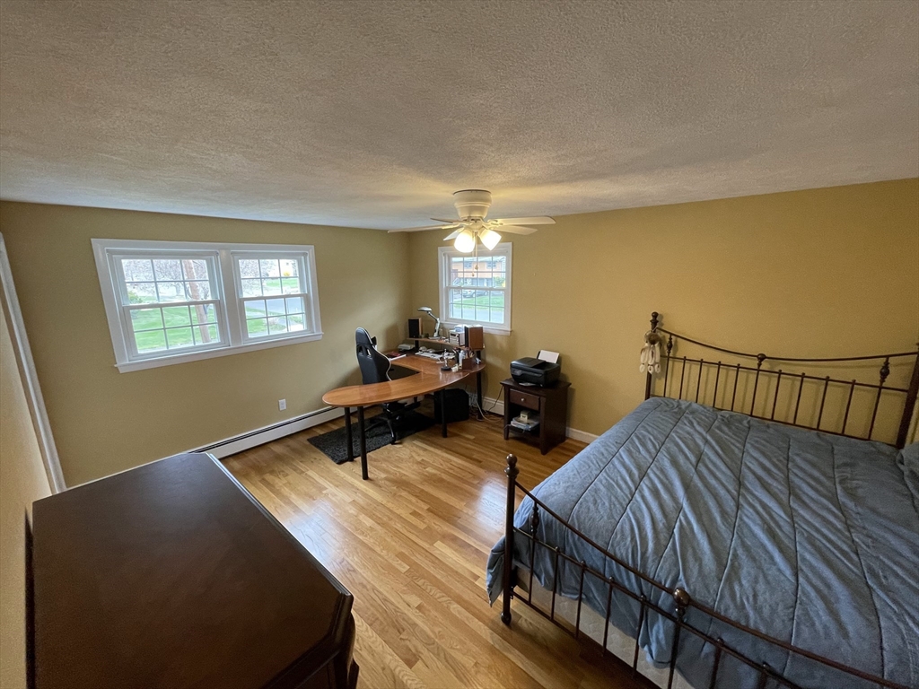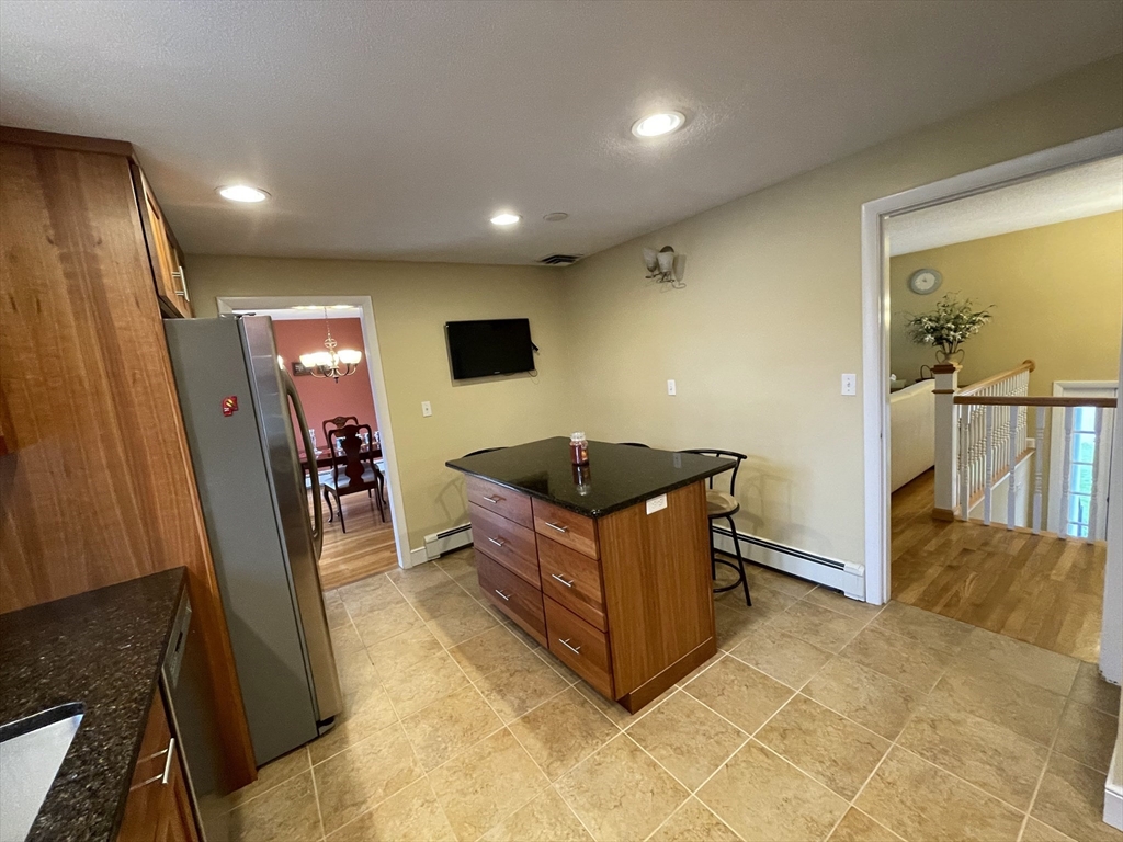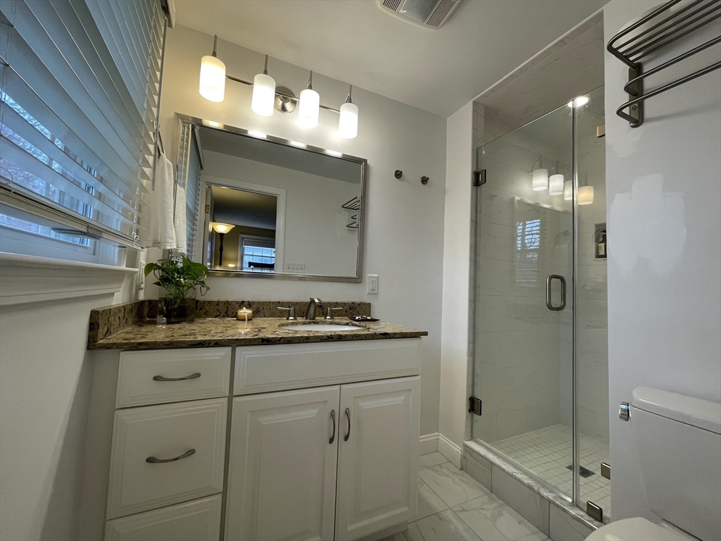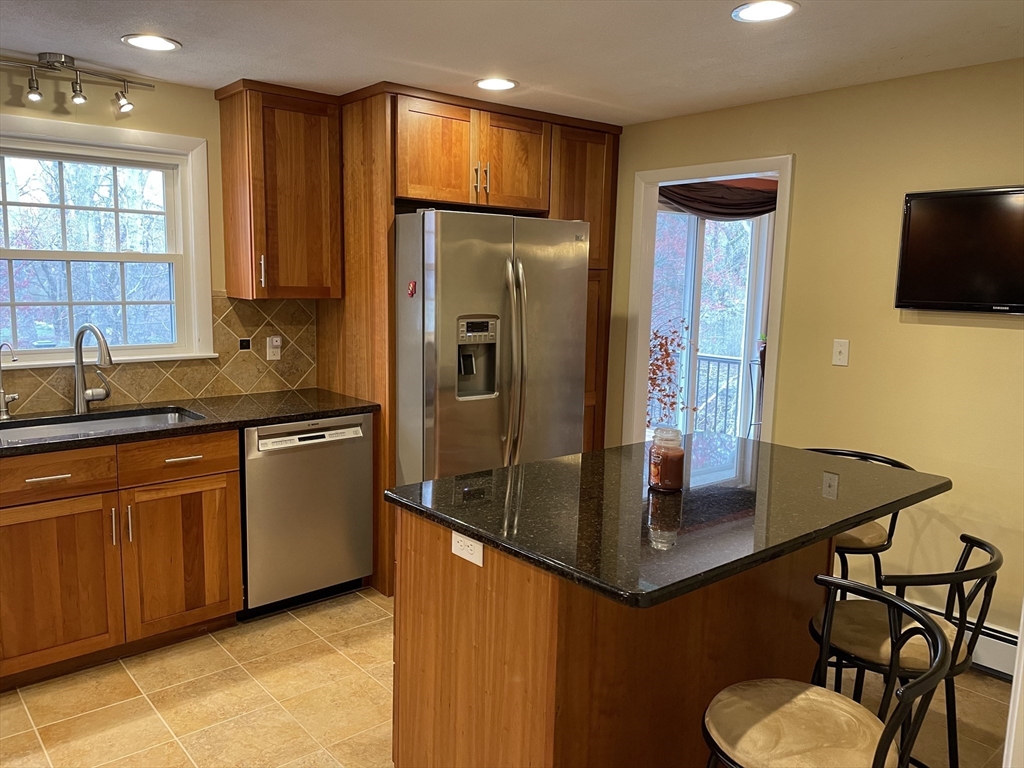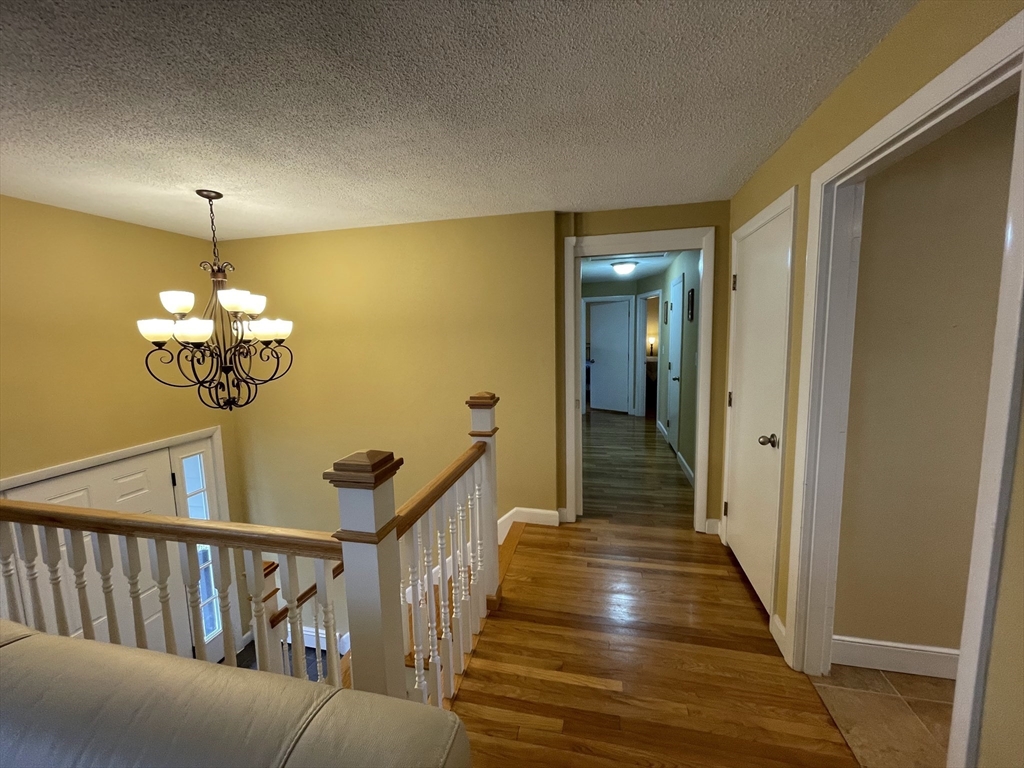 Renovated and sun-filled, four-bedroom, two-and-a-half-bath, split entry home with a two-car garage located steps from Bowman Elementary School. The main floor features hardwood floors, a welcoming living room with a fireplace, a Sunny eat-in kitchen with stainless steel appliances, and a formal dining room with sliders leading to the renovated deck overlooking the gorgeous lawns. The walk-out lower level features a fire-placed family room, the fourth bedroom, and a half bathroom. Several thoughtful renovations include a renovated kitchen, bathrooms, and windows, and the addition of central air on the main floor. Enjoy outdoor entertaining on the beautiful deck and the paver patio. Laundry with washer & dryer, a 2-car garage, and plenty of storage, including a storage shed. Easy access to major routes, public transportation, and a short walk to Wilson's farms. Move-in ready! Simply unpack!