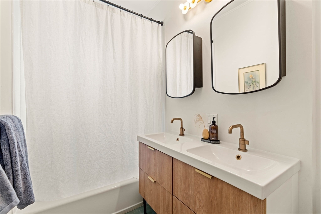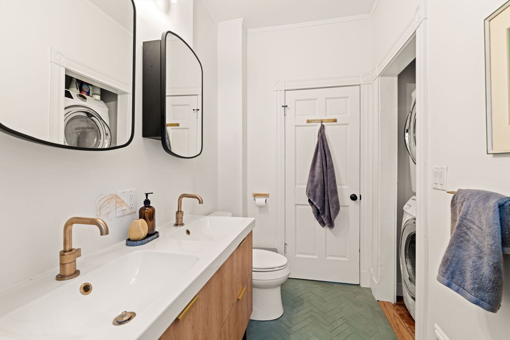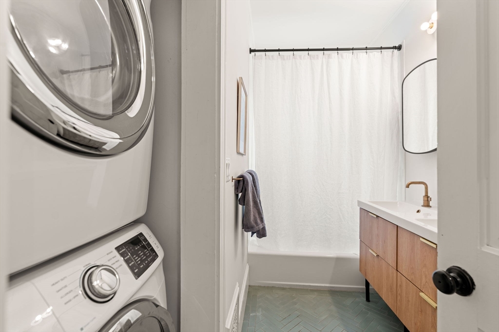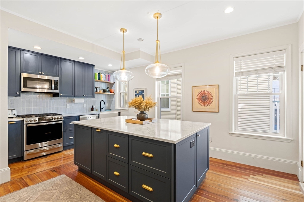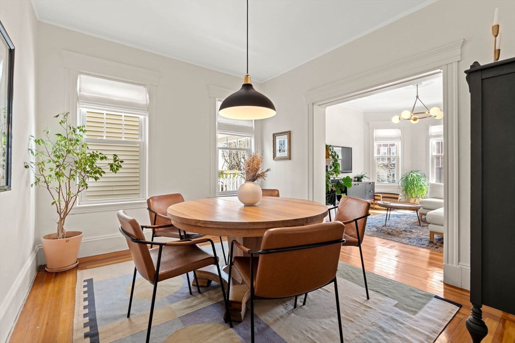 Welcome to 32 Roseclair St. Bright and inviting, this updated three-bedroom, two-bath condo offers the perfect mix of modern convenience and classic charm. The living room features bay windows that fill the space with natural light, highlighting hardwood floors, crown molding, and a mantelpiece. A spacious dining room flows seamlessly into the kitchen, updated in 2020 with stainless steel appliances, marble countertops, a large island, and plenty of cabinet space, including a coffee bar. The primary bedroom includes custom closets, while the updated bathroom boasts a tiled shower, tub, and handcrafted cement tiles, along with the convenience of in-unit laundry. Additional features include central A/C, two private decks, a shared yard, and a 10x8 basement storage unit. Located in the Polish Triangle near South Boston, this home is close to shopping, dining, and the Red Line T, with easy on-street parking available.