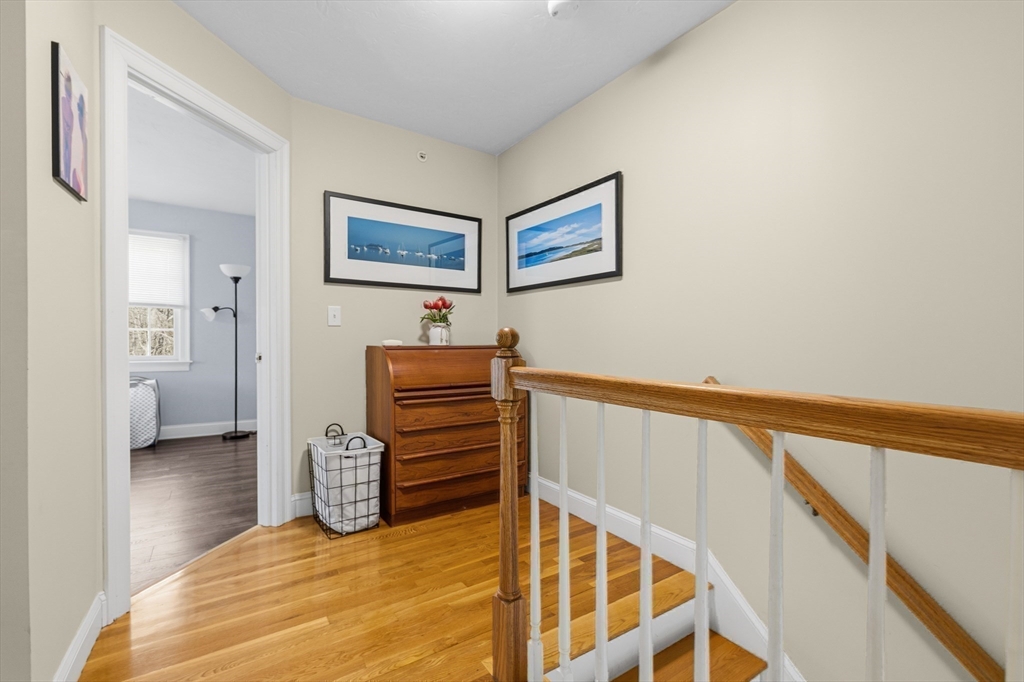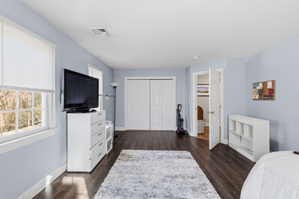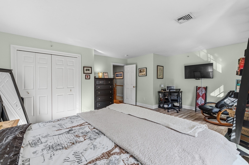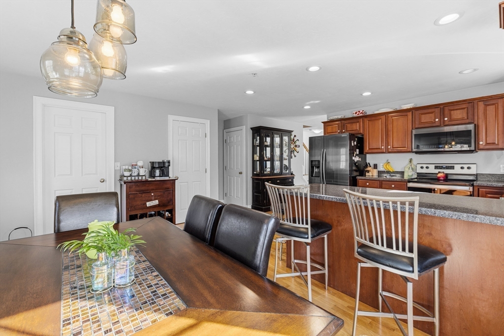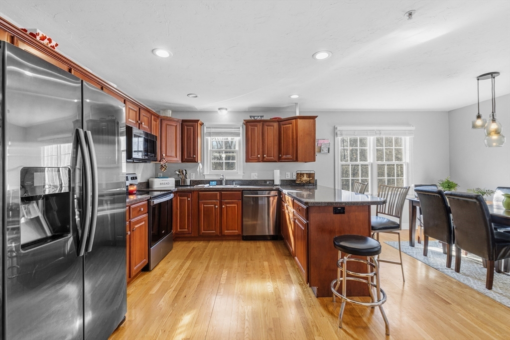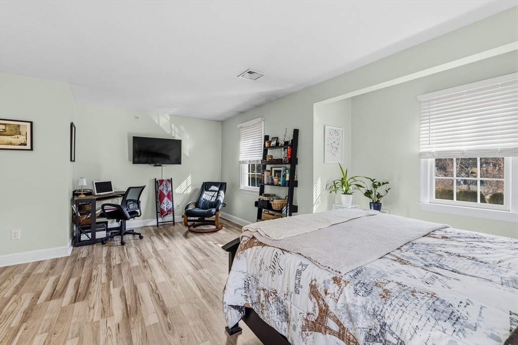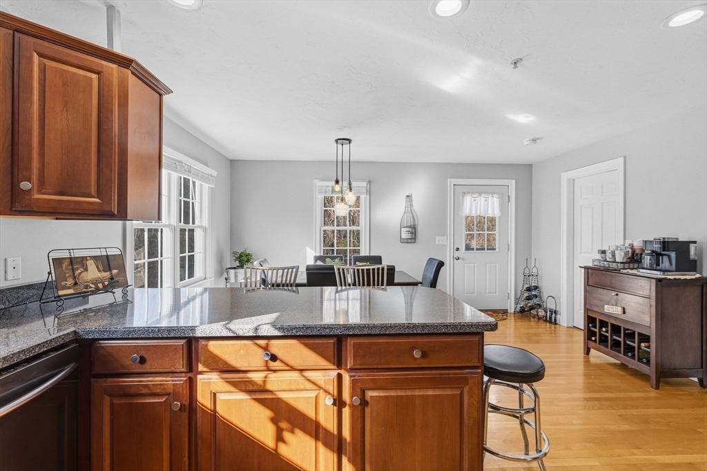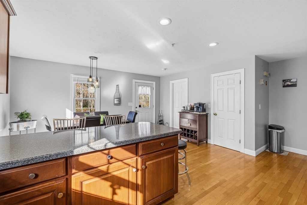 Beautifully maintained end-unit condo offering exceptional light, space, and privacy in a prime location just minutes from the highway. This former model home is filled with natural sunlight thanks to additional windows and features an open, functional layout. The main level includes hardwood flooring, a well-designed kitchen with rich cherry cabinetry and a half bath. The standout feature is the oversized, generously sized bedrooms, providing ample space for comfort, flexibility, and relaxation. The finished walk-out lower level adds approximately 700+/- sq ft of additional living space, perfect for a family room, home office, or guest area. Enjoy a private common backyard setting ideal for entertaining or unwinding.