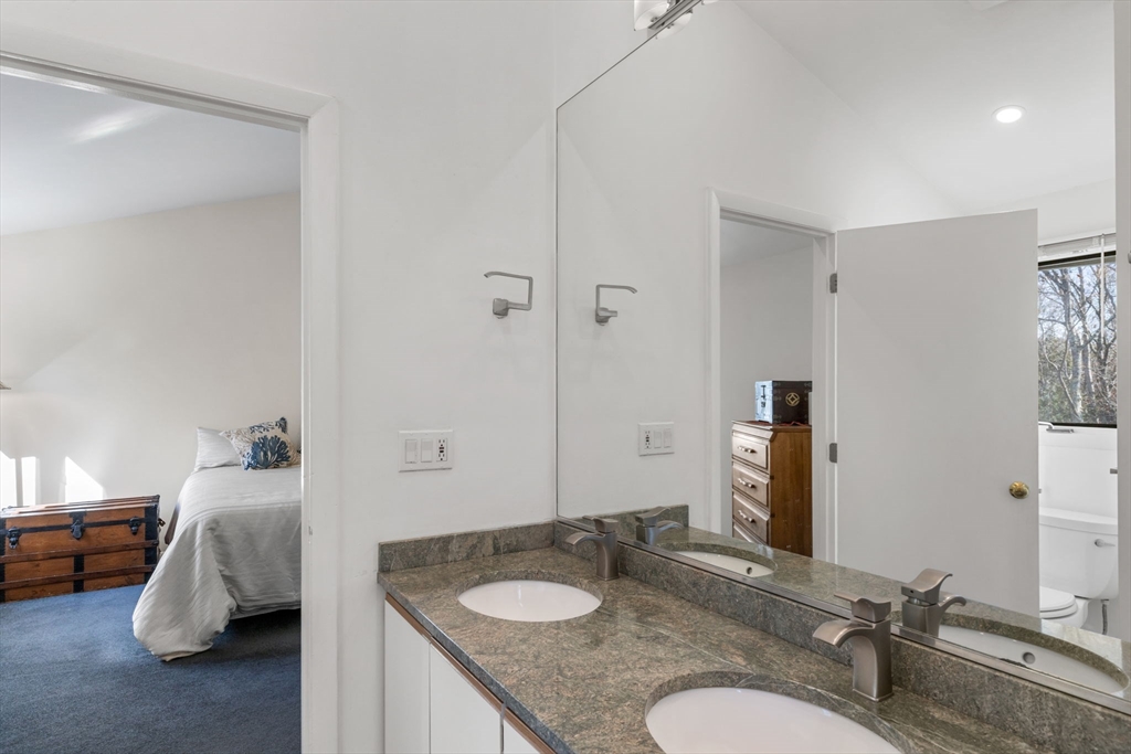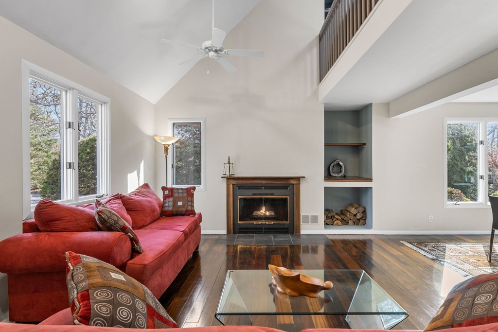 Welcome to 17 Claus Way in vibrant Marstons Mills. This inviting 3-bedroom, 2-bath Cape is filled with natural light. An open floorplan with woodburning fireplace and striking Padauk hardwood floors flows into a bright 4-season sunroom with three sliders and two skylights for year-round ambiance. Step out to the expansive, south-facing deck overlooking an acre of beautifully landscaped wooded grounds and mature gardens, perfect for entertaining. The kitchen offers a breakfast bar, granite countertops, and newer Bosch and LG stainless appliances. The first-floor primary bedroom sits adjacent to a full bath. The upper level with cathedral ceilings and skylights features two spacious bedrooms, including a flexible loft-style balcony space, and a full bath with granite-topped vanity and ceramic tile floor. The walk-out lower level with slider offers expansion potential. Additional highlights include a new 3-bedroom septic, freshly painted interior, built-ins and EV charger.