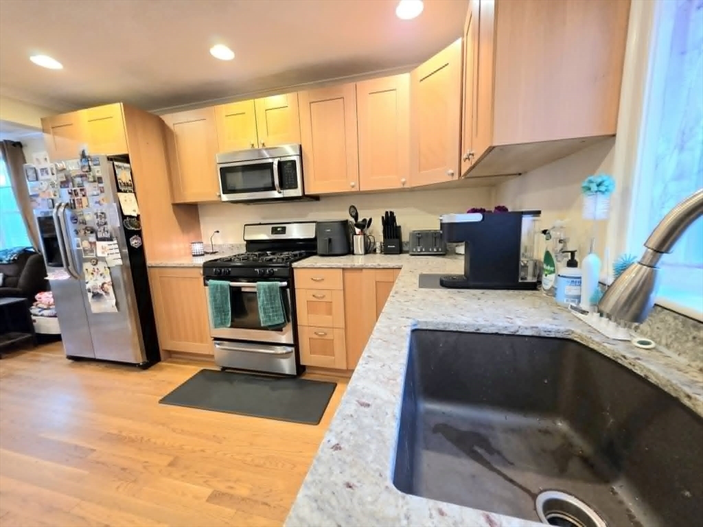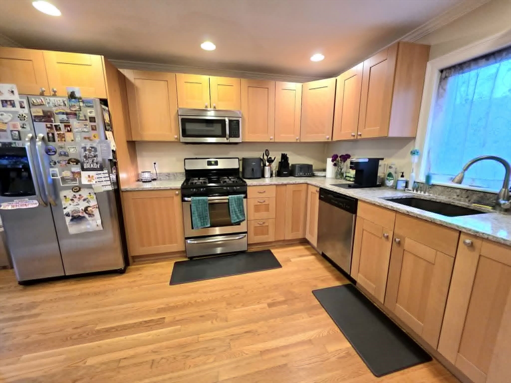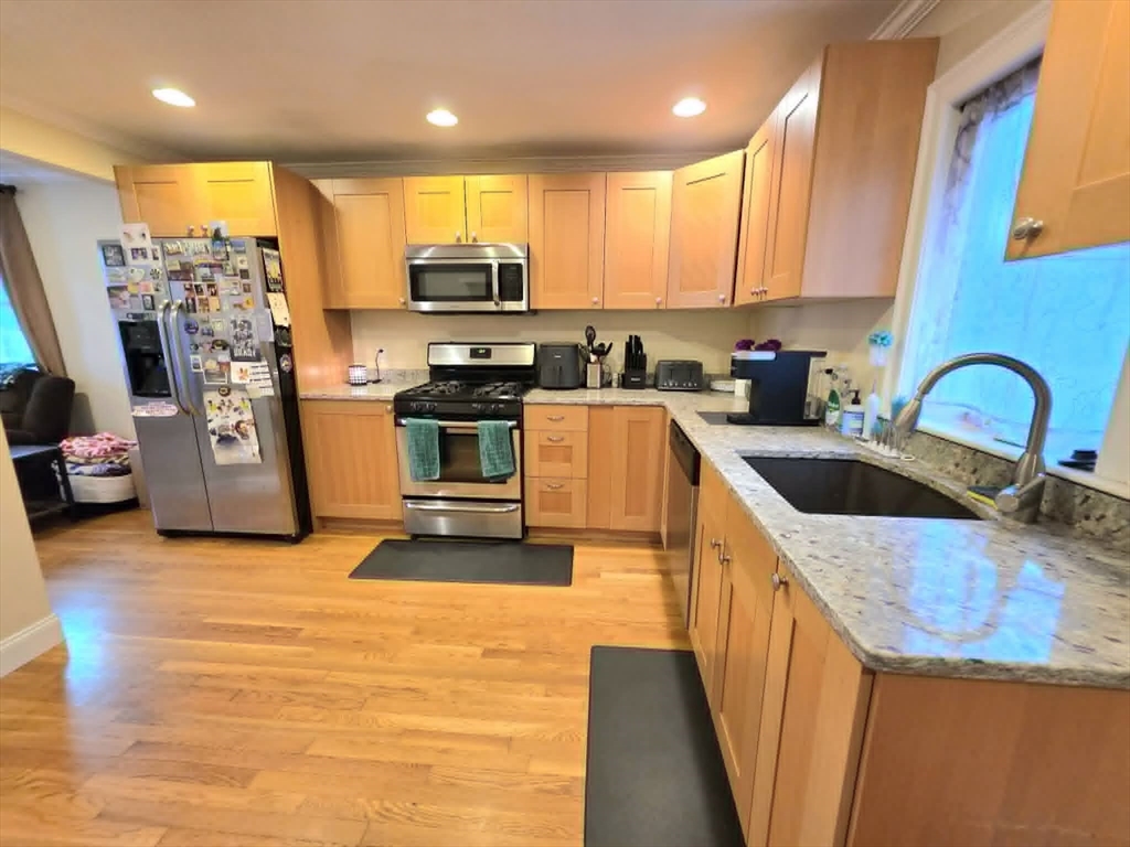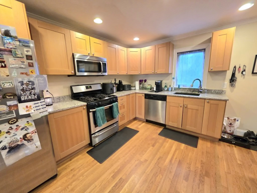 AVAIL May 1st! This Melrose 3 beds, 1 bath attached single family offers 2 off street driveway parking, and a backyard. Convinently situated less than 1 mile from Oak Grove T stop and Wyoming Hill commuter rail stop, this home has a spacious layout with a wonderful 3 floor living, it has been recently renovated w/ hardwood floors and recessed lightings. The 1st floor has an open concept living area that connects with the modern kitchen (w/ granite countertops, stainless steel appliances, gas cooking), full bath, backdoor access to the backyard. 2nd floor has two good size bedrooms with amble closest spaces, 3rd floor has another large bedroom. The basement is partially finished and provides additional living space, unfinished side of the basement is where the laundry units & storage space, walk out basement directly leads to the backyard and 2 parking spaces. Tenants pay all utilities and handle snow removal and landcaping.