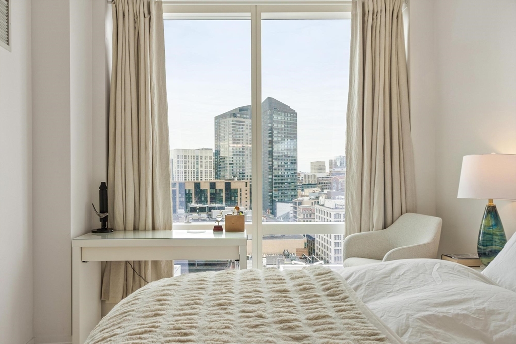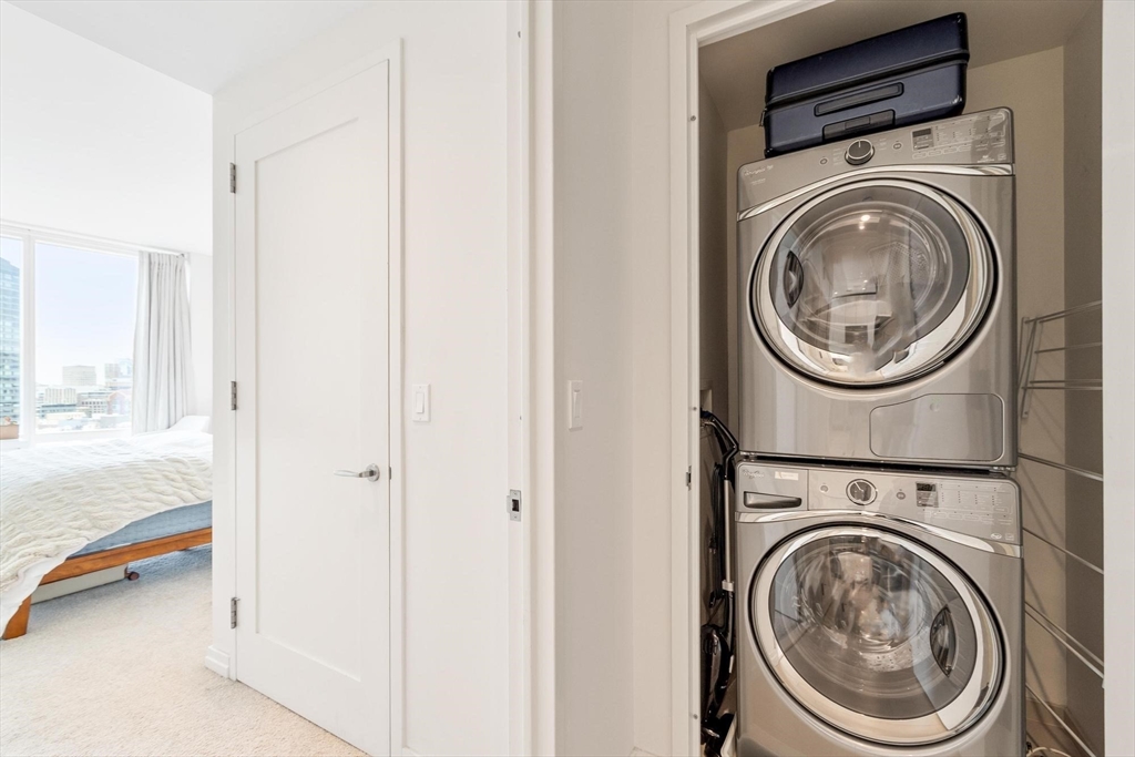 South-facing one-bedroom residence with skyline views and floor-to-ceiling windows at Millennium Tower Boston. This approximately 798 sq ft home features an open-concept living and dining area with a full window wall bringing in natural light and city views. The kitchen includes quartz countertops, flat-panel cabinetry, gas cooktop, built-in oven, under-cabinet lighting, wine refrigerator, and peninsula seating. The bedroom offers full-height windows with skyline outlook. Additional features include in-unit laundry, light wood flooring in the main living area, recessed lighting, and carpet in the bedroom. Full-service building amenities include concierge, fitness center, indoor pool, resident lounge, theater, golf simulator, and terrace spaces. Located in downtown Boston near shopping, dining, parks, and MBTA transit.
