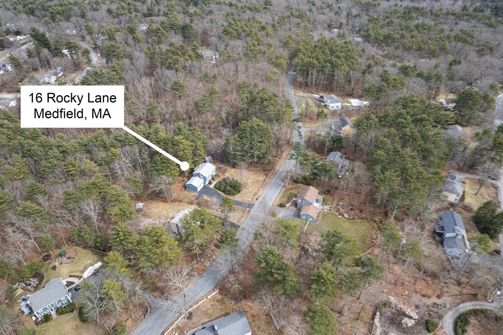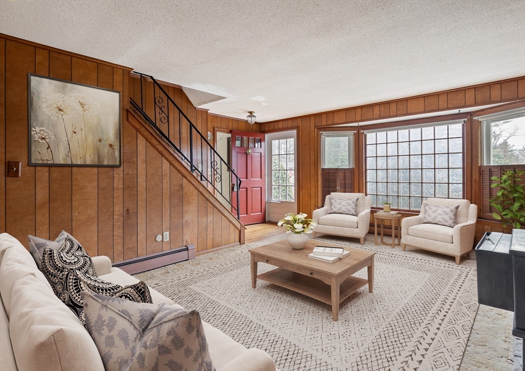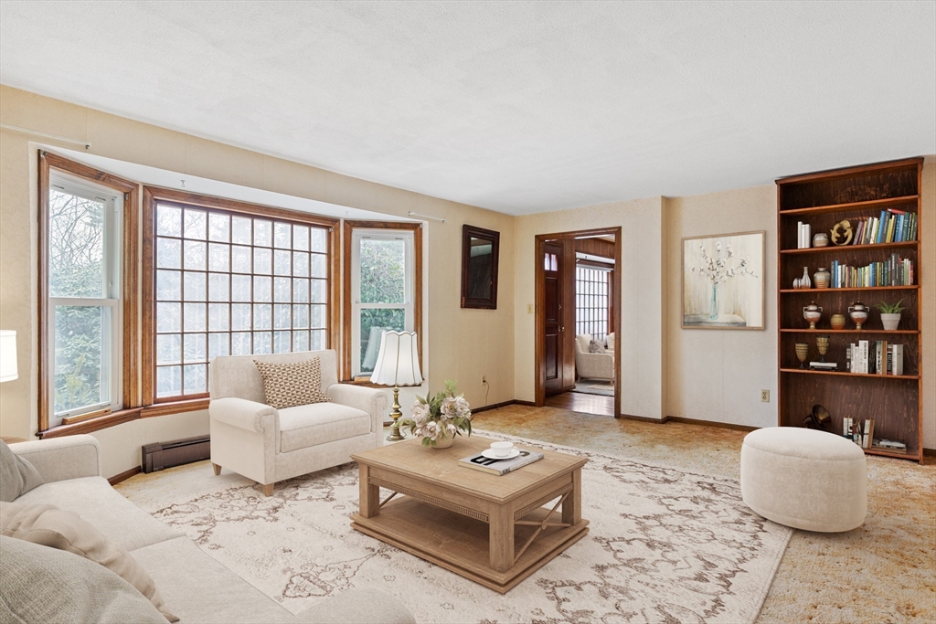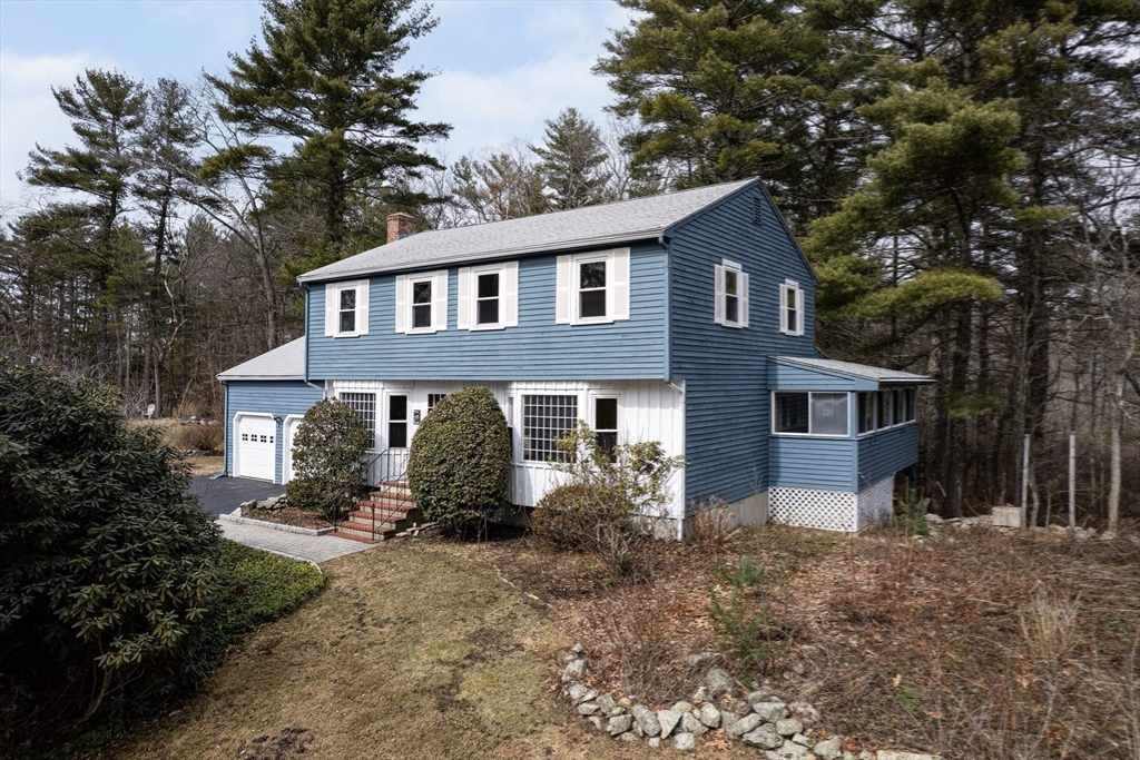 Welcome home to this Garrison Colonial on a beautiful private lot surrounded by nature. Perched on a hillside up from the road, this home has great curb appeal and features a spacious front lawn with mature plantings and a great paved driveway allowing for plenty of parking. First floor has a generous sized living room with walk-out bay window, family room w/fireplace & hardwood floors, eat-in kitchen w/ample counter & cabinet space, plus a dining room w/slider to a spacious, wrap around 3-season porch with lovely scenic views. Off the family room, there's a powder room w/closet and access to the oversized two-car garage. Second floor hall leads to the primary bedroom w/full bath, three additional bedrooms & second full bath. Great opportunity to update this home & make it your own. Enjoy a terrific neighborhood for hiking & watching nature at Noon Hill & Rocky Woods Reservation. Plus a convenient location near restaurants, shopping & commuter rail. Top notch schools. Don't miss out!