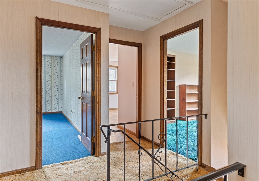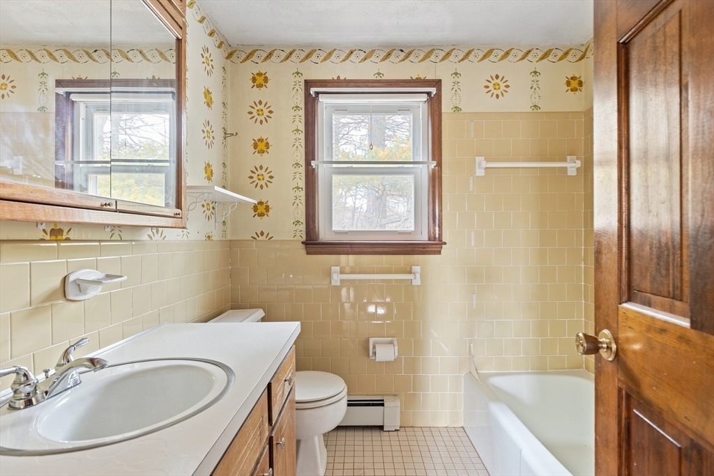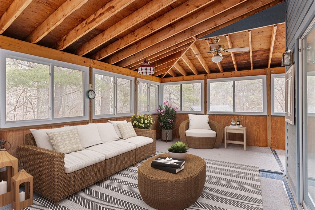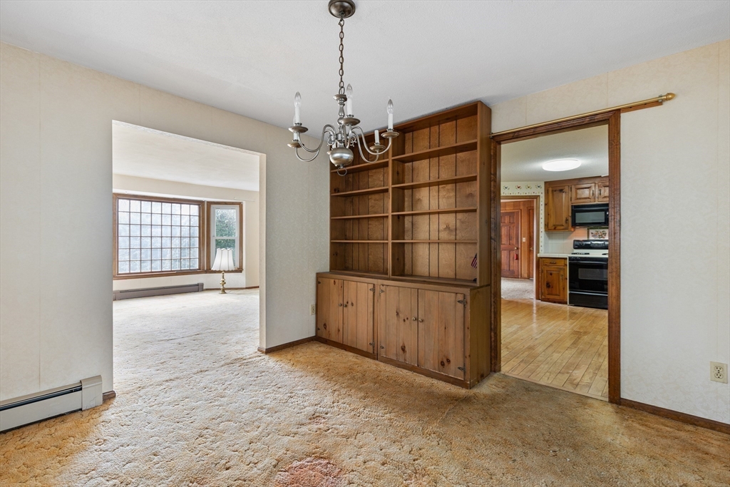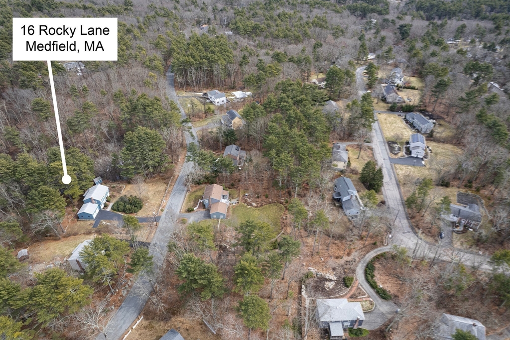 Welcome home to this Garrison Colonial on a beautiful private lot surrounded by nature. Perched on a hillside up from the road, this home has great curb appeal and features a spacious front lawn with mature plantings and a great paved driveway allowing for plenty of parking. First floor has a generous sized living room with walk-out bay window, family room w/fireplace & hardwood floors, eat-in kitchen w/ample counter & cabinet space, plus a dining room w/slider to a spacious, wrap around 3-season porch with lovely scenic views. Off the family room, there's a powder room w/closet and access to the oversized two-car garage. Second floor hall leads to the primary bedroom w/full bath, three additional bedrooms & second full bath. Great opportunity to update this home & make it your own. Enjoy a terrific neighborhood for hiking & watching nature at Noon Hill & Rocky Woods Reservation. Plus a convenient location near restaurants, shopping & commuter rail. Top notch schools. Don't miss out!