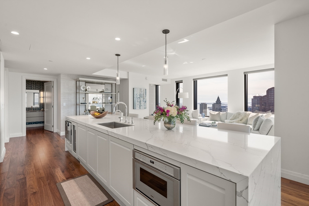 Take in unbeatable panoramic harbor & river views from every room of this customized 40th fl home in the south corner of The Sudbury tower boasting 3 exposures, bathed in natural light. A 30' wide living space is anchored with a custom 15ft. Carrara quartz & walnut waterfall island in the open concept kitchen w/ Scavolini cabinetry, integrated Gaggenau appliances, vented gas cooktop, & wine cooler. A large den doubles as a 3rd bedroom. Custom walnut media wall. Motorized blinds & glare-treated windows throughout. Radiant heated floors in primary ensuite bath. Vented dryer & baths. Amenities: private lobby, 24/7 concierge, private clubroom & private roof garden. Heated outdoor pool, 4500sf fitness center/yoga studio, sports simulator, outdoor dog park, sky lounge/deck, chef’s kitchen/private dining & more. Located where the North End meets Beacon Hill. Steps to Greenway & Harborwalk .1min to I-93; 5min to Logan. 2 assigned self-parking in attached garage upgraded w/ dual arm EV charger.