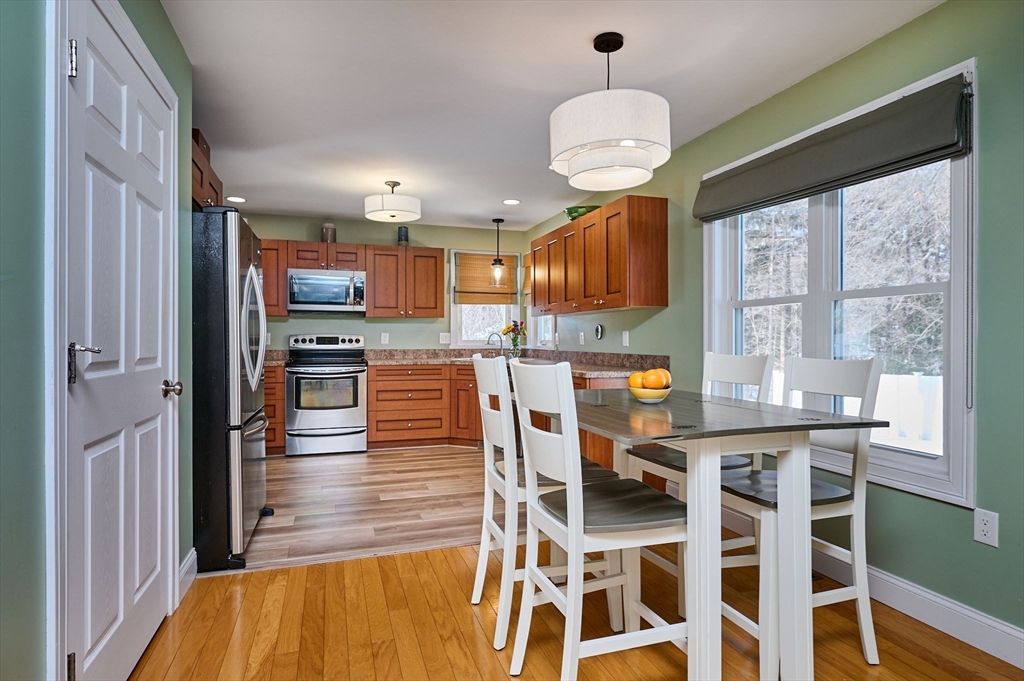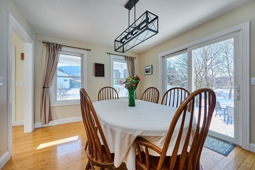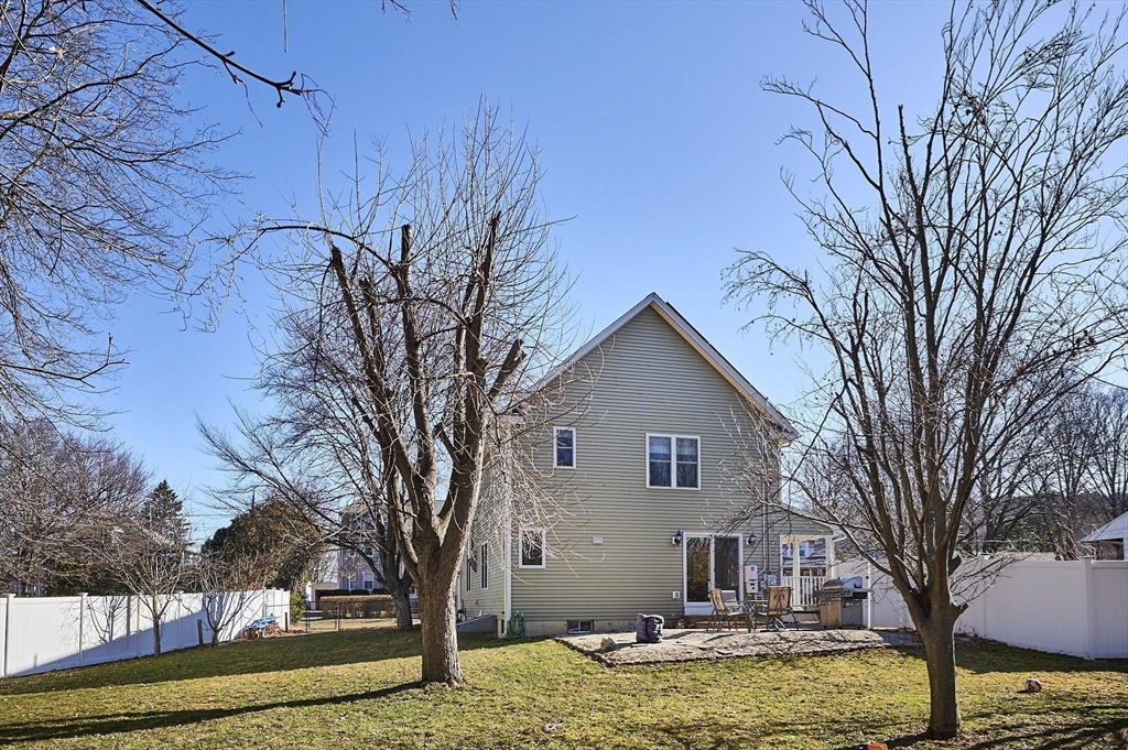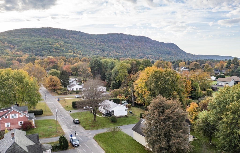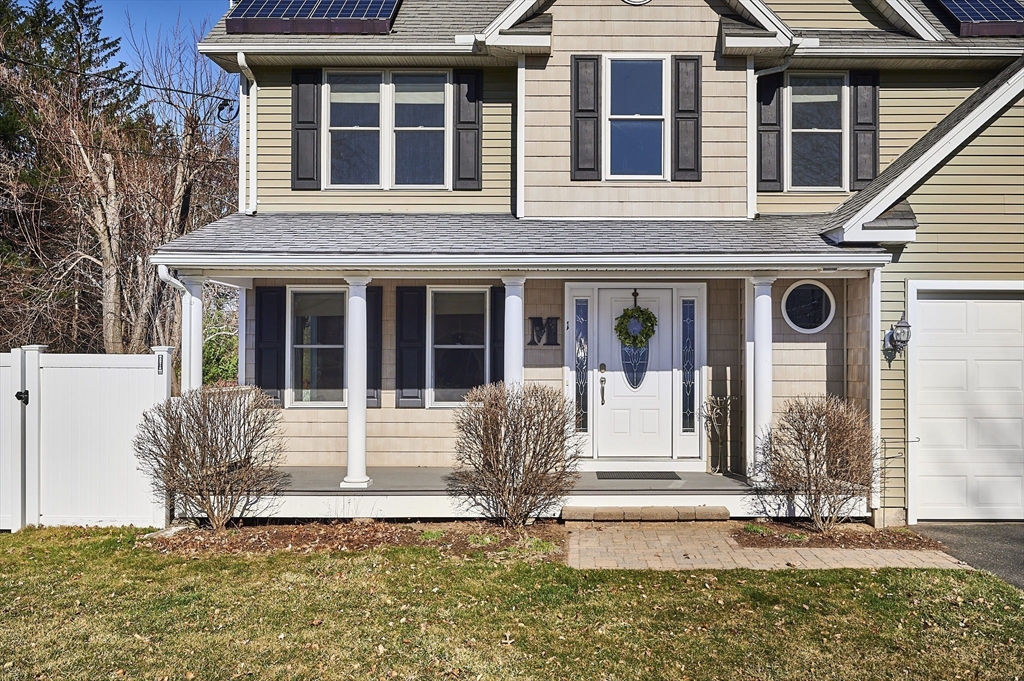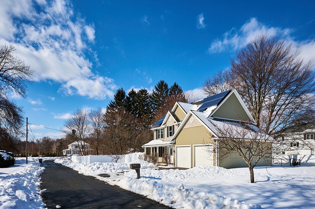 With views of the Mt Tom range, this 2007 Colonial is located within a short distance from the bike trail, hiking trails in the Mt Tom State Reservation and the cultural center of Easthampton. A dramatic two story foyer greets as you enter the front door. The formal dining room could be flex space with a slider to the patio and private fenced yard. This location feels like an oasis with a stream bordering the backyard. The open eat-in kitchen and living room offer great space for entertaining. A wood stove adds cozy warmth and heating. The primary bedroom has a large closet and spacious en-suite bath. Two more bedrooms and a guest bath are upstairs. There is extra storage space in the attic over the garage. The solar panels offset electricity bills. An efficient heat pump heating system was installed in 2023 with WiFi thermostats for a more environmentally friendly home. For an added bonus, there is an ultimate gaming room in the basement with a full wall of closets for storage.