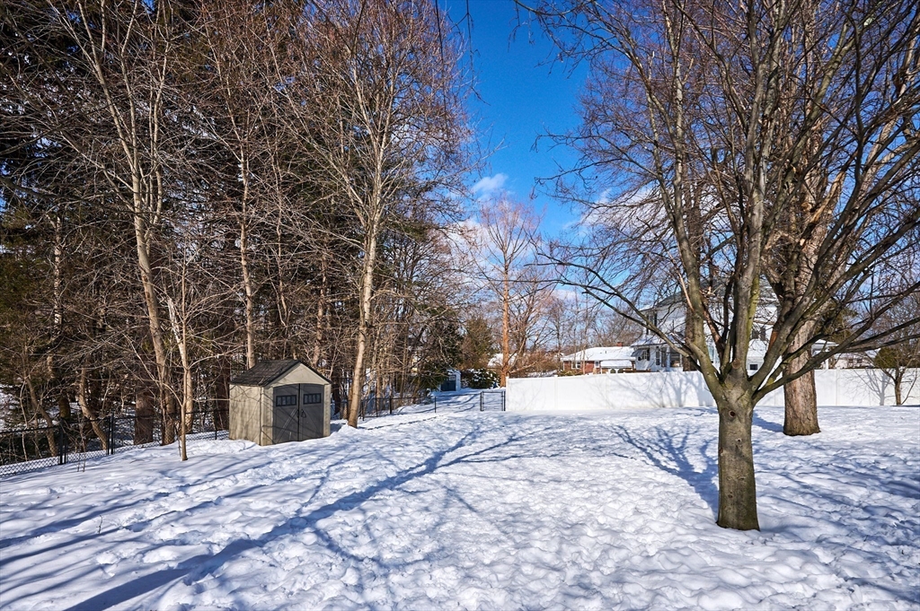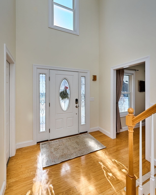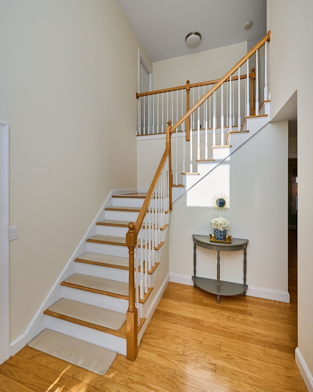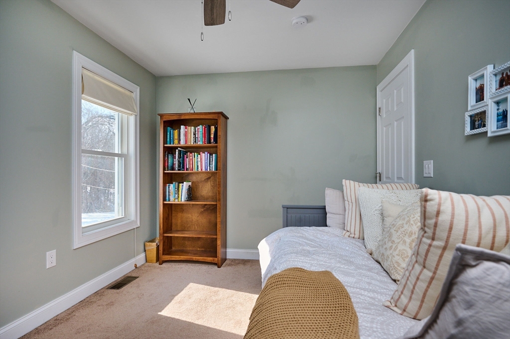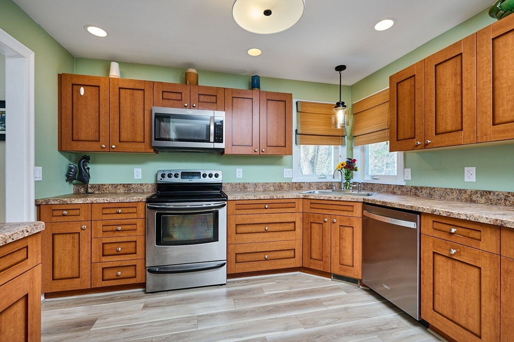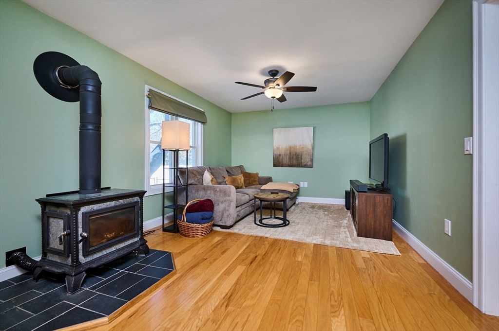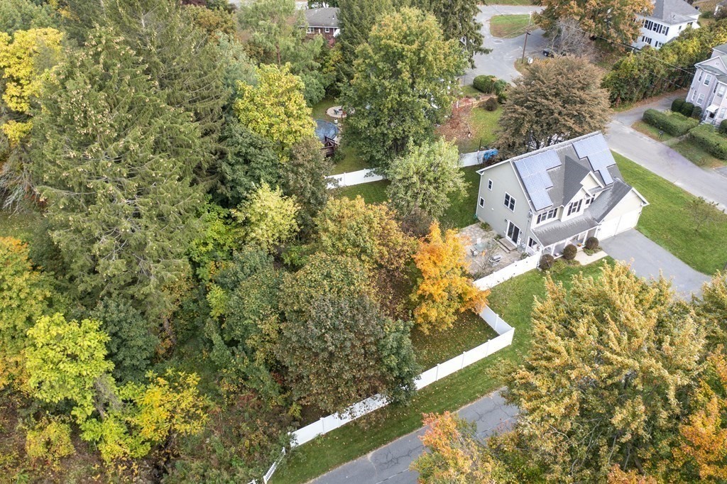 With views of the Mt Tom range, this 2007 Colonial is located within a short distance from the bike trail, hiking trails in the Mt Tom State Reservation and the cultural center of Easthampton. A dramatic two story foyer greets as you enter the front door. The formal dining room could be flex space with a slider to the patio and private fenced yard. This location feels like an oasis with a stream bordering the backyard. The open eat-in kitchen and living room offer great space for entertaining. A wood stove adds cozy warmth and heating. The primary bedroom has a large closet and spacious en-suite bath. Two more bedrooms and a guest bath are upstairs. There is extra storage space in the attic over the garage. The solar panels offset electricity bills. An efficient heat pump heating system was installed in 2023 with WiFi thermostats for a more environmentally friendly home. For an added bonus, there is an ultimate gaming room in the basement with a full wall of closets for storage.